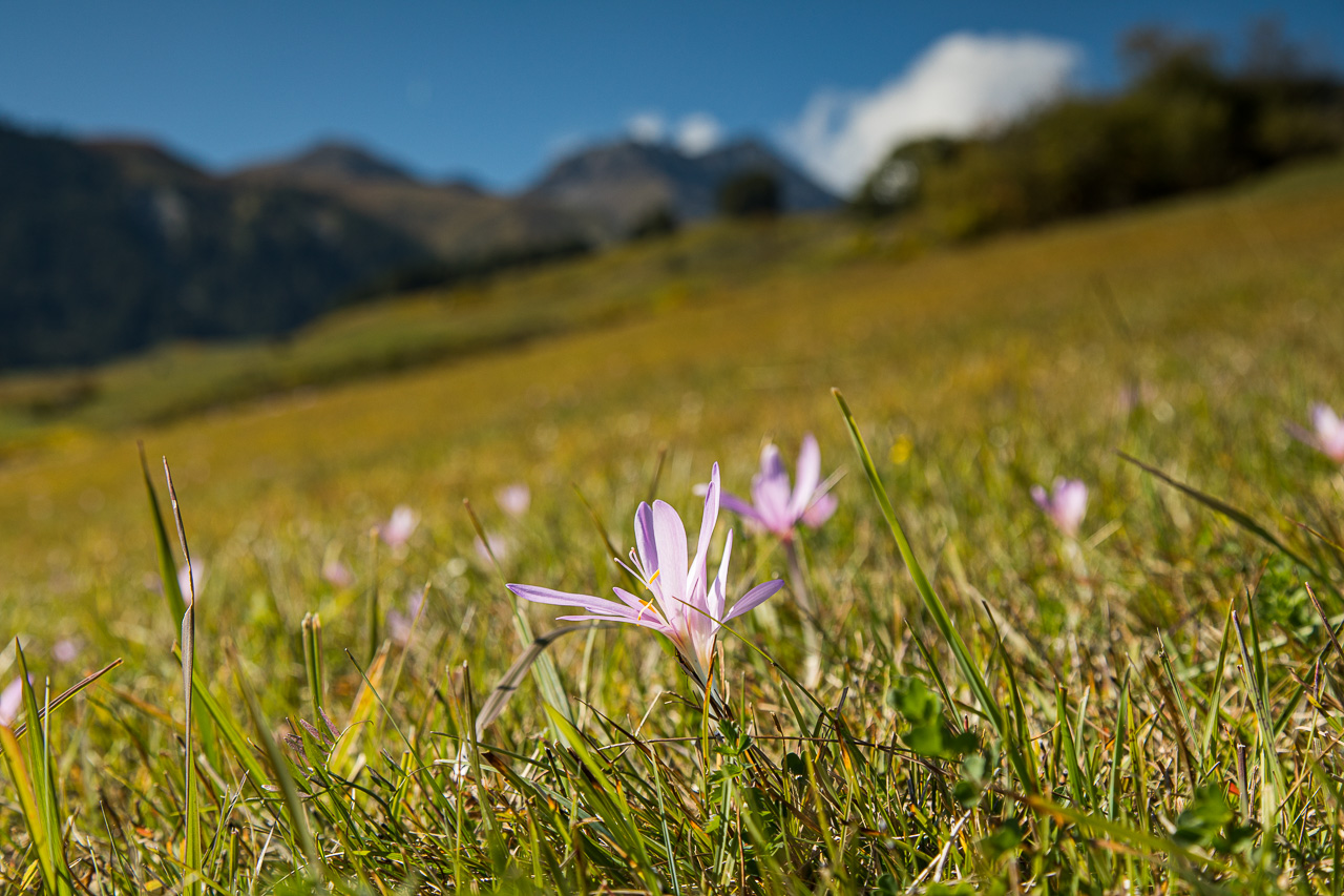 Der Rückweg führt wieder über die Brücke zurück, steigt aber danach leicht an, wir wandern nun eine Etage höher. Den höchsten Punkt der Wanderung markiert eine Jagdhütte. In den Bäumen rund herum zwitschern unzählige Vögel, sehen tun wir aber kaum welche. Wir können aber doch Buchfinken, Grünfinken und Fichtenkreuzschnäbel ausmachen. Auch am Boden ist noch viel Leben, Heuschrecken hüpfen umher wie in meiner Kindheit noch im Rasen. Auch Grillen kriechen noch sehr zahlreich umher. Wir steigen nach Scuol ab, vorbei an Wiesen, die rosa leuchten von den unzähligen Herbstzeitlosen.