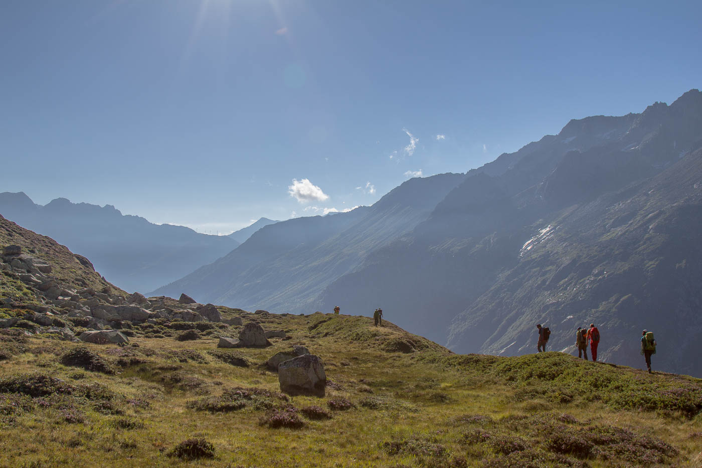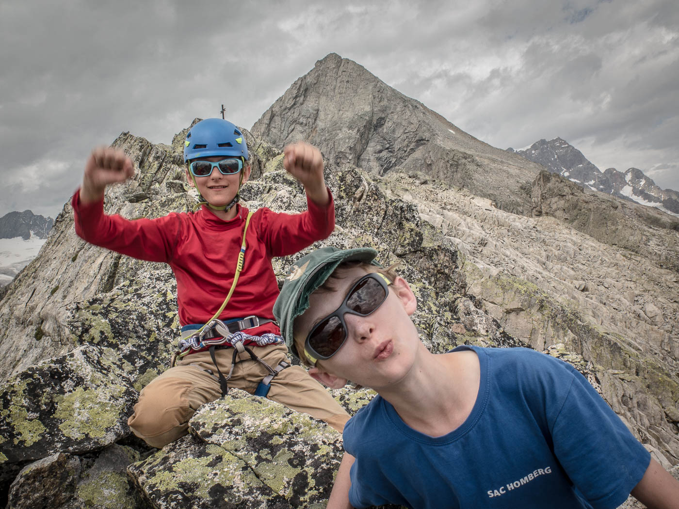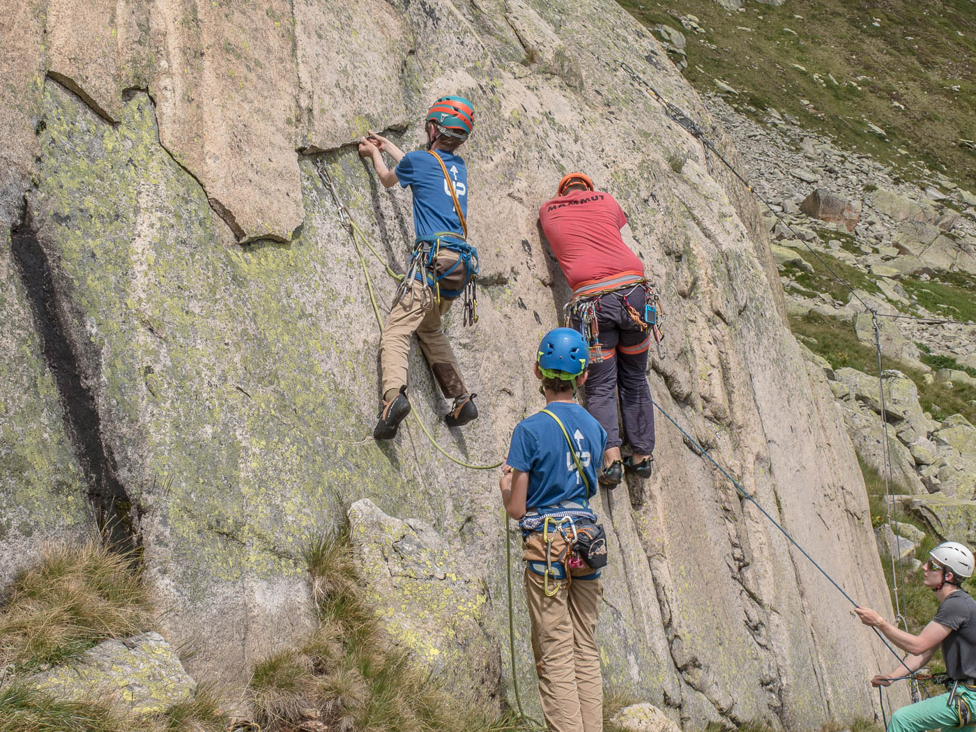 Heute teilen wir uns auf, da wir doch eine grosse Gruppe sind. Das Wetter ist von Anfang an gut, wir können also unsere Pläne umsetzen. Der Plan unserer Gruppe ist, den Grat des Hochschijen zu überklettern, die anderen vergnügen sich in der Kleinen Ostwand. Gemächlich überqueren wir Blockfelder, balancieren von Stein zu Stein. Wir steigen auf den Vorbau des Hochschijen, machen uns bereit zum Klettern. Immer wieder schütteln uns heftige Böen durch. Die Berge rund um den Oberalppass scheinen im Sonnenlicht. Die ersten drei Seillängen sind schöne Granitkletterei, die dann übergeht in einen klassischen alpinen Grat, inklusive Abseilstelle, wo es rund 15 Meter abwärts geht, nur damit man auf der anderen Seite umso steiler wieder hochklettert. Was von weitem extrem aussieht, entpuppt sich aus der Nähe als schöne Wandkletterei.