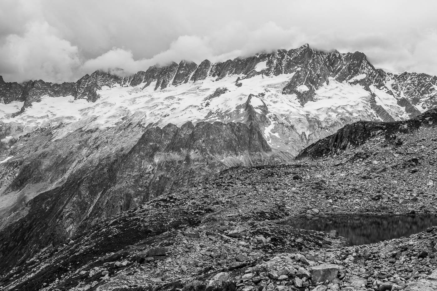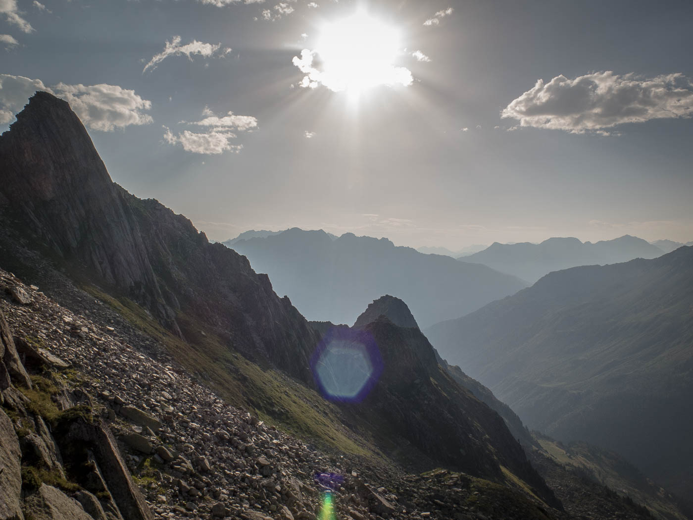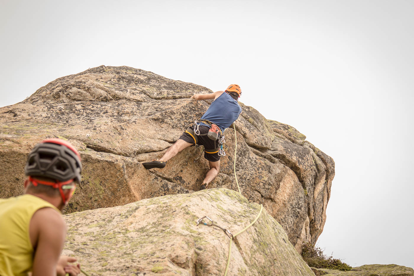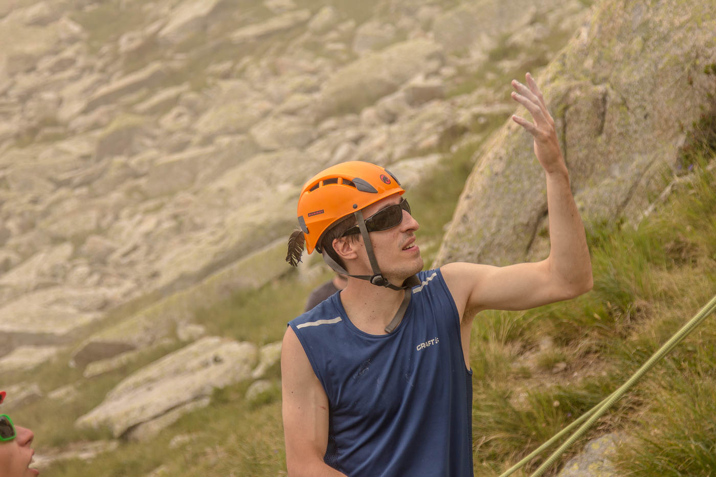 Heute teilen wir uns auf, da wir doch eine grosse Gruppe sind. Das Wetter ist von Anfang an gut, wir können also unsere Pläne umsetzen. Der Plan unserer Gruppe ist, den Grat des Hochschijen zu überklettern, die anderen vergnügen sich in der Kleinen Ostwand. Gemächlich überqueren wir Blockfelder, balancieren von Stein zu Stein. Wir steigen auf den Vorbau des Hochschijen, machen uns bereit zum Klettern. Immer wieder schütteln uns heftige Böen durch. Die Berge rund um den Oberalppass scheinen im Sonnenlicht. Die ersten drei Seillängen sind schöne Granitkletterei, die dann übergeht in einen klassischen alpinen Grat, inklusive Abseilstelle, wo es rund 15 Meter abwärts geht, nur damit man auf der anderen Seite umso steiler wieder hochklettert. Was von weitem extrem aussieht, entpuppt sich aus der Nähe als schöne Wandkletterei.