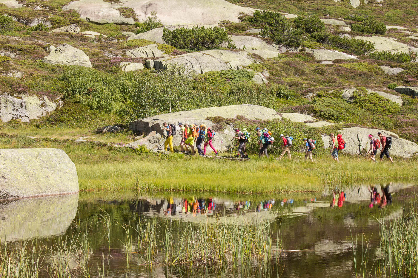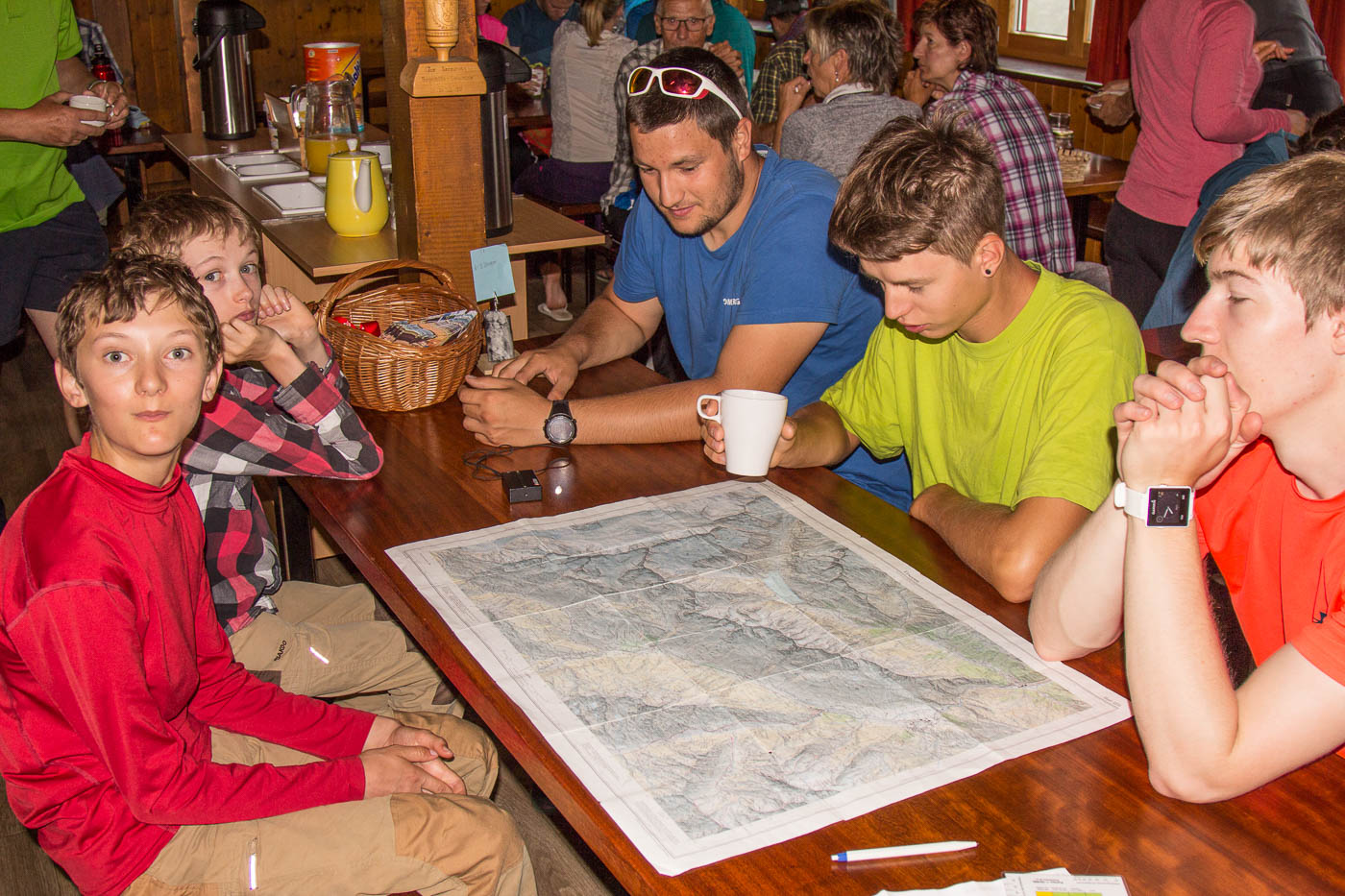 Beim Morgenessen regnet es. Wir planen um, Kartenkunde wird auf das Programm genommen. Zum Abschluss gibt es eine kleine Einführung in GPS. Die Sonne scheint. Wir steigen ab zum Klettergarten unterhalb der Hütte. Endlich beim Einstieg angekommen – beginnt es zu regnen! Wieder Aufstieg zur Hütte, Zeit vertreiben. Der zweite Versuch klappt dann, wir klettern verschiedene Routen in den Schwierigkeitsgraden bis 6a+. Ein Teil hat am Nachmittag mal genug und geht zur Hütte zurück, um das Badezeug zu holen. Ein erfrischender Schwumm im kalten Bergsee tut gut.