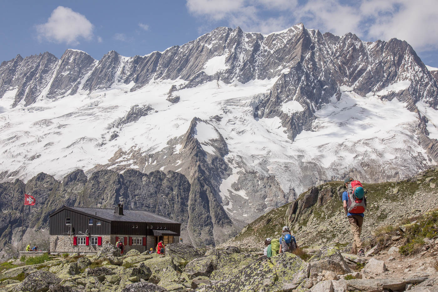 Zuhinterst auf der Göscheneralp beginnt der Aufstieg zur Bergseehütte. Sie liegt auf 2370 Meter und ist in zwei Stunden erreichbar, 600 Höhenmeter sind zu bewältigen. Mit einer Pause erreichen wir die Hütte bald. Nach einer weiteren Pause machen wir uns auf zum Kletterlernpfad, der einen einfachen Einstieg in das alpine Klettern ermöglicht. Unter den strengen Augen von Bergführer Thomas schaffen wir jedoch nur zwei Seillängen, dann beginnt es zu regnen. Über den Gipfeln erheben sich schwarze Wolken, Donner grollt. Ein klares Zeichen, den Rückzug anzutreten. So schnell kann das Wetter ändern in den Bergen.