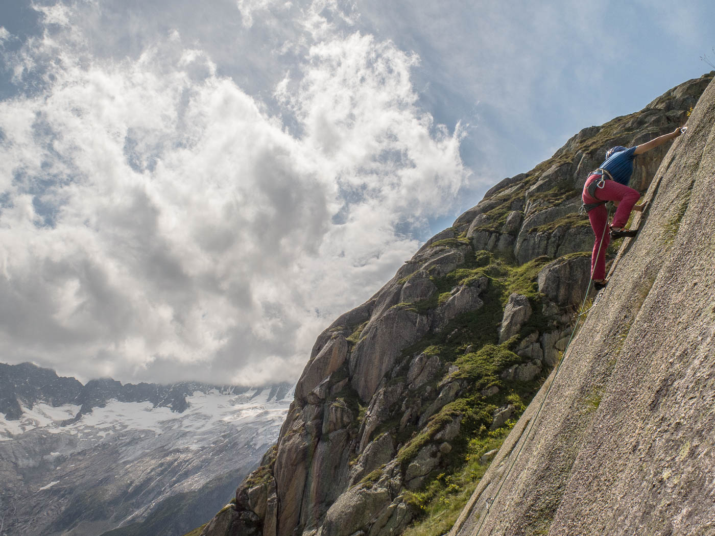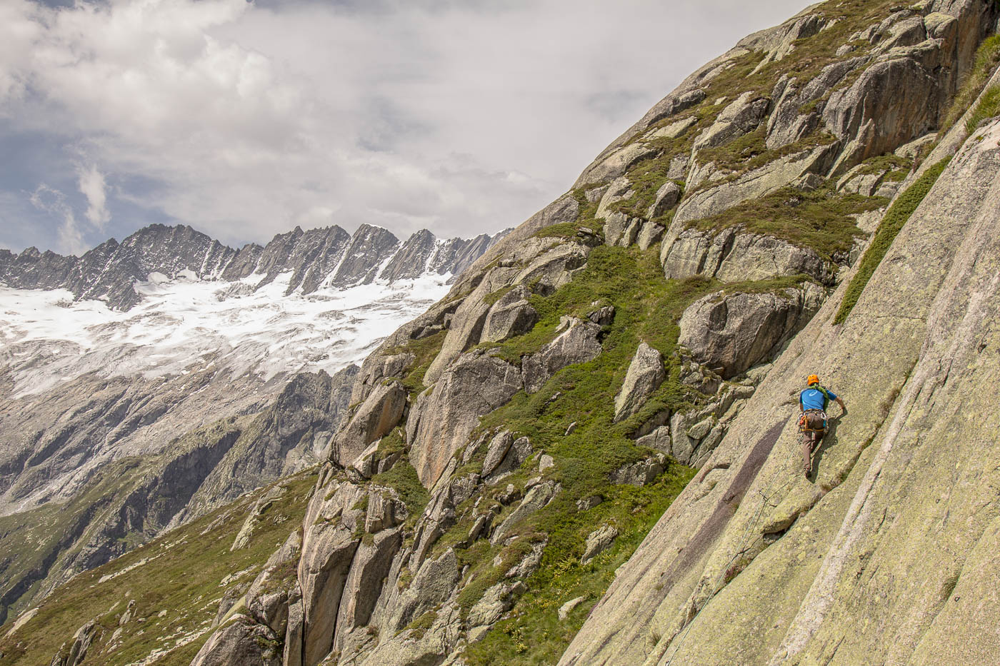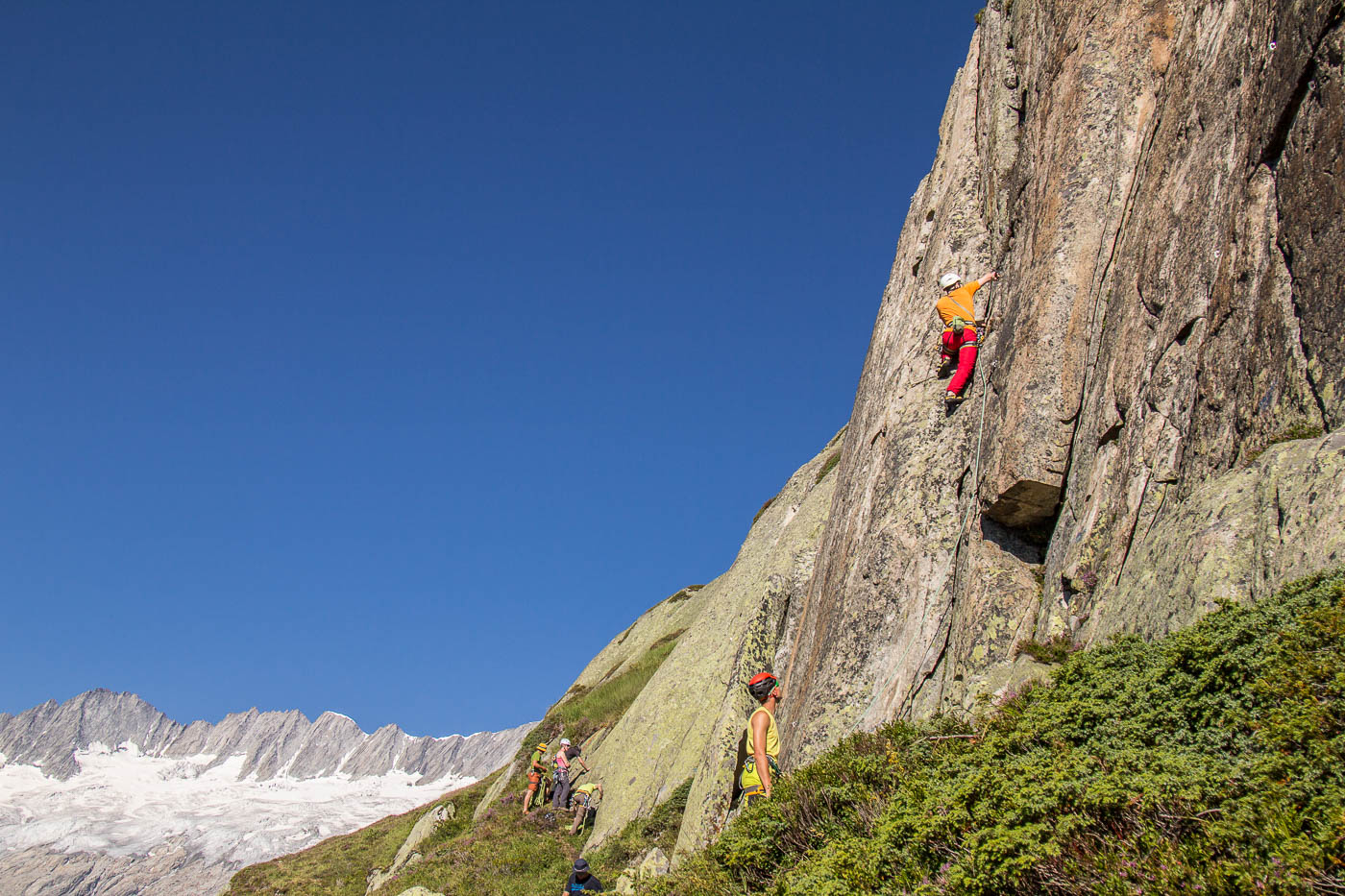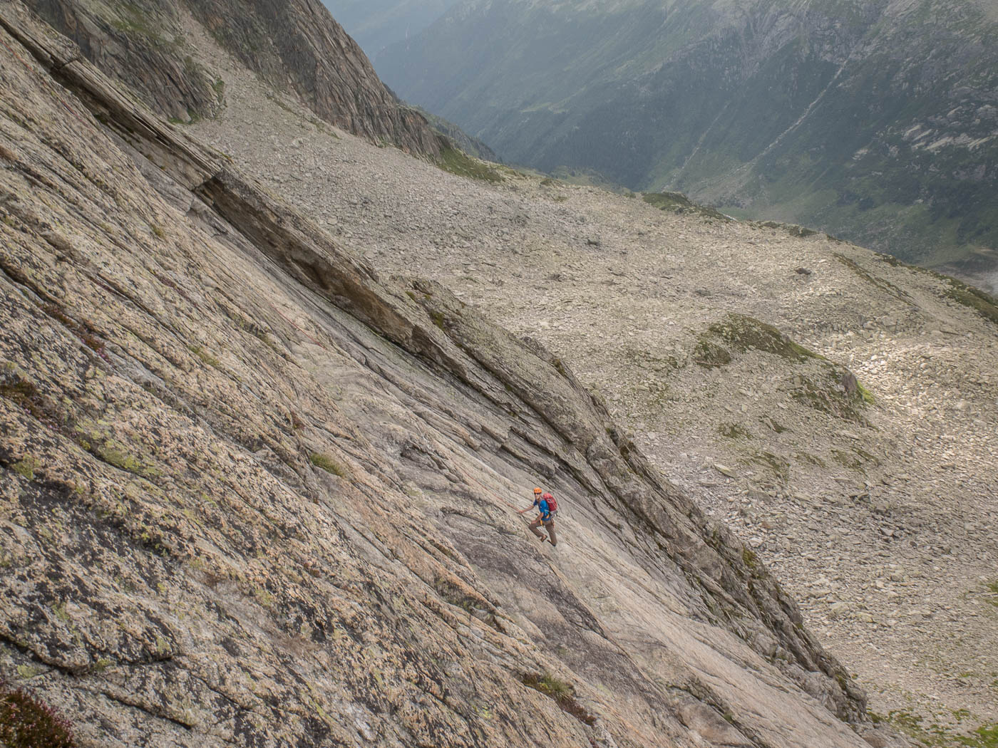 Von der Hütte aus blickt man ständig an ihn hinauf: Den Bergseeschijen. Eine gewaltige Südwand hält den Blick gefangen. Und genau da wollen wir hinauf. Zwölf Kletterer steigen am Morgen nach Sonnenaufgang hoch zum Einstieg und verteilen sich auf vier verschiedene Routen in unterschiedlichen Schwierigkeitsgraden. Die erste Seillänge stellt mich gleich auf die Prüfung. Mit 4b ist sie zwar nicht schwer, aber so Stellen auf reine Reibung ohne Griffe sind nicht so mein Ding. Zumindest bin ich nun wach. Die nächsten Seillängen gehen flott voran, abwechslungsreiche Kletterei erfreut das Klettererherz.