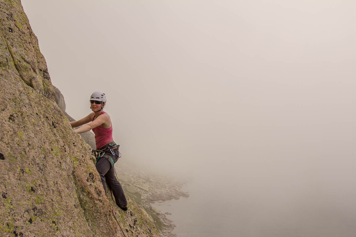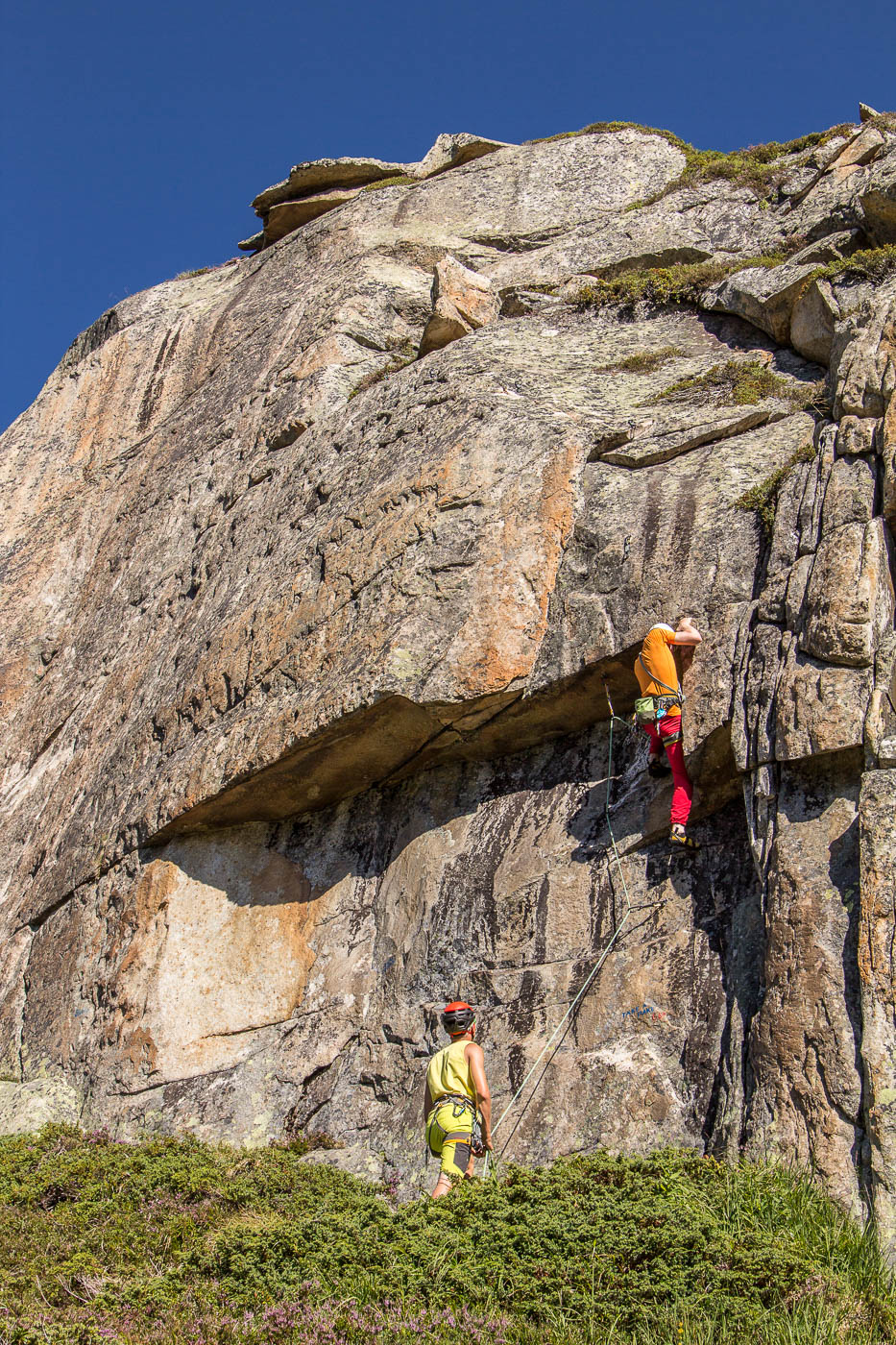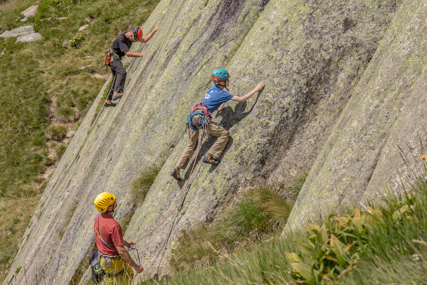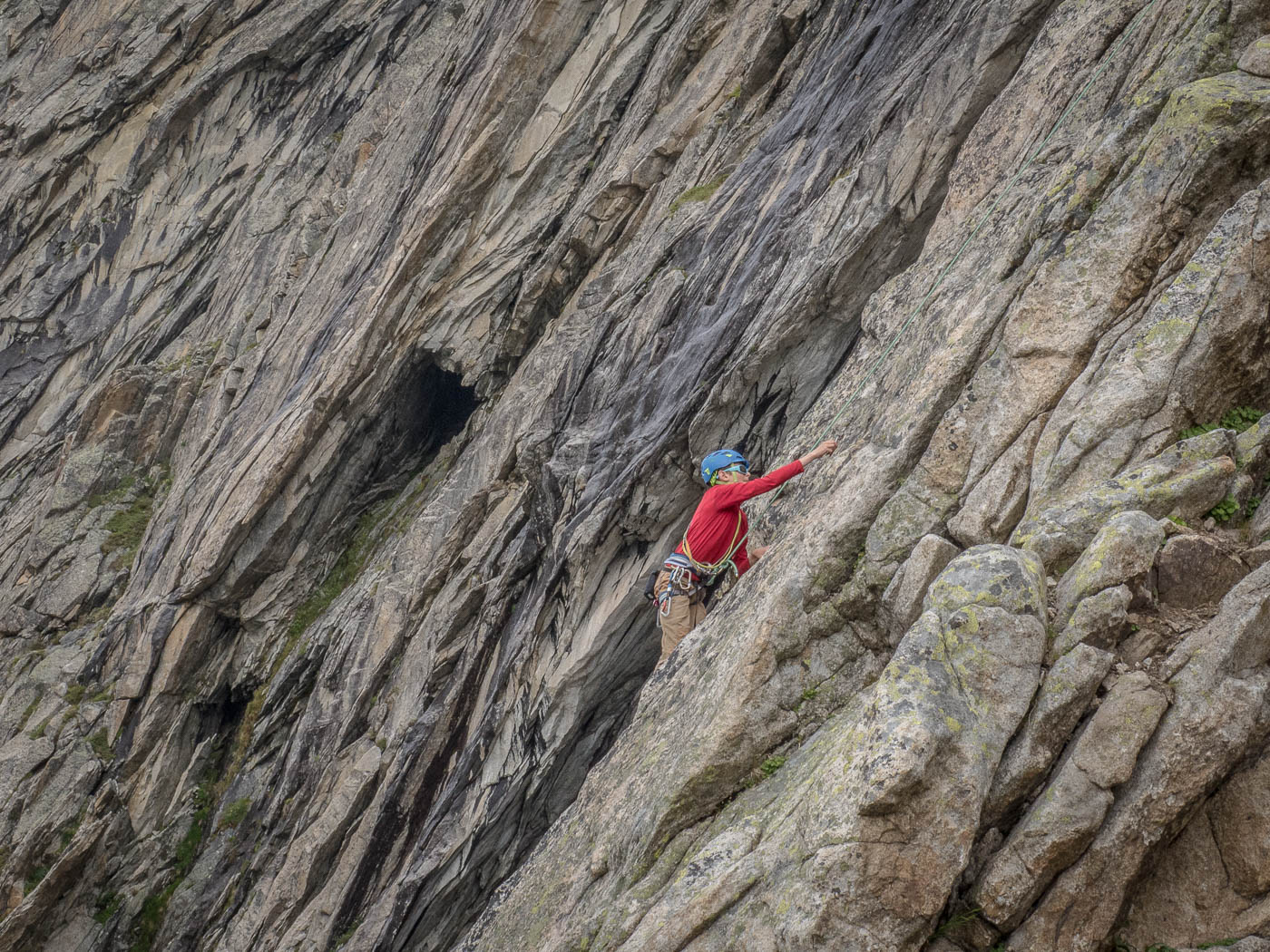 Von der Hütte aus blickt man ständig an ihn hinauf: Den Bergseeschijen. Eine gewaltige Südwand hält den Blick gefangen. Und genau da wollen wir hinauf. Zwölf Kletterer steigen am Morgen nach Sonnenaufgang hoch zum Einstieg und verteilen sich auf vier verschiedene Routen in unterschiedlichen Schwierigkeitsgraden. Die erste Seillänge stellt mich gleich auf die Prüfung. Mit 4b ist sie zwar nicht schwer, aber so Stellen auf reine Reibung ohne Griffe sind nicht so mein Ding. Zumindest bin ich nun wach. Die nächsten Seillängen gehen flott voran, abwechslungsreiche Kletterei erfreut das Klettererherz.