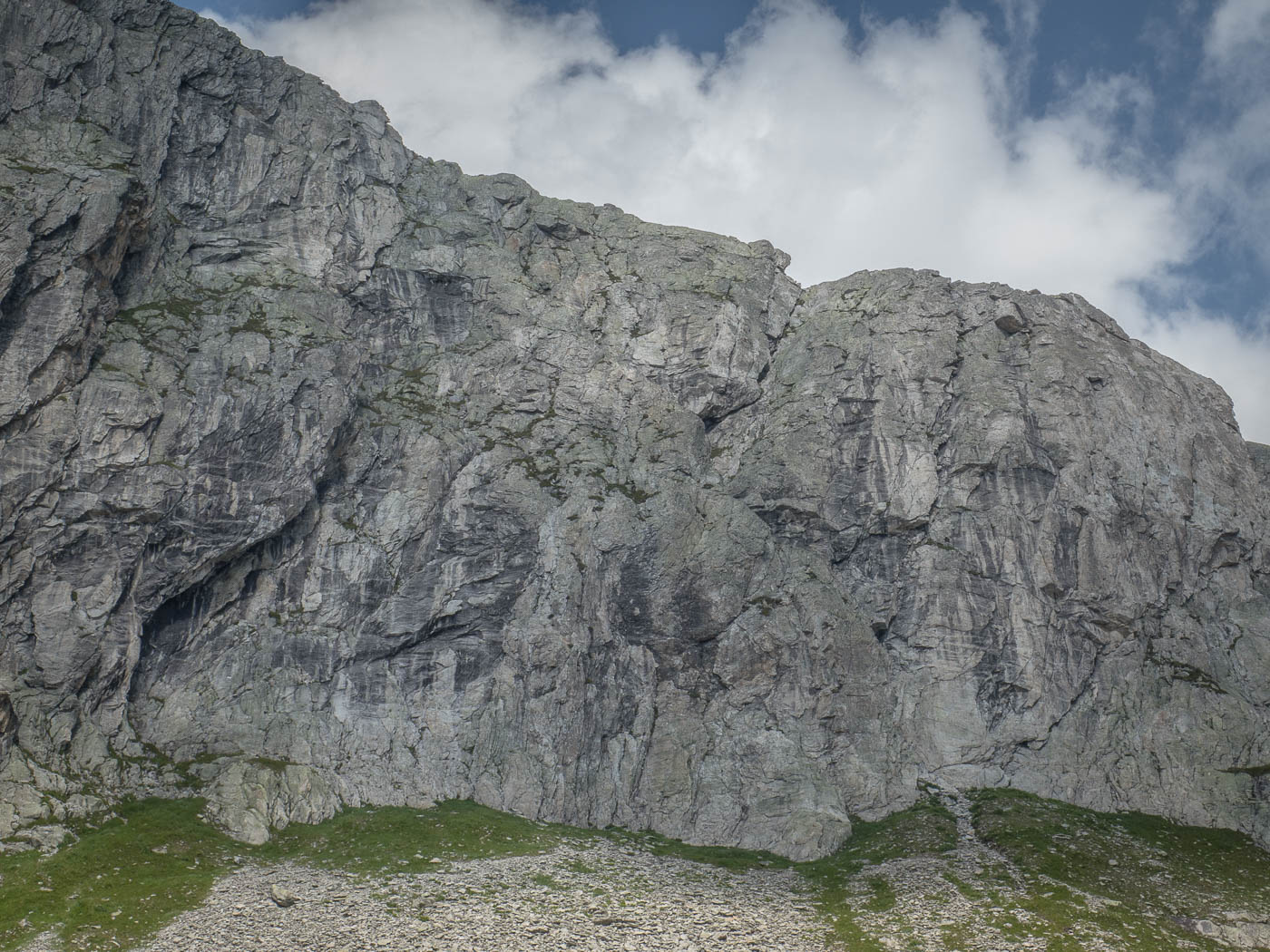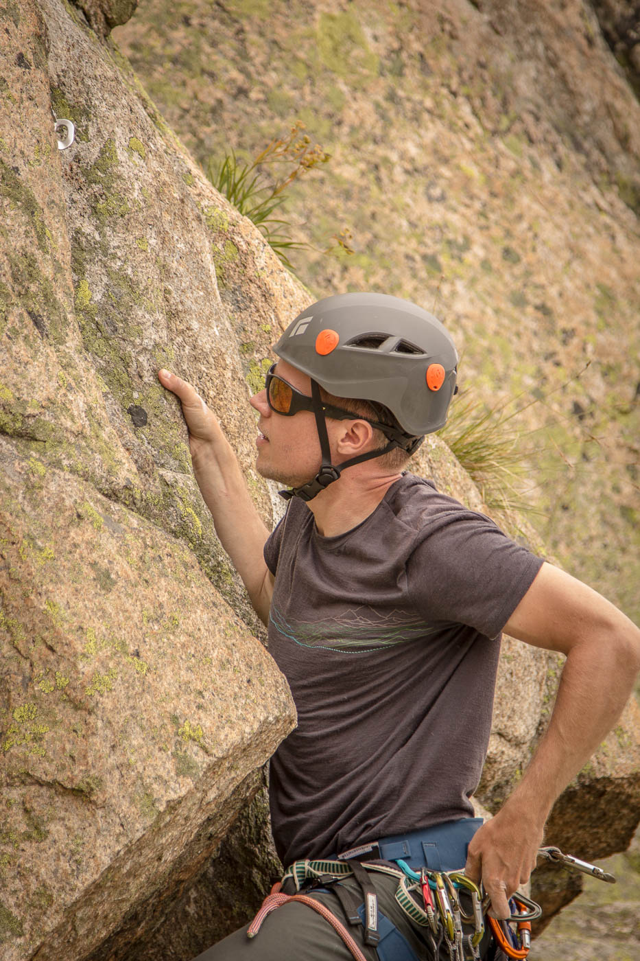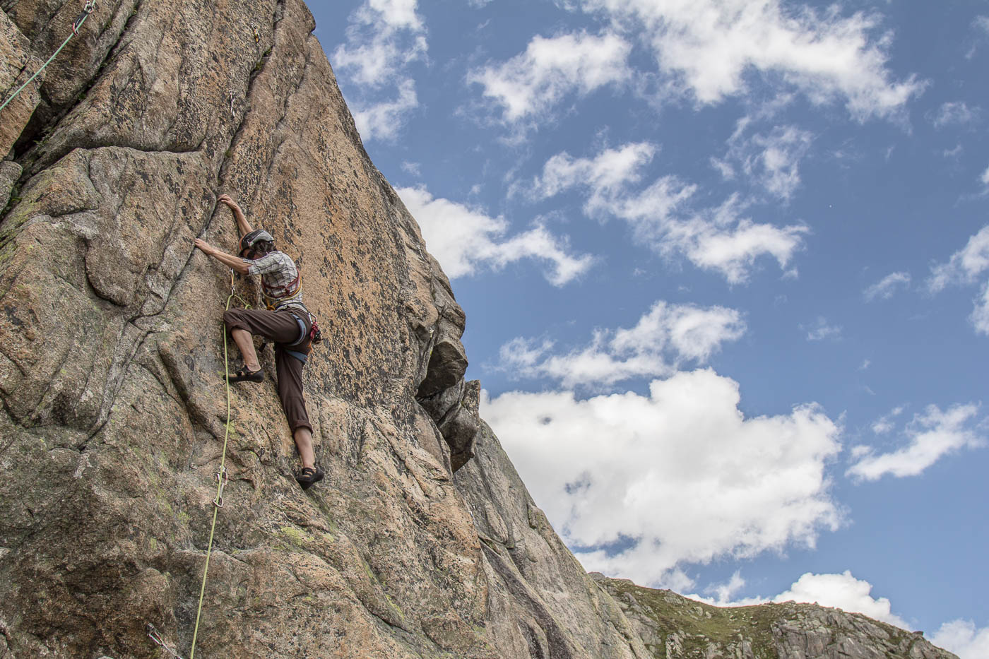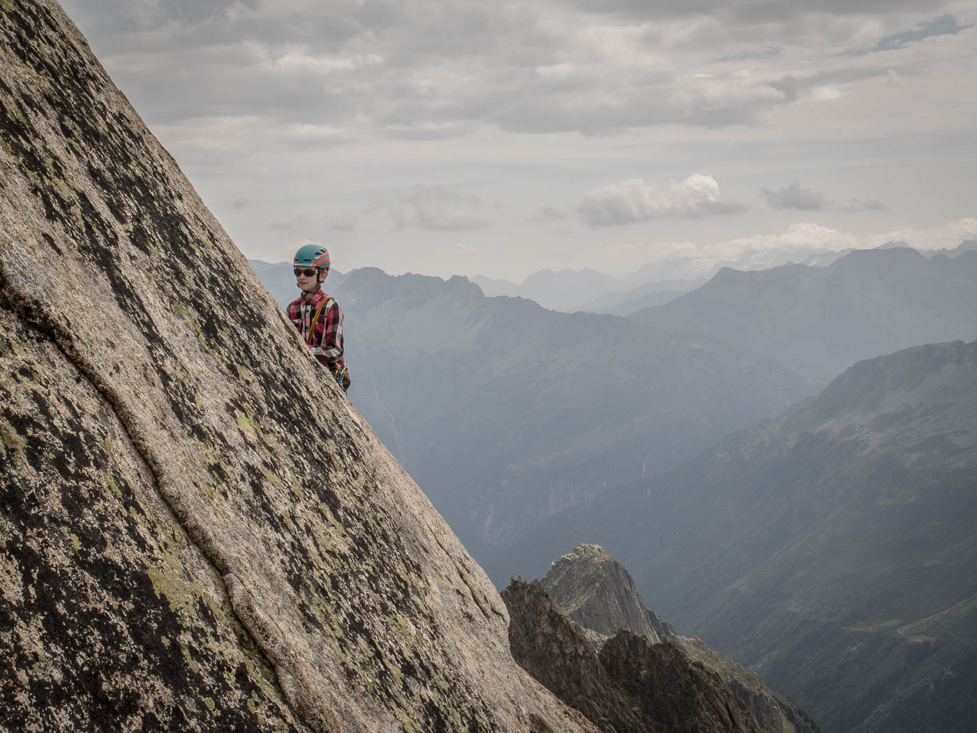 Von der Hütte aus blickt man ständig an ihn hinauf: Den Bergseeschijen. Eine gewaltige Südwand hält den Blick gefangen. Und genau da wollen wir hinauf. Zwölf Kletterer steigen am Morgen nach Sonnenaufgang hoch zum Einstieg und verteilen sich auf vier verschiedene Routen in unterschiedlichen Schwierigkeitsgraden. Die erste Seillänge stellt mich gleich auf die Prüfung. Mit 4b ist sie zwar nicht schwer, aber so Stellen auf reine Reibung ohne Griffe sind nicht so mein Ding. Zumindest bin ich nun wach. Die nächsten Seillängen gehen flott voran, abwechslungsreiche Kletterei erfreut das Klettererherz.