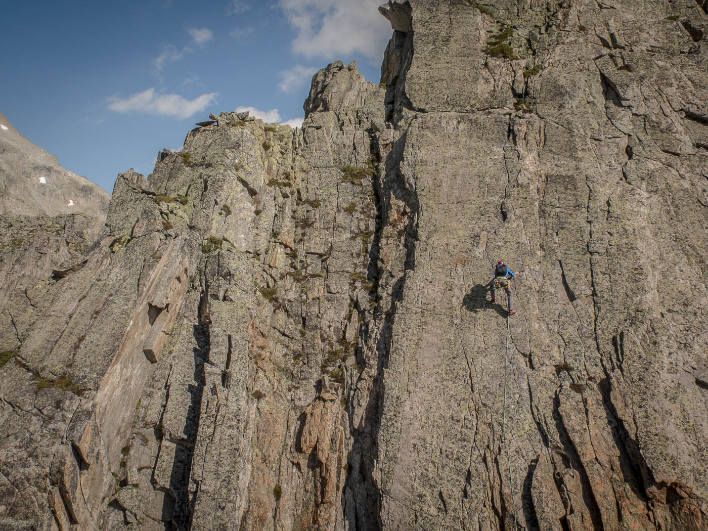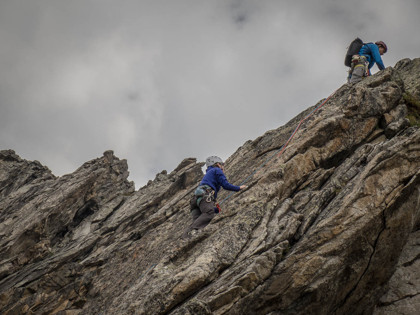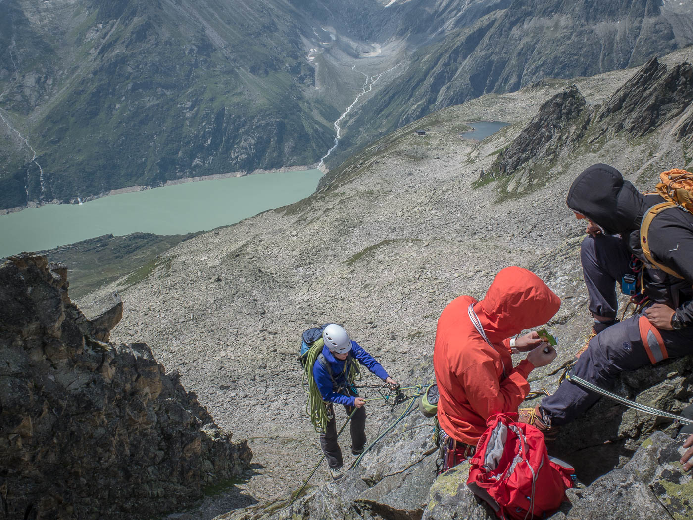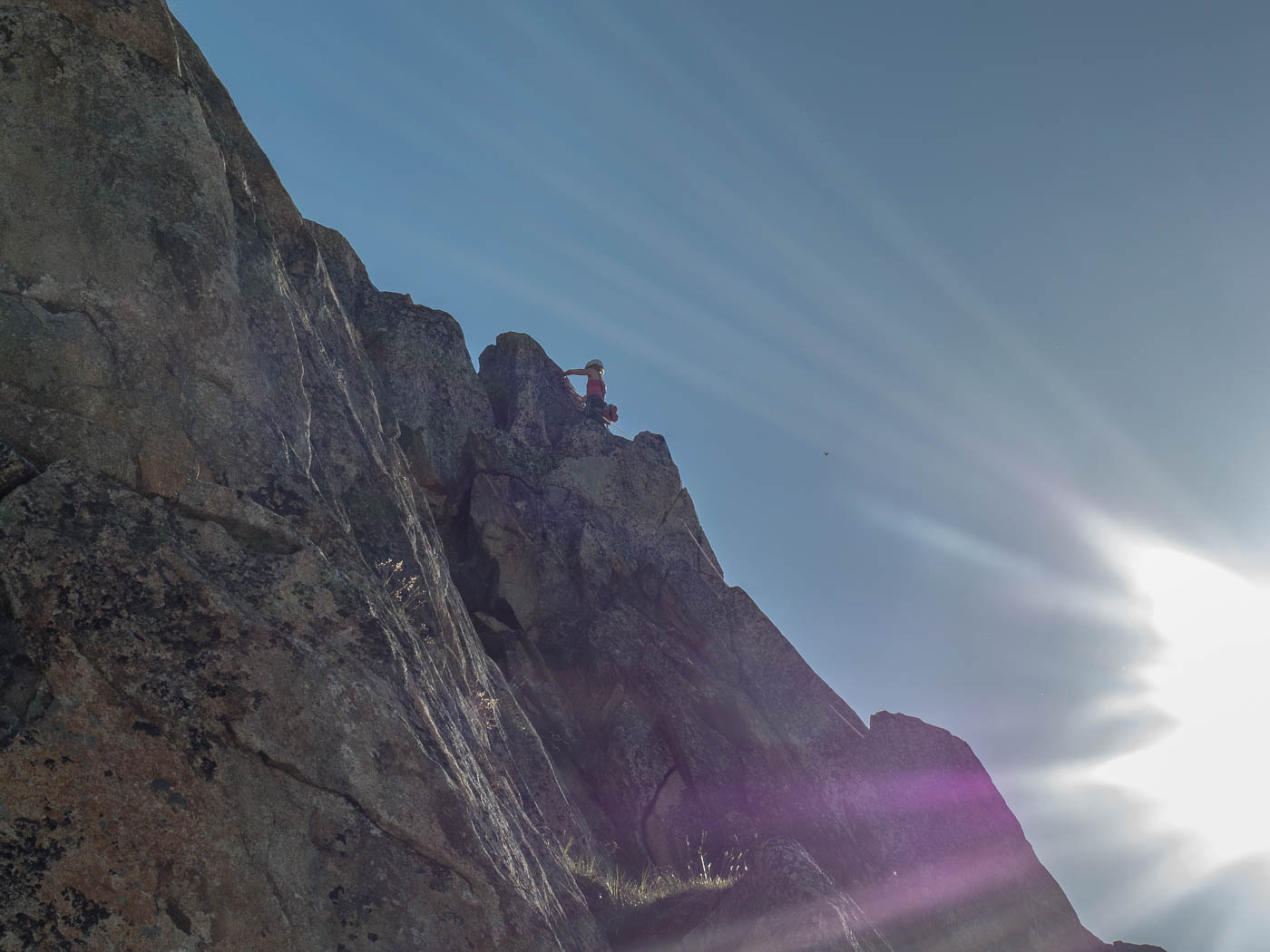 Nochmals eine kurze Gratkletterei, dann wartet die letzte Seillänge auf den Gipfel. Auf diesem verweilen wir nicht allzu lange, es hat nicht viel Platz und es windet immer noch heftig. Also seilen wir die zehn Meter ab, danach nochmals 50 Meter, allerdings mit zwei Seilen. Für einzelne Seilschaften mit 50-Meter-Seil sind drei Stände eingerichtet, so dass man zweimal 20 Meter und einmal 10 Meter abseilen kann. Der Abstieg durch die Rinne erfordert nochmals unsere Aufmerksamkeit, bevor es über die Blöcke wieder zurück zur Hütte geht.