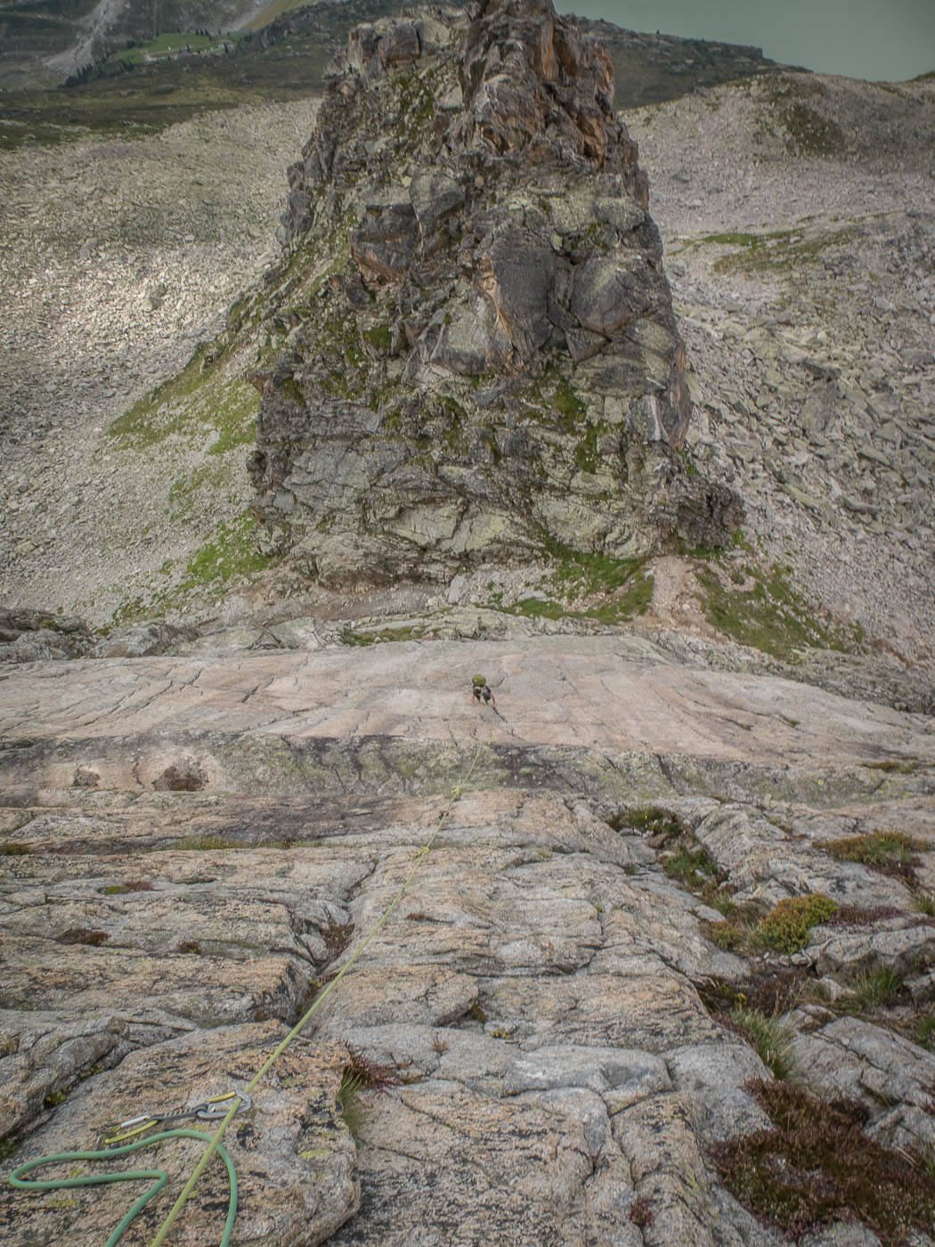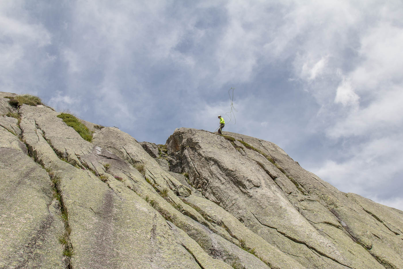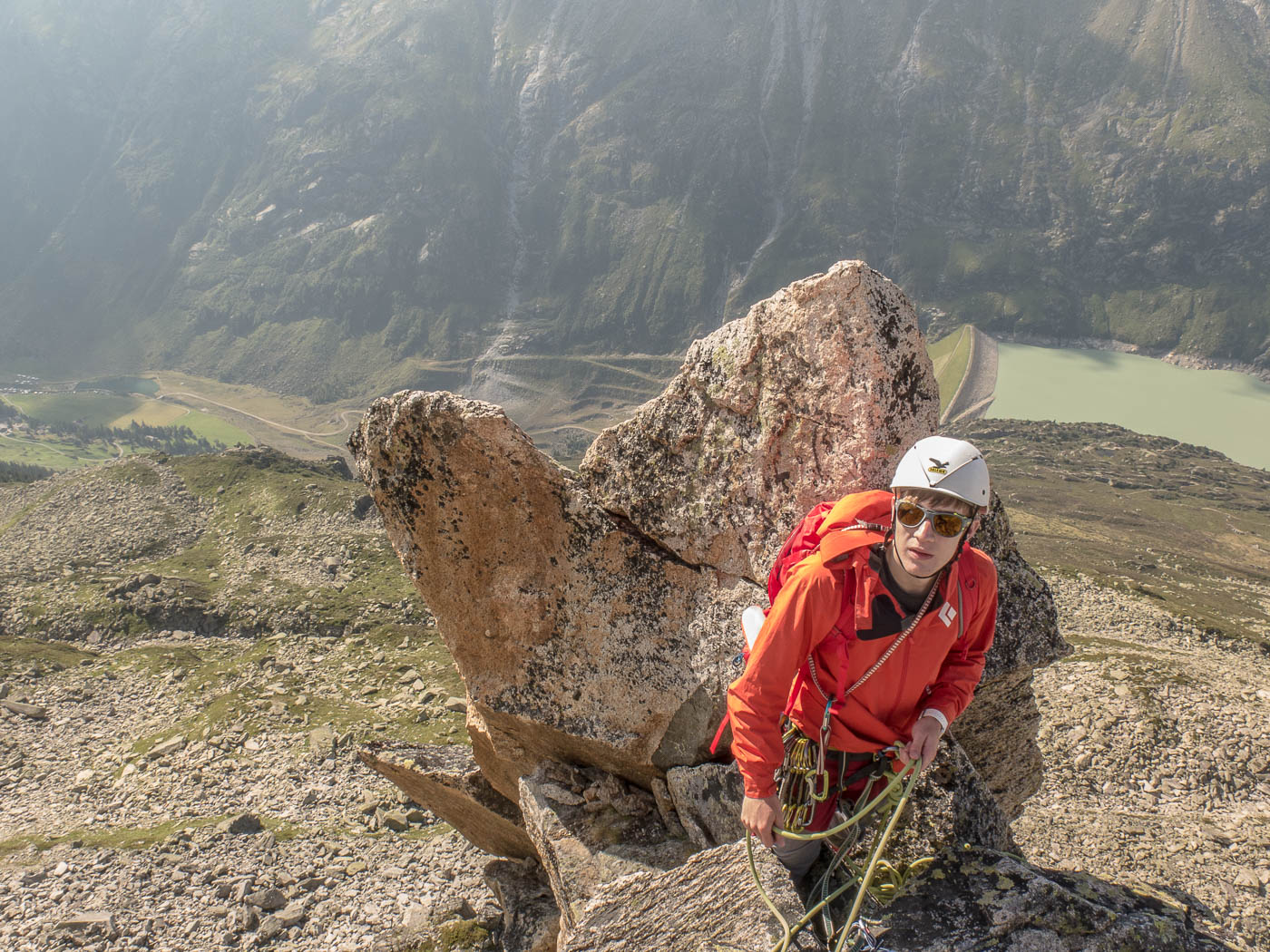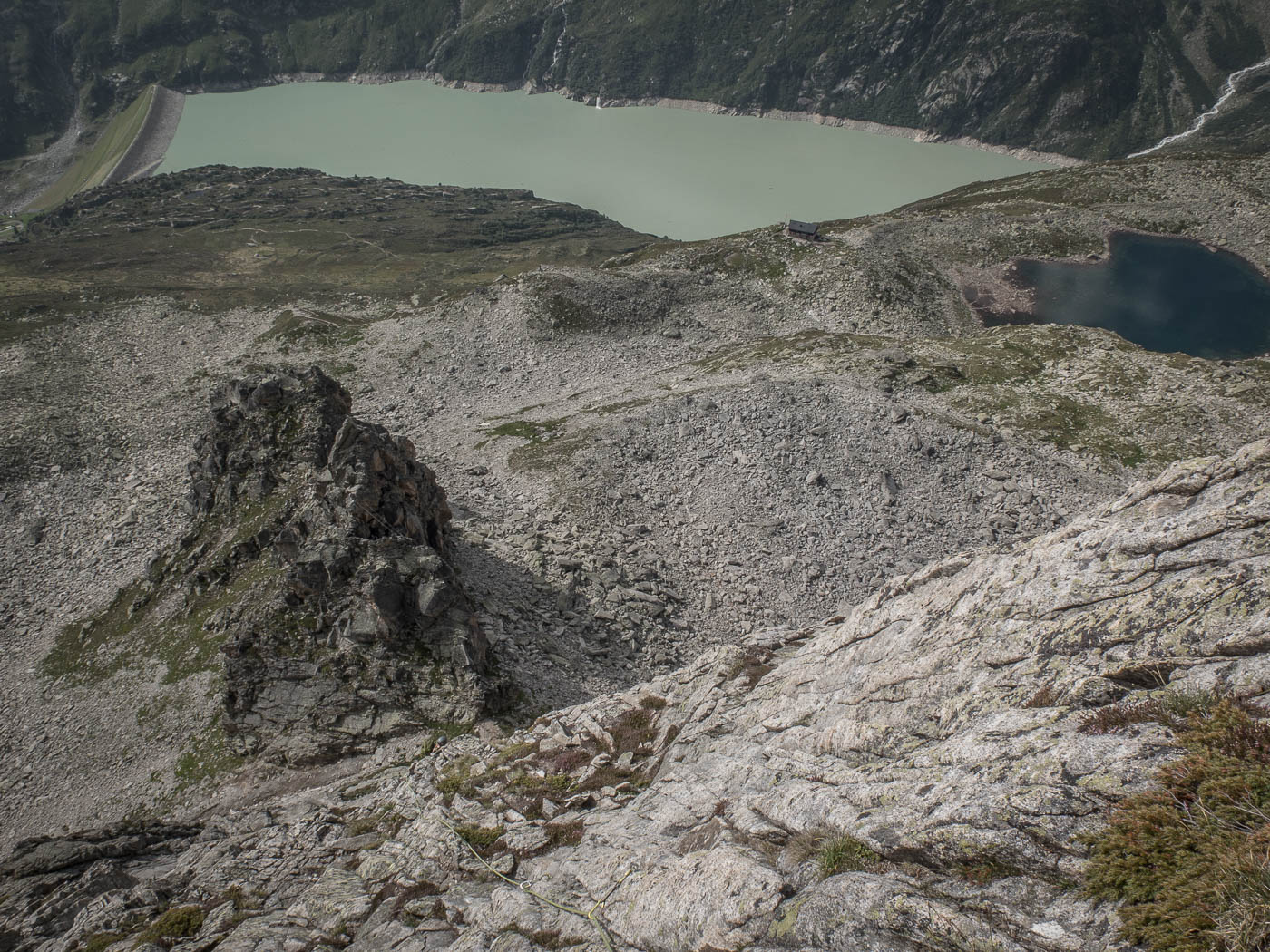 Nochmals eine kurze Gratkletterei, dann wartet die letzte Seillänge auf den Gipfel. Auf diesem verweilen wir nicht allzu lange, es hat nicht viel Platz und es windet immer noch heftig. Also seilen wir die zehn Meter ab, danach nochmals 50 Meter, allerdings mit zwei Seilen. Für einzelne Seilschaften mit 50-Meter-Seil sind drei Stände eingerichtet, so dass man zweimal 20 Meter und einmal 10 Meter abseilen kann. Der Abstieg durch die Rinne erfordert nochmals unsere Aufmerksamkeit, bevor es über die Blöcke wieder zurück zur Hütte geht.