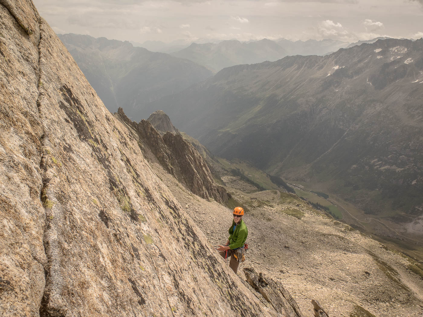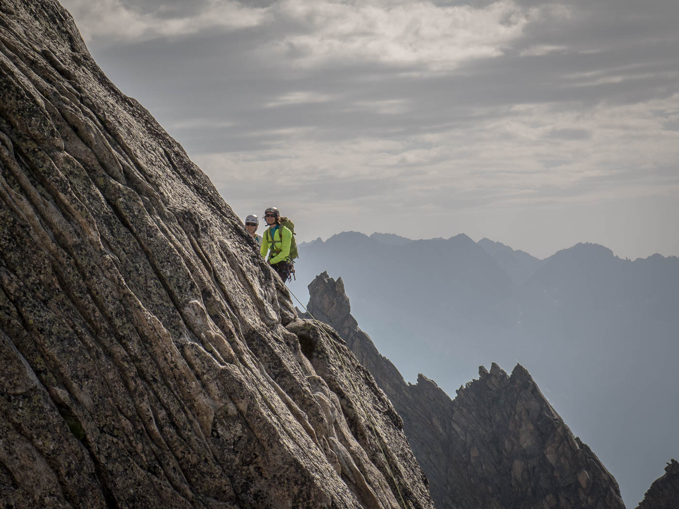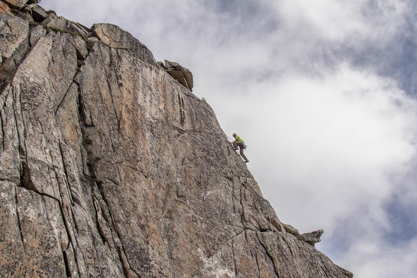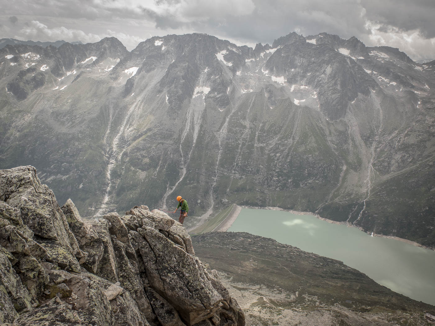 Nochmals eine kurze Gratkletterei, dann wartet die letzte Seillänge auf den Gipfel. Auf diesem verweilen wir nicht allzu lange, es hat nicht viel Platz und es windet immer noch heftig. Also seilen wir die zehn Meter ab, danach nochmals 50 Meter, allerdings mit zwei Seilen. Für einzelne Seilschaften mit 50-Meter-Seil sind drei Stände eingerichtet, so dass man zweimal 20 Meter und einmal 10 Meter abseilen kann. Der Abstieg durch die Rinne erfordert nochmals unsere Aufmerksamkeit, bevor es über die Blöcke wieder zurück zur Hütte geht.