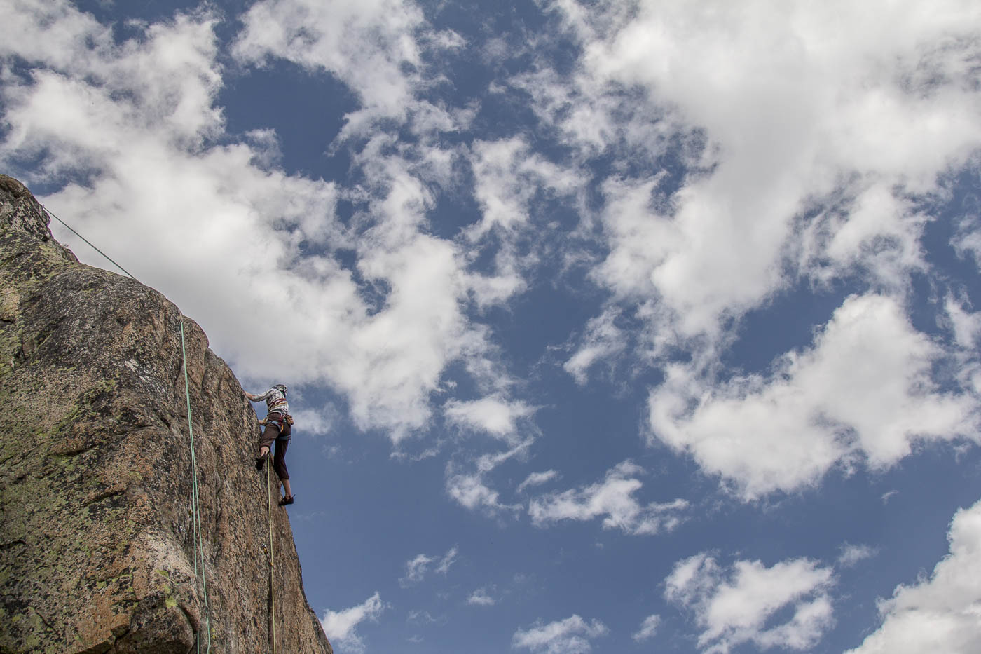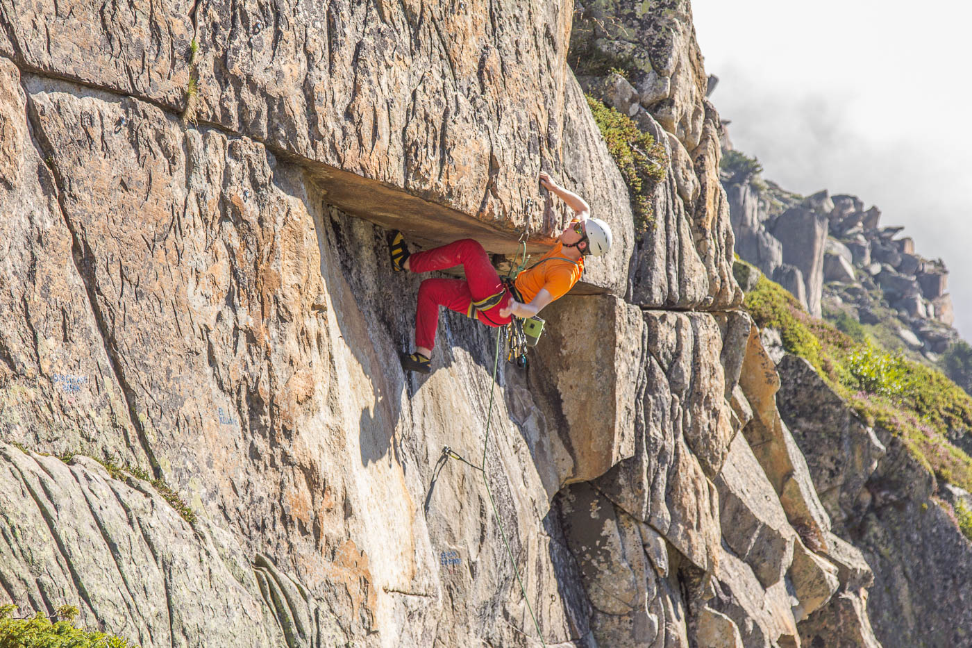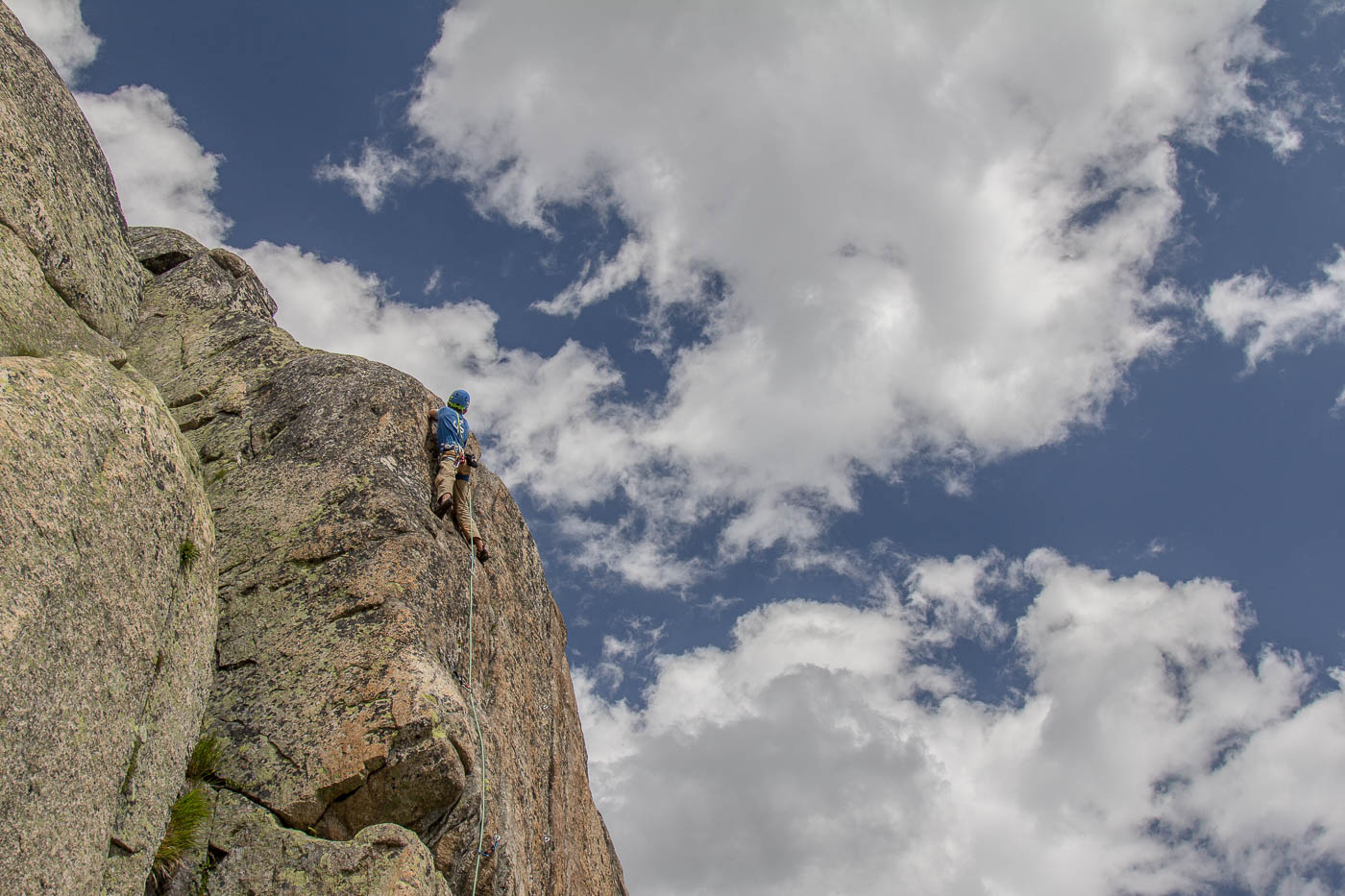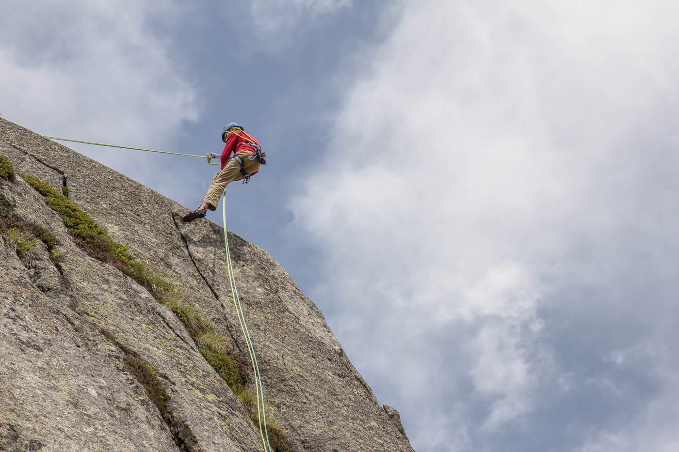 Nochmals eine kurze Gratkletterei, dann wartet die letzte Seillänge auf den Gipfel. Auf diesem verweilen wir nicht allzu lange, es hat nicht viel Platz und es windet immer noch heftig. Also seilen wir die zehn Meter ab, danach nochmals 50 Meter, allerdings mit zwei Seilen. Für einzelne Seilschaften mit 50-Meter-Seil sind drei Stände eingerichtet, so dass man zweimal 20 Meter und einmal 10 Meter abseilen kann. Der Abstieg durch die Rinne erfordert nochmals unsere Aufmerksamkeit, bevor es über die Blöcke wieder zurück zur Hütte geht.