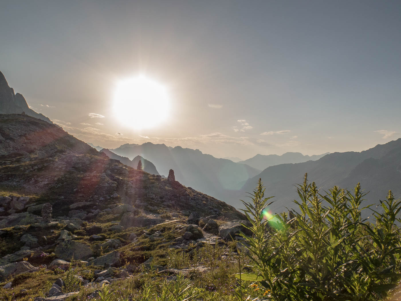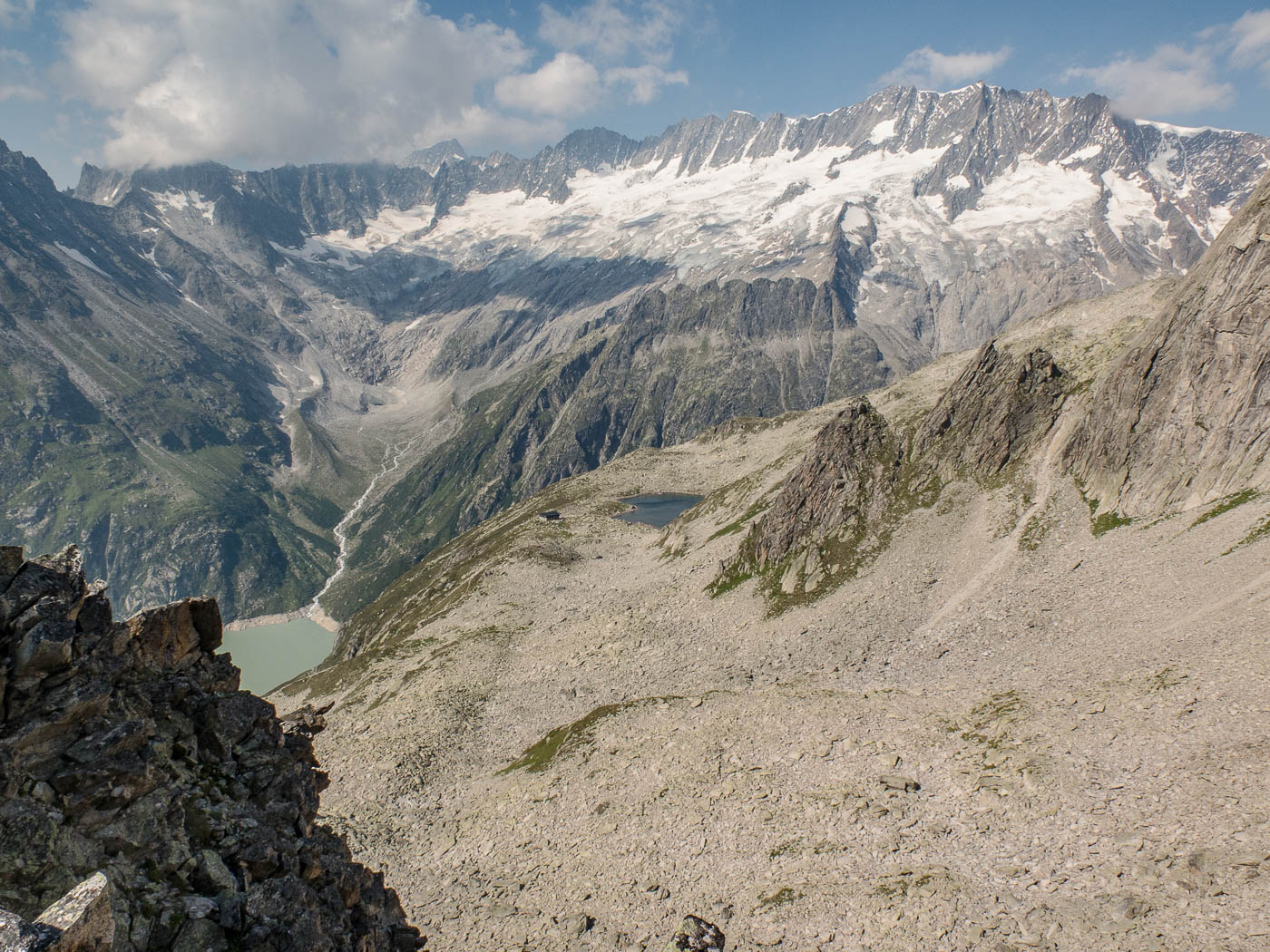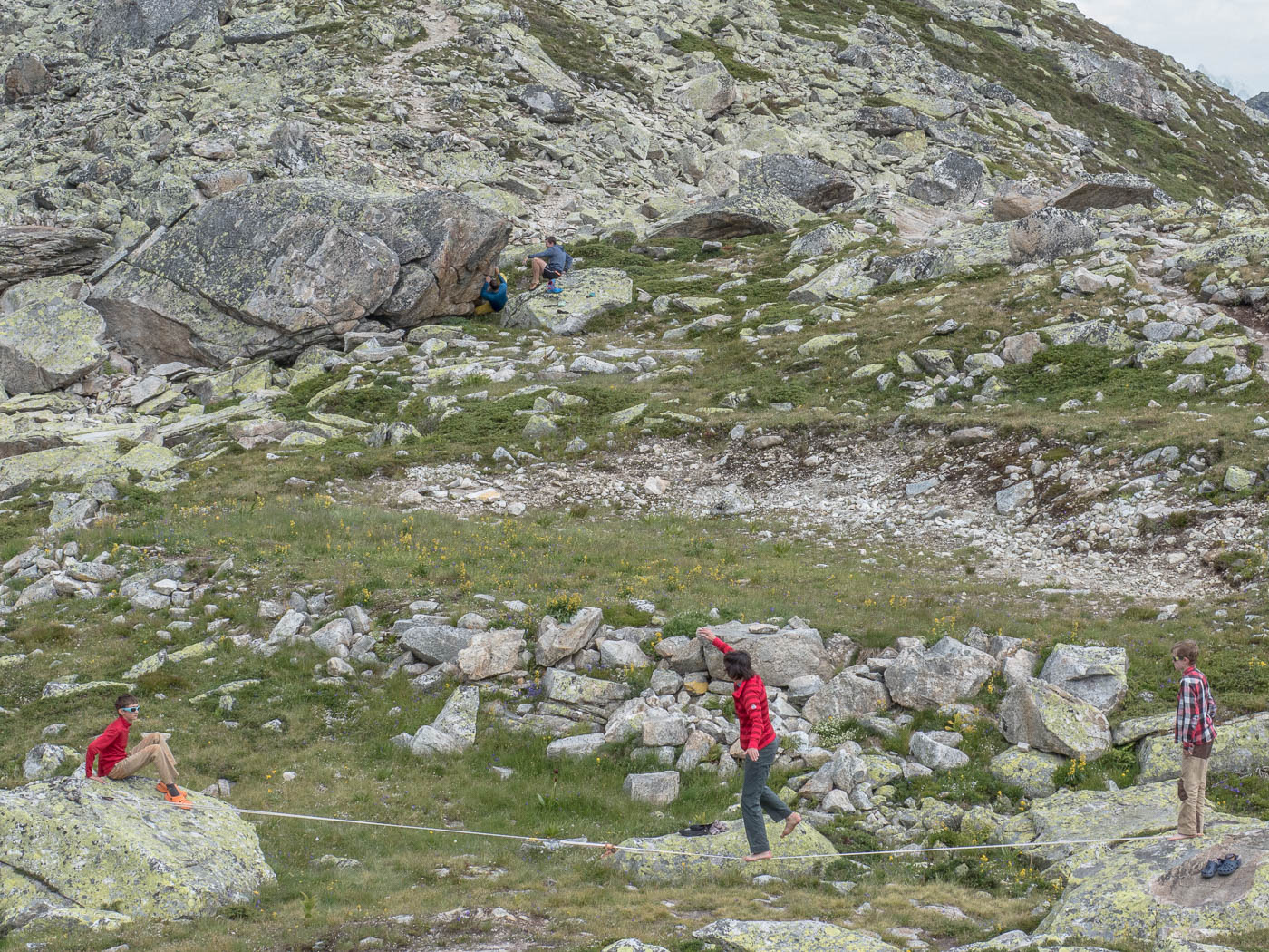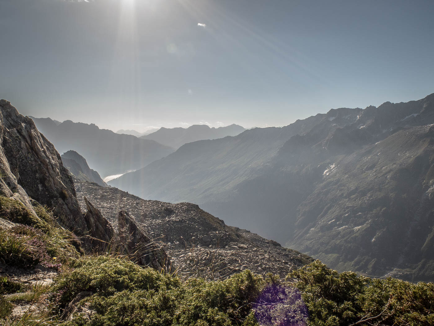Wir blicken ins Voralptal, am Fusse des Salbitschijen verläuft der Höhenweg mit der Hängebrücke. Leider sind auch die Wolken dunkler geworden. Droht etwa schon wieder Regen? Wir machen uns an den Abstieg über die Bergseeschijenlücke, die wir vom Vortag schon kennen. Ausser den beiden Leitern hat niemand mehr Lust zum Klettern, sie gönnen sich beim Hochschijen eine schwere Route. Alle anderen kehren zur Hütte zurück. Nach einer Pause gehen die einen baden, der grosse Rest hat doch noch nicht genug und bouldert an den Felsblöcken in Hüttennähe.