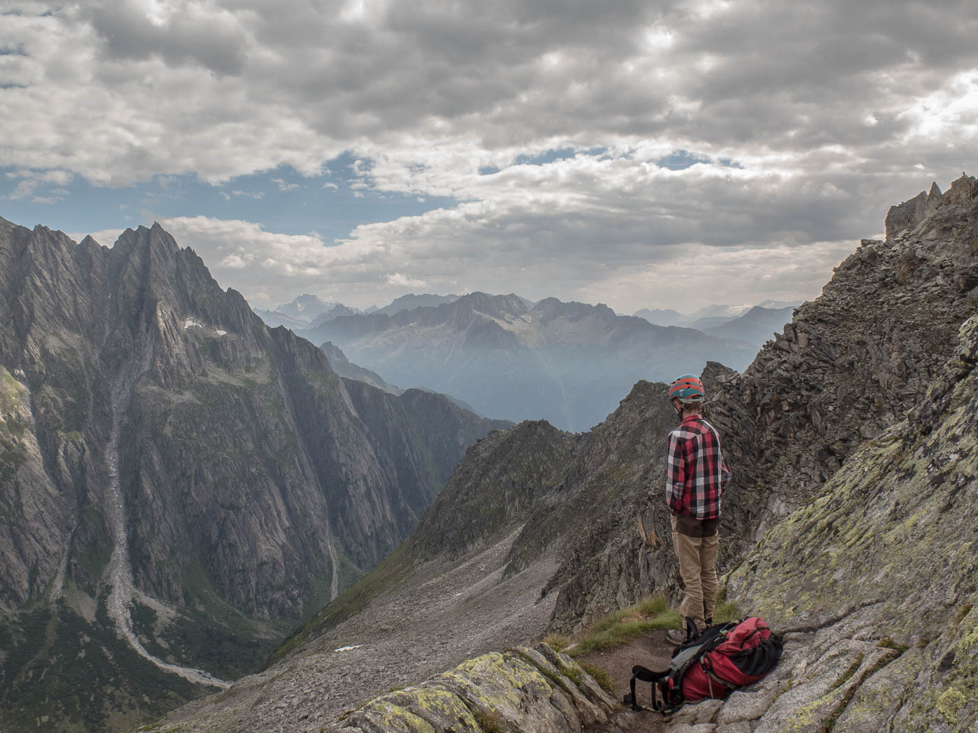 Am ersten Stand geraten wir bereits in den Stau, eine Seilschaft aus zwei älteren Herren kommt nicht so vorwärts. Der Sichernde hat ein Durcheinander mit dem Seil, ich helfe ihm entwirren. Dafür meint der nette Herr, ich solle doch vorangehen, sie seien halt nicht so schnell. Na dann, als sein Seilpartner Stand hat, gehe ich los und bin bald bei ihm. Sie lassen auch Silvan noch vorangehen, so dass wir schon wieder weg sind, bis der Nachsteiger ankommt. Die letzte Seillänge ist kurz und einfach, sie endet auf dem Klettersteig. Wir steigen diesem entlang ab und sind bald wieder bei unseren Sachen am Einstieg. Da wir zwei ziemlich später eingestiegen sind, sind die anderen bereits auf der zweiten Runde, wir steigen bald wieder zur Hütte ab.