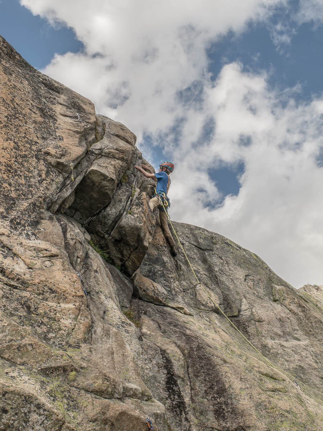Die Routen sind ordentlich abgesichert, so dass man nicht gleich weiche Knie bekommt. Wolken ziehen immer wieder durch, die Temperaturen sind dadurch angenehm. Nach einigen Seillängen kommen alle Routen zusammen, da treffen wir auch auf Spanier, die überhaupt nicht vorwärts kommen. Einer von ihnen ist völlig überfordert und blockiert so alle nachfolgenden Seilschaften. Endlich kommen wir doch noch auf dem Gipfel an. Die einen sind bereits mehr als eine Stunde dort oben, wir geniessen erst mal die Aussicht.