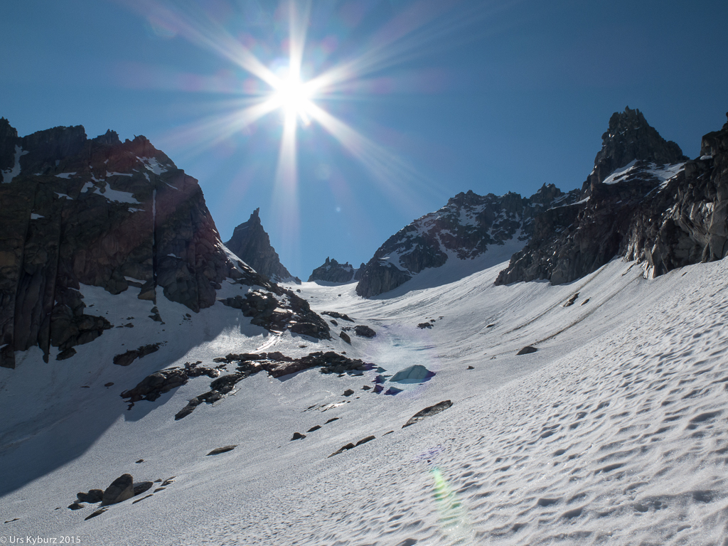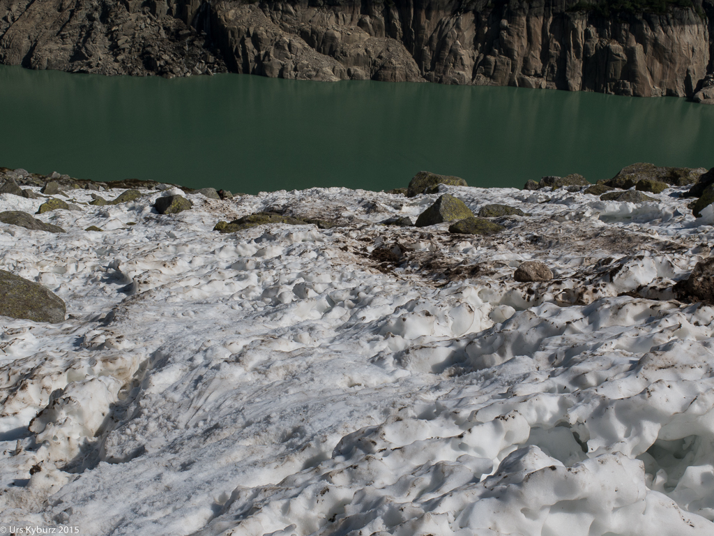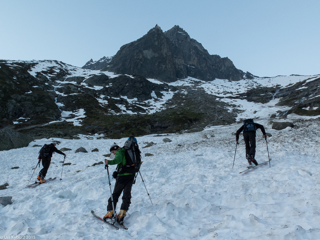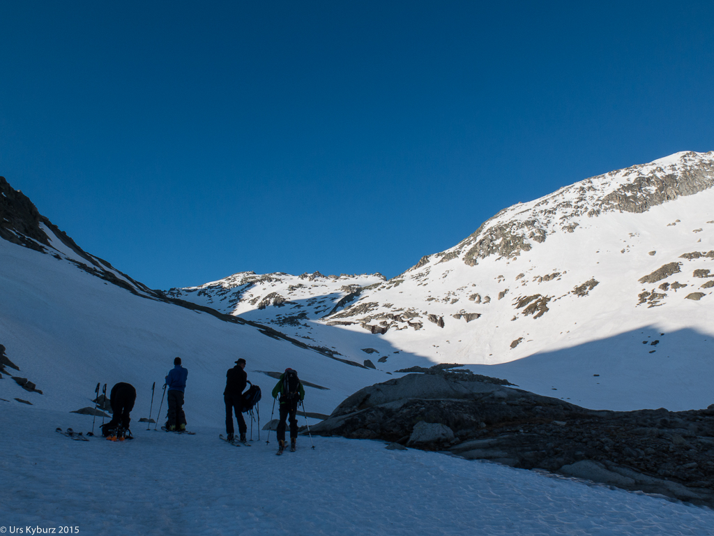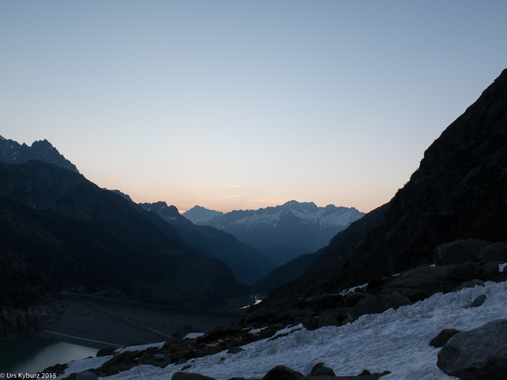 Mitten in der Nacht fuhren wir also auf die Göscheneralp. Um fünf Uhr begann es zu dämmern, wir buckelten der Saison entsprechend die Skis, überquerten den Damm und folgten dann dem Bergwanderweg, der um den See herum führt. Bald einmal stiegen wir links hoch zum Schnee, wo wir endlich die Skis anziehen konnten. Es war aber ein mühsames Gehen, der Schnee war von Furchen und Gräben durchzogen, die das Schmelzwasser verursacht hatten. Und zwischendurch hatte es gar keinen Schnee mehr, so dass wir die Skis über ein Geröllfeld tragen mussten. Auf einem Felsblock genehmigten wir uns eine kurze Pause, pünktlich zum Sonnenaufgang. Wir genossen diese ersten Sonnenstrahlen, waren aber froh, dass der weitere Weg im Schatten der mächtigen Wänden des Vorder Feldschijen verlief.