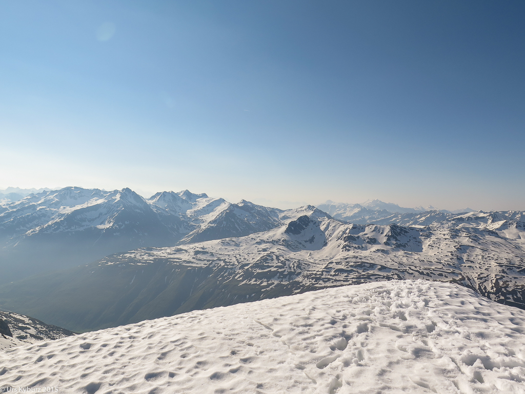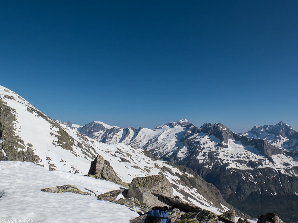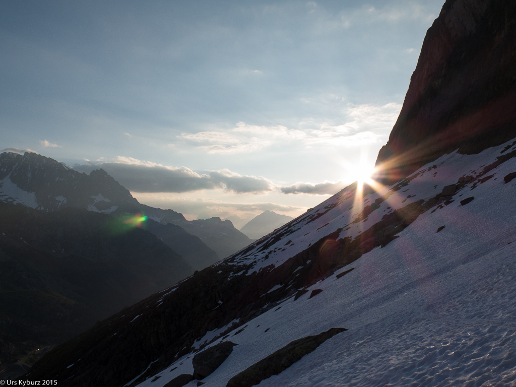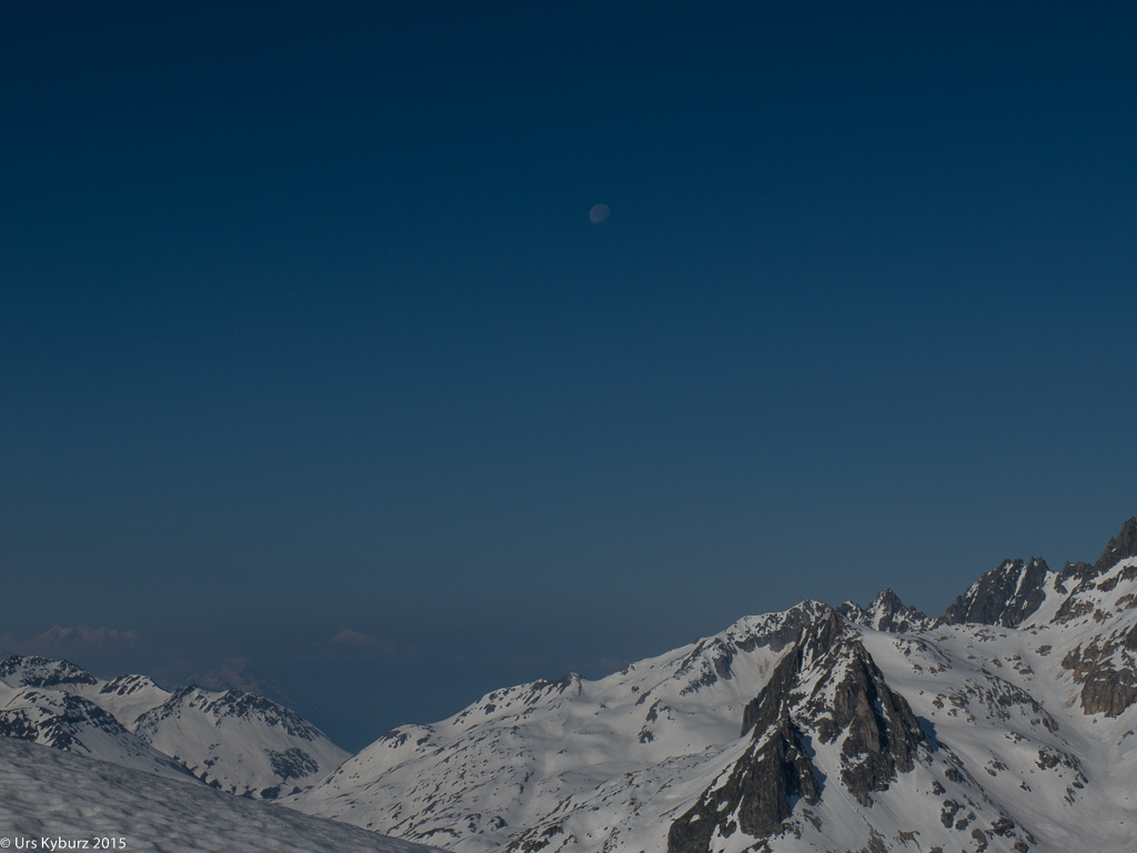 Kein spektakulärer, dafür war es die Aussicht umso mehr. Furka-, Gotthard- und Oberalppass hatten wir im Blickfeld, die Walliser Viertausender, allen voran das markante Weisshorn, leuchteten uns entgegen. Hoch oben stand der Mond. Vor uns erhoben sich die Berge des Tessins, gegen den Oberalppass zu jene von Graubünden. Eine wahre Gipfelparade liess unsere Herzen höher schlagen und uns von weiteren Bergabenteuern träumen.
