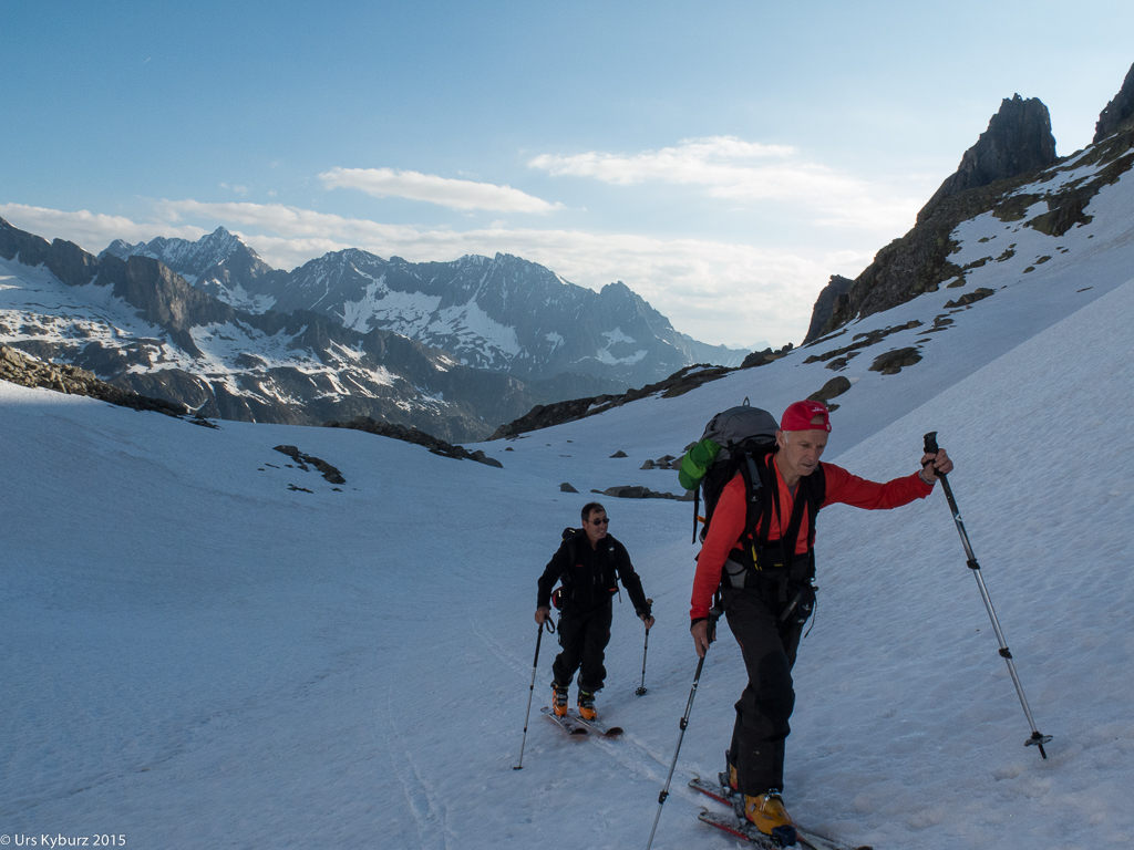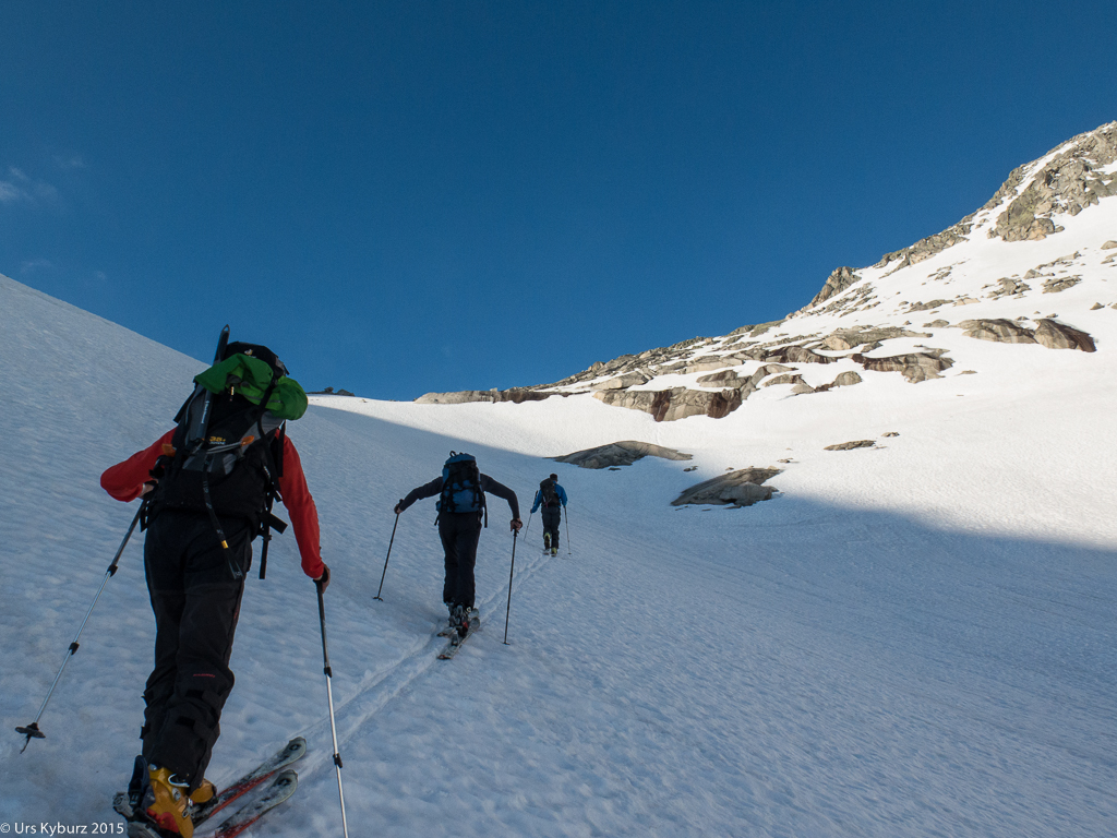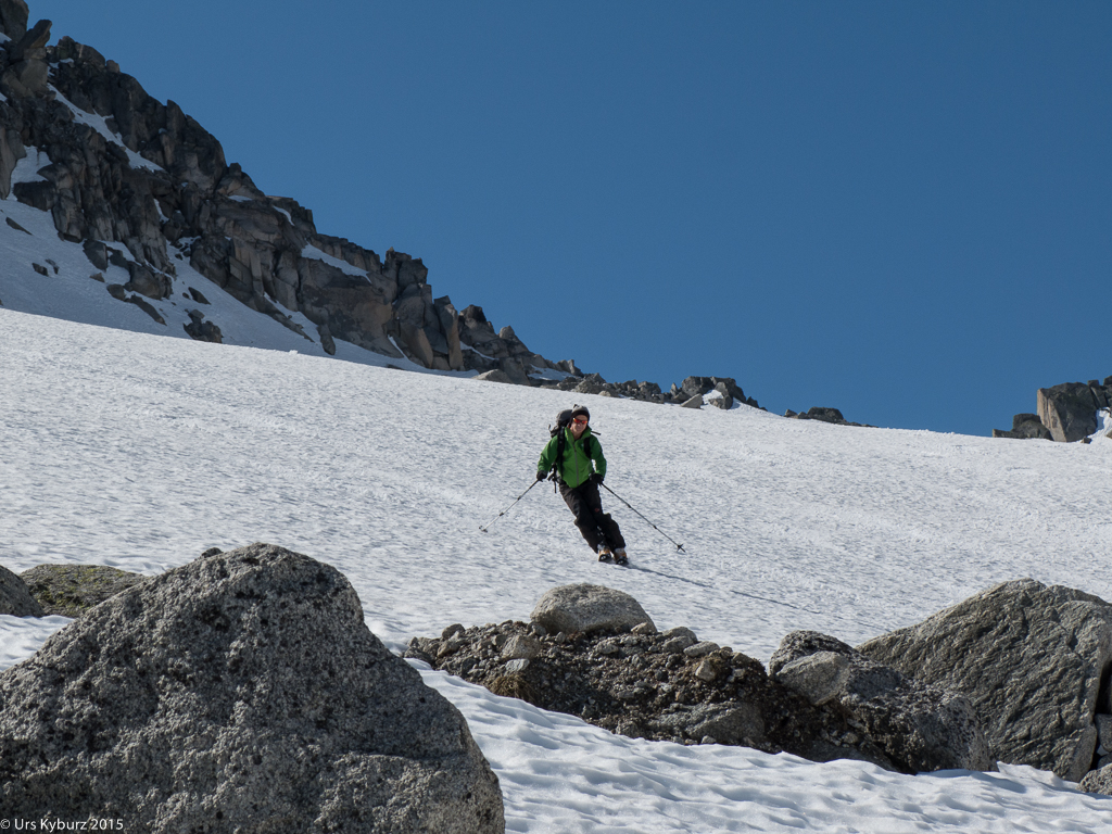 Nach einer Pause stiegen wir zum Skidepot ab. Um diese Jahreszeit ist das Timing wichtig, damit man den Schnee zur rechten Zeit erwischt. Fährt man zu früh los, ist er noch hart, ist man zu spät dran, kämpft man mit Nassschnee. Wir fanden den richtigen Zeitpunkt, der Schnee war jedenfalls nicht weicher geworden seit dem Aufstieg. Und es war durchaus ein Vergnügen zu fahren. Unser erfahrene Tourenleiter fand immer wieder die richtigen Hänge in der richtigen Exposition. Je weiter wir aber nach unten kamen, desto weniger nützte die Erfahrung, denn der Schnee wurde nun immer knapper und schlechter, bis wir das Fahren endgültig aufgaben und die Latten wieder buckelten.