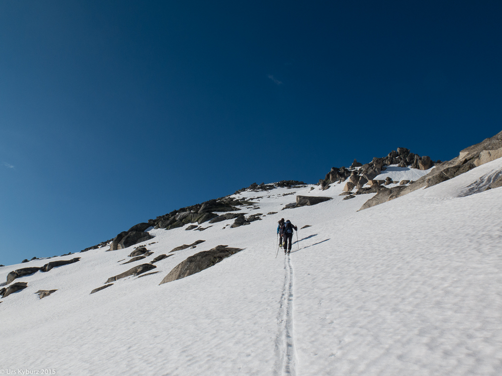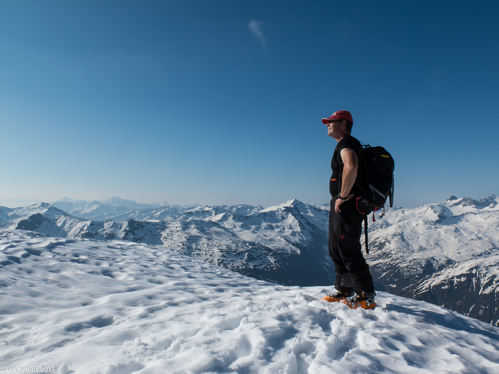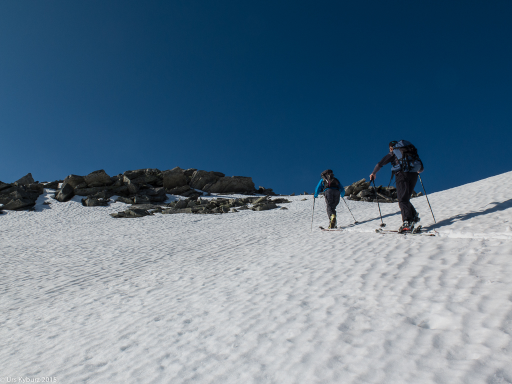 Immer wieder trafen wir auf Hindernisse der schneefreien Art, was uns zwang, die Skis kurz auszuziehen, nur um sie ein paar Meter weiter wieder anzuziehen. Langsam kamen wir unserem Ziel näher. Nach eine flachen Passage bäumte sich nochmals ein Hang vor uns auf, der schon voll der Sonne ausgesetzt war. Trotzdem war der Schnee noch relativ gut. Vermeintlich oben angekommen, war das, wie es in den Bergen oft vorkommt, erst der Vorgipfel, den Hauptgipfel sah man erst von hier aus. Es galt, nochmals eine Felspassage zu überwinden. Inzwischen waren aber alle zu faul, die Skis auszuziehen, und das Wort „Skibergsteigen“ bekam gleich eine neue Bedeutung. Mir fiel etwas pink-rotes auf auf dem Felsen. „Oh, eine Flechte?“, dachte ich mir, bis ich bemerkte, dass es ein Fetzen Skifell war. Nun trennte uns nur noch ein kurzer Felsaufschwung vom Gipfel. Diesmal deponierten wir unsere Bretter aber, weiter ging es zu Fuss. Eine kurze Kletterpassage, ein paar Meter Schneestampfen, und der Gipfel war erreicht.