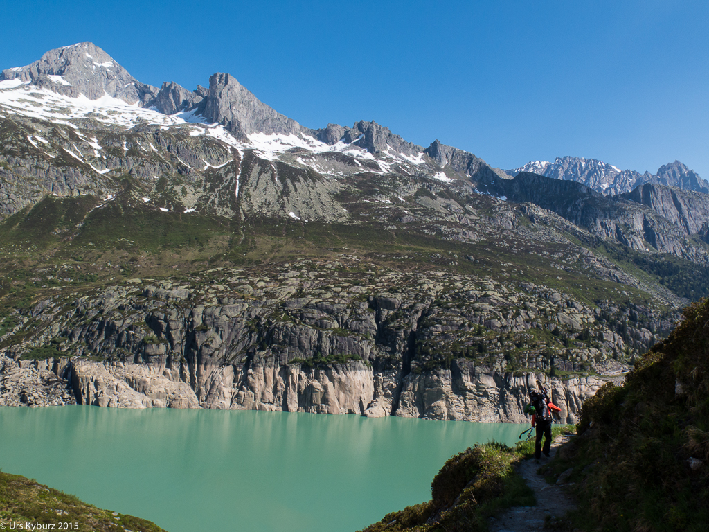 Der Rückweg war nun einfacher, da es abwärts ging. Wieder auf dem Staudamm, kamen uns die ersten sommerlich gekleideten Ausflügler eines Firmenanlasses entgegen, die uns ziemlich komisch anschauten. Zurück beim Auto, konnten wir uns endlich den Skihosen entledigen, die jetzt definitiv deplatziert waren bei den heissen Temperaturen, und auch auf ein leichtes Sommertenu umstellen. Den Abschluss der erfolgreichen Skitour und -saison feierten wir bei einigen Gläsern Après-Skitourengetränk* im örtlichen Restaurant.