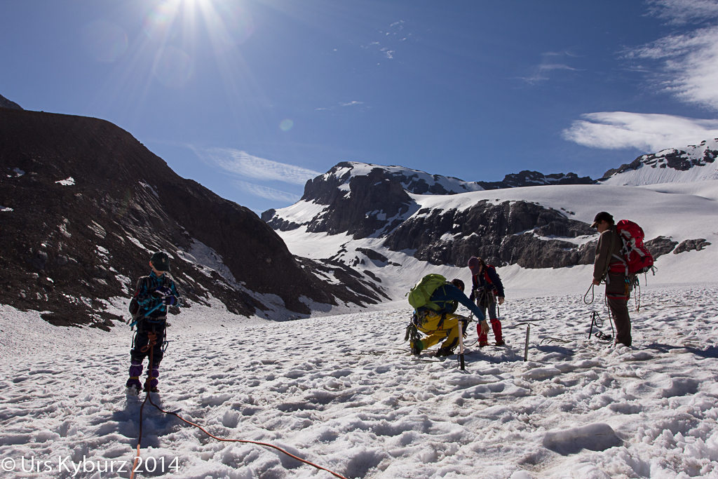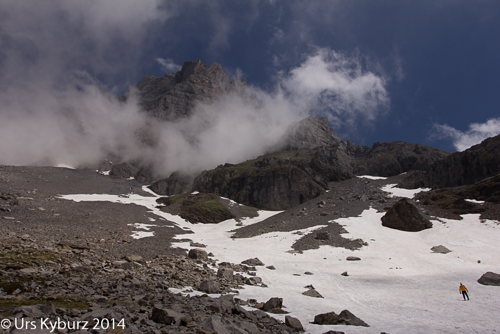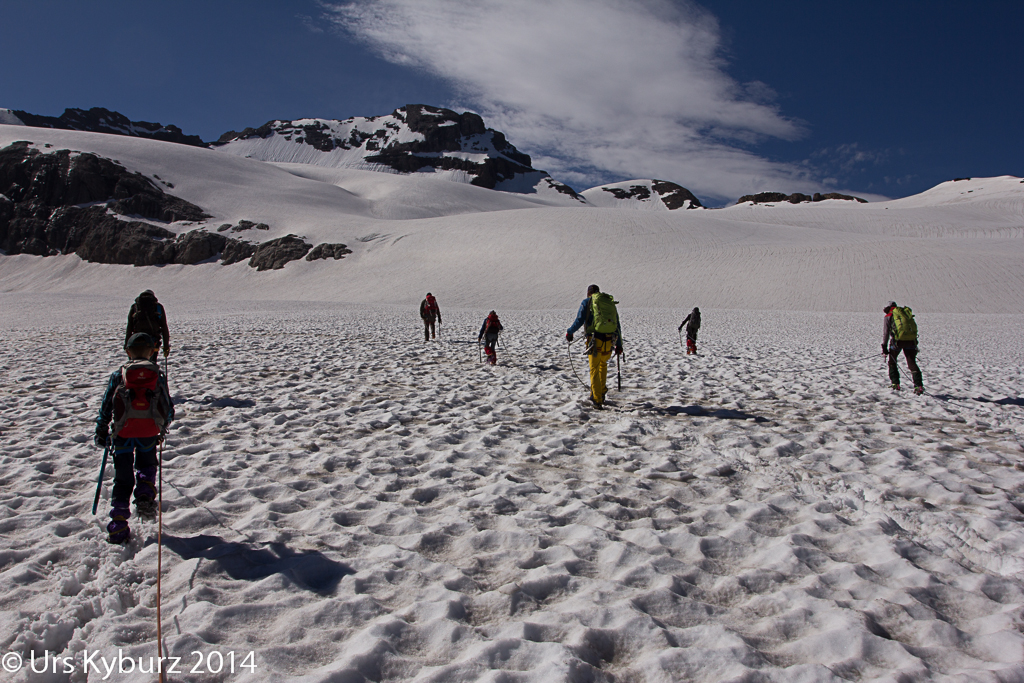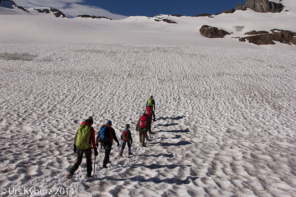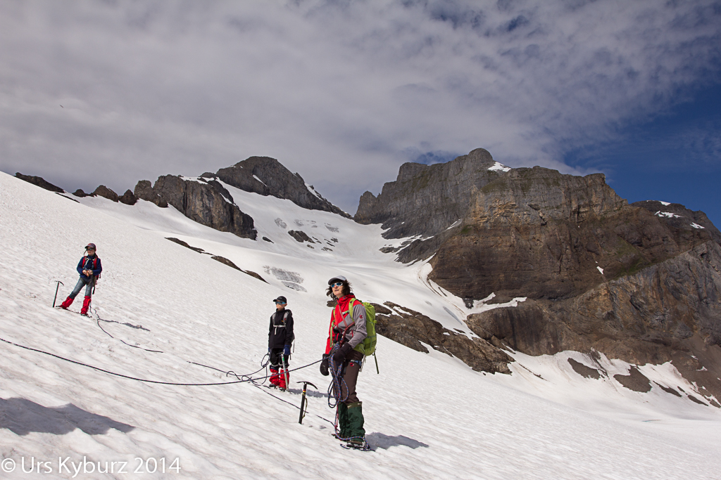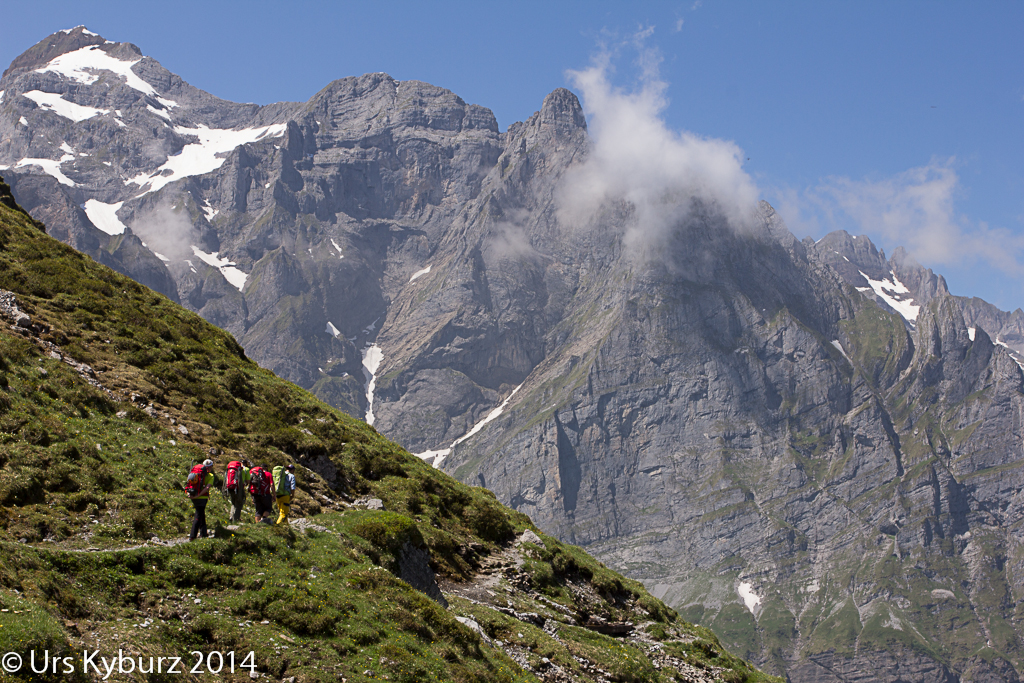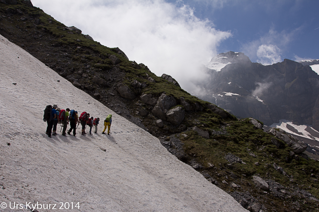 Kleinlaut rief der Tourenleiter am Donnerstag an, dass es dann doch mehr als 1300 Höhenmeter wären. Na gut, dann machen wir also eine Bergtour und prüfen die Kondition der Kinder. Der erste Teil führte durch den Wald, was angenehm war bei dieser Hitze. Und bei der Biwaldalp konnten wir auch noch den Durst löschen. Der zweite Teil der Wanderung war nun alpiner, er führte unter dem Uri Rotstock durch. Die Runsen, welche wir queren mussten, waren zum Teil immer noch mit Schnee gefüllt. Aber auch das Queren von solch heiklen Passagen muss geübt werden, gibt es doch immer wieder schwere Unfälle durch Ausrutschen auf Schnee. Ohne Pickel möchte ich jedenfalls hier nicht durch, schon gar nicht mit einer Gruppe.