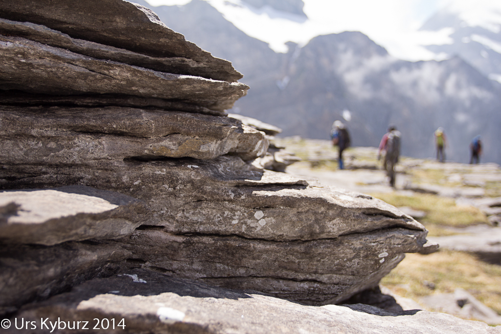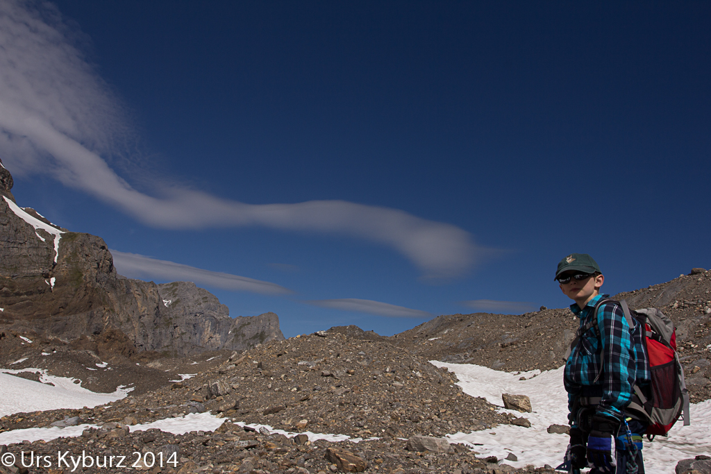 Noch wartete das letzte steile Stück auf uns. Ich ging mit meinem Älteren am Schluss der Gruppe. Plötzlich rumpelte und polterte es über uns: Steinschlag! Uns klopfte das Herz bis zum Hals, zumal wir nicht sahen, wo genau die Steine rollten. Aber zum Glück kamen sie nicht in unsere Richtung. Zügig querten wir zum Pass, immer wieder auf die Hänge über uns schielend. Nun war es nicht mehr weit bis zur Hütte, mit Ausbildung wurde heute aber nichts mehr.