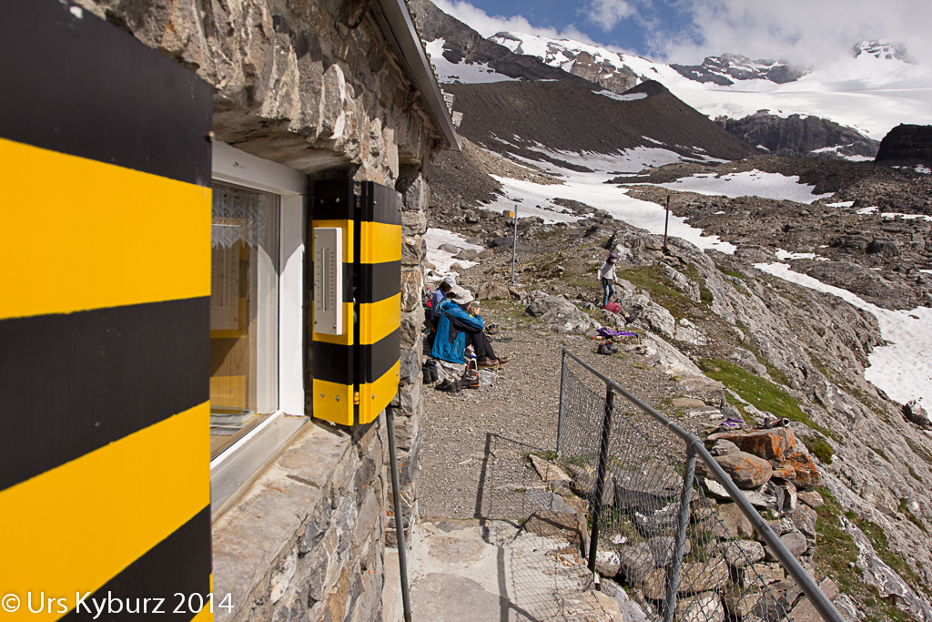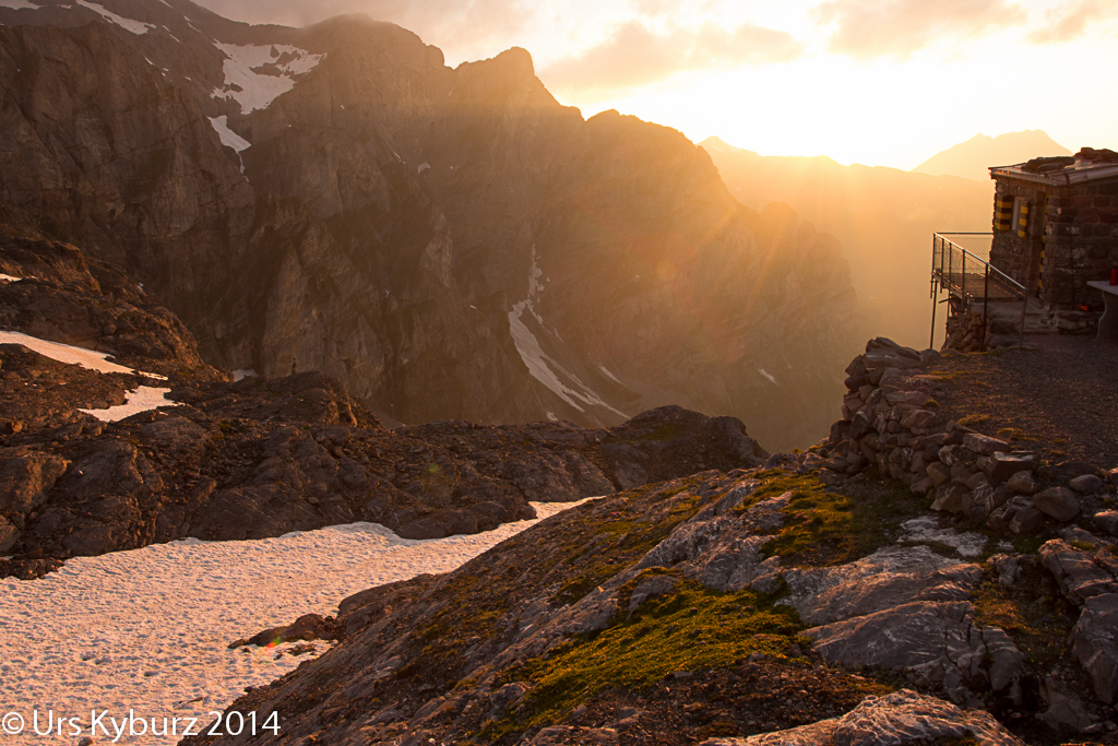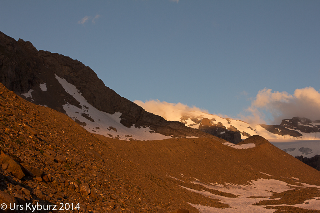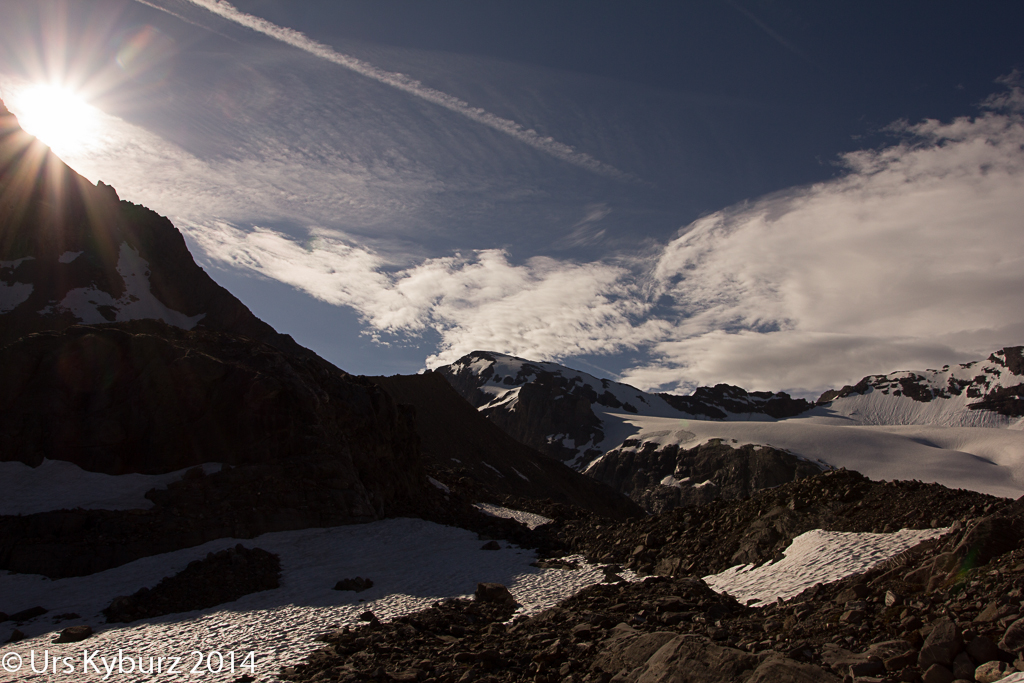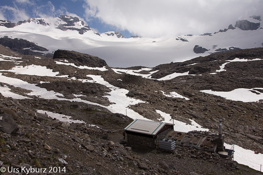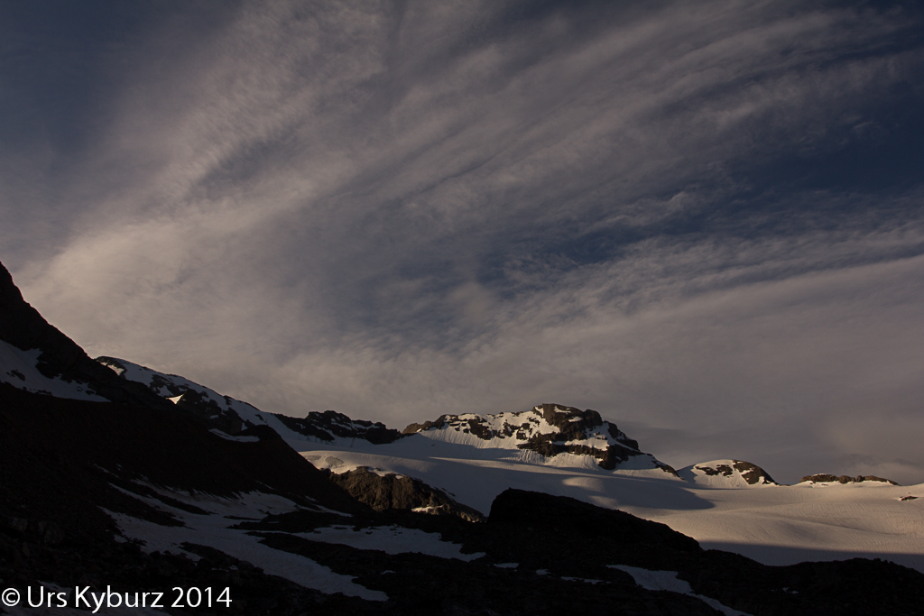Die Hütte liegt am Rande eines Hochplateaus und bietet eine spektakuläre Fernsicht. 1949 wurde sie direkt am Rande des Gletschers gebaut. Dieser ist inzwischen aber einige hundert Meter weit weg. Wir machten es uns gemütlich, genossen die Sonne, welche ein Spektakel sondergleichen bot und die Landschaft in sanftes Abendlicht tauchte.