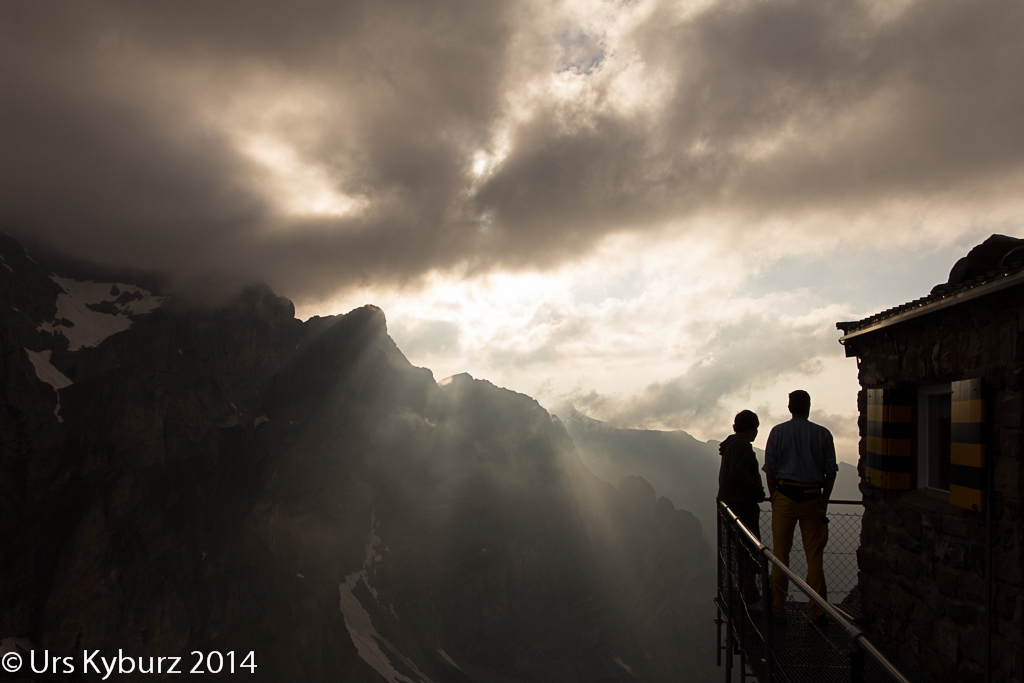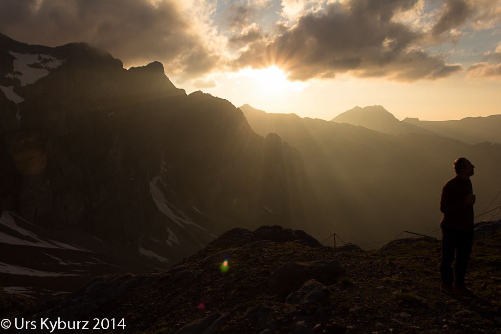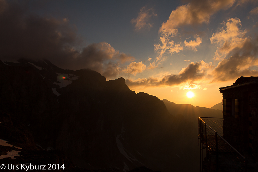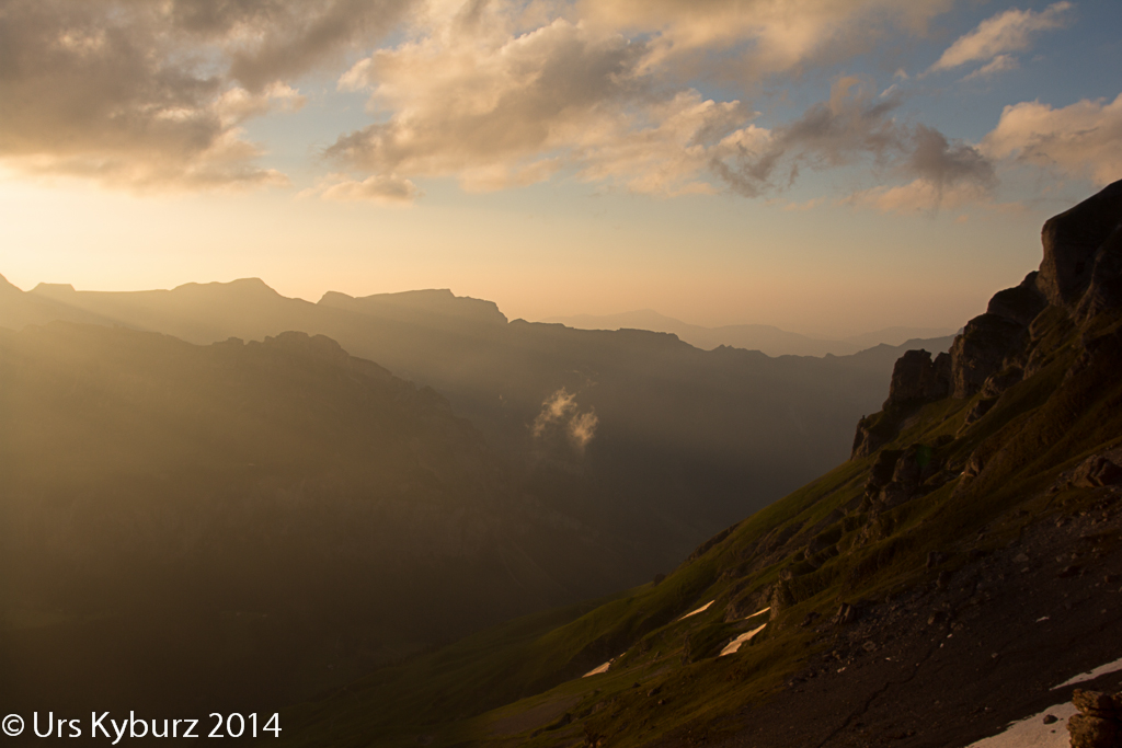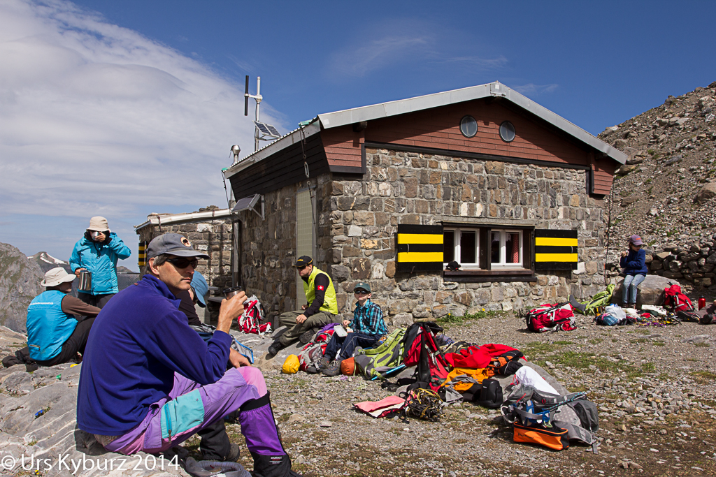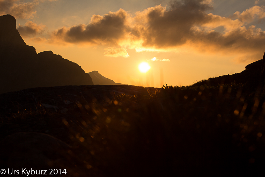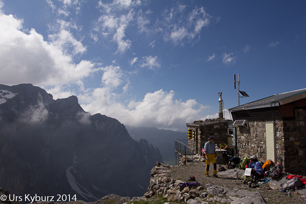 Die Hütte liegt am Rande eines Hochplateaus und bietet eine spektakuläre Fernsicht. 1949 wurde sie direkt am Rande des Gletschers gebaut. Dieser ist inzwischen aber einige hundert Meter weit weg. Wir machten es uns gemütlich, genossen die Sonne, welche ein Spektakel sondergleichen bot und die Landschaft in sanftes Abendlicht tauchte.