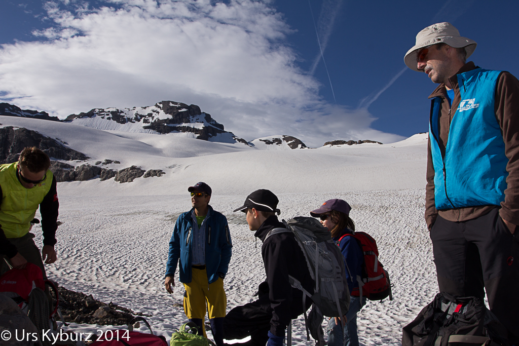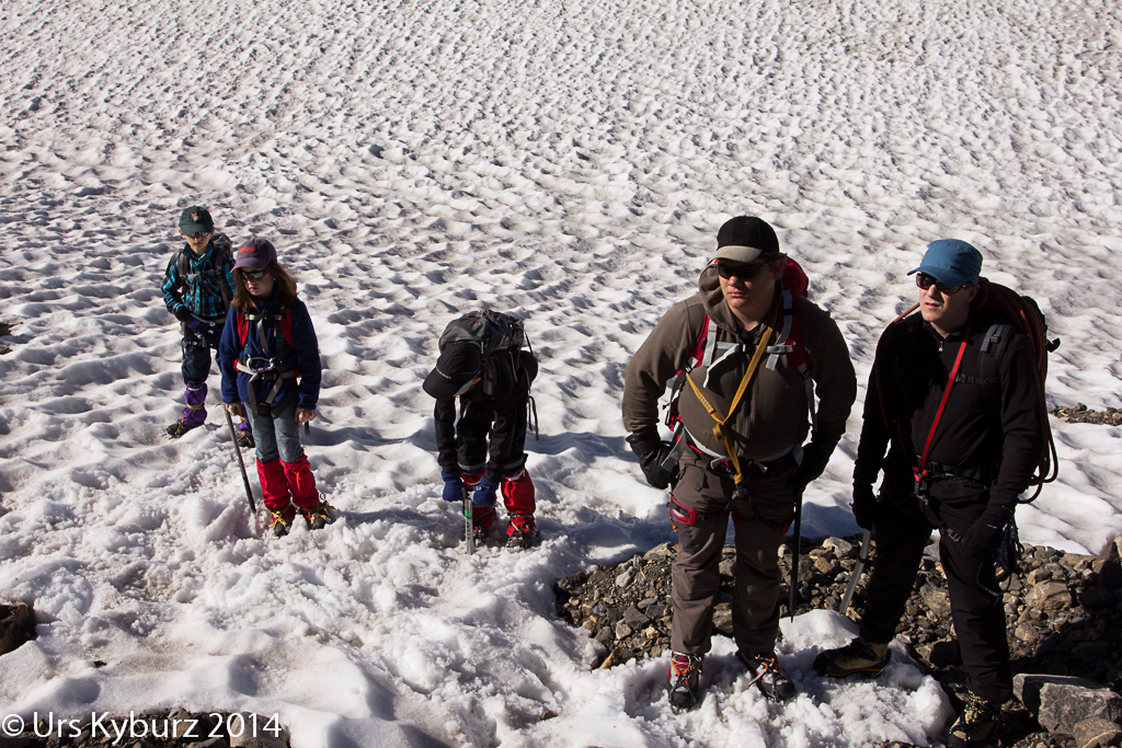 Am nächsten Tag kamen wir doch noch auf den Gletscher. Zuerst wurde das Gehen in verblocktem Gelände geübt, bevor wir die Steigeisen anzogen, für die Kinder ein Highlight. Auch das Gehen am Seil über den Gletscher wollte geübt sein, ebenso das Rutschen und Auffangen, welches aus Sicherheitsgründen ohne Steigeisen ausgeführt wurde und für Gaudi sorgte.