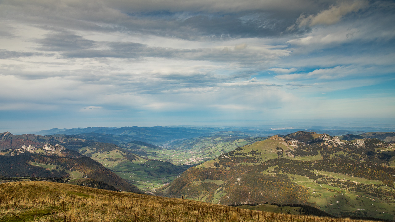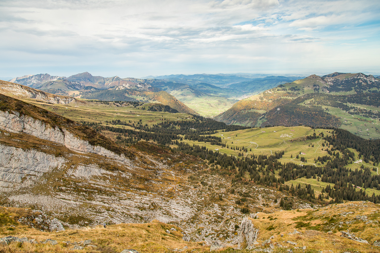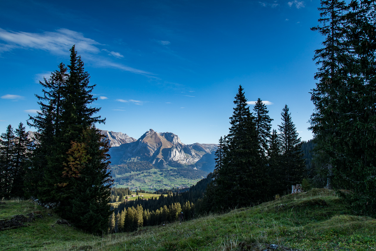 Wir entscheiden uns für den Schibestoll, dessen Gipfel 2334 Meter über Meer liegt.Die erste Etappe bringen wir ganz bequem hinter uns, wir nehmen die Kombination aus Gondelbahn und Sessellift von Alt St. Johann zur Sellamatt. Nun könnten wir die Tour gemütlich mit einem Kaffee starten, den sparen wir uns aber für nach der Tour auf. Die Wanderung beginnt sanft, auf breiter Alpstrasse kommen wir gut vorwärts. Am Wegrand stehen Tafeln, wir befinden uns auf dem Sagenweg. Wie immer sind sie recht gruselig. Der Himmel ist heute ausnahmsweise mal bedeckt, vermutlich aus Solidarität mit den Flachländern, die schon die ganze Woche keinen klaren Himmel haben. Auf schmalem Pfad geht es weiter, der Wald wird lichter, Weiden lösen die Fichten ab. Der Herbst ist endgültig da, farbenprächtig präsentiert sich hier die Natur.