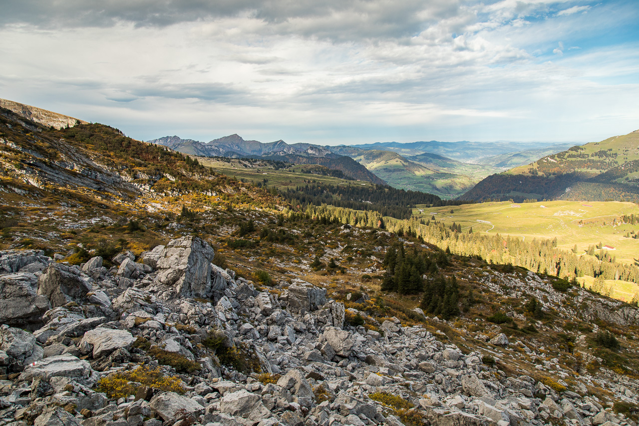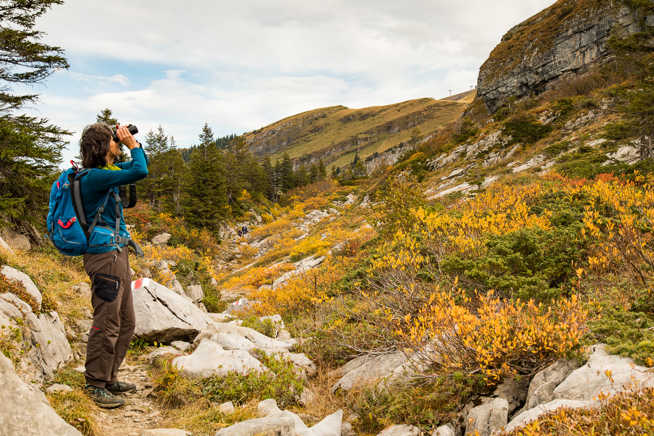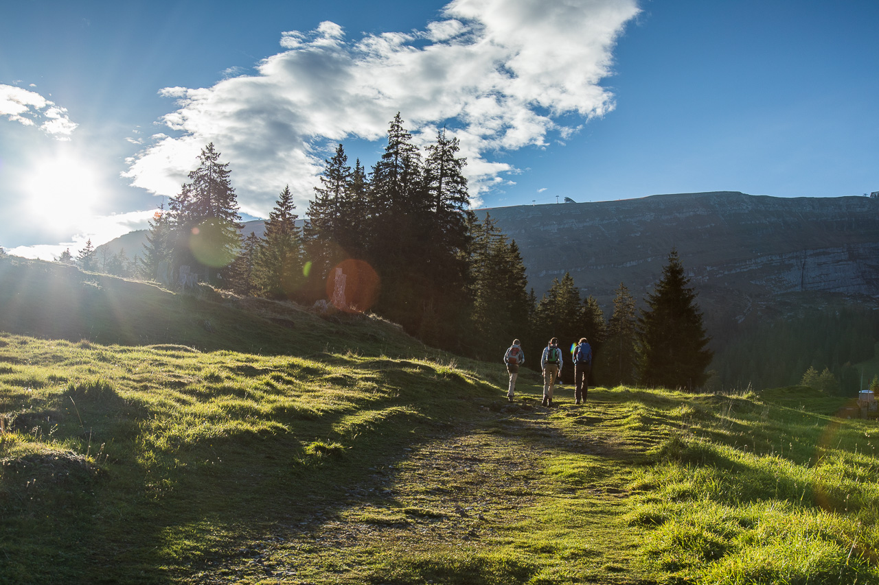 Wir entscheiden uns für den Schibestoll, dessen Gipfel 2334 Meter über Meer liegt.Die erste Etappe bringen wir ganz bequem hinter uns, wir nehmen die Kombination aus Gondelbahn und Sessellift von Alt St. Johann zur Sellamatt. Nun könnten wir die Tour gemütlich mit einem Kaffee starten, den sparen wir uns aber für nach der Tour auf. Die Wanderung beginnt sanft, auf breiter Alpstrasse kommen wir gut vorwärts. Am Wegrand stehen Tafeln, wir befinden uns auf dem Sagenweg. Wie immer sind sie recht gruselig. Der Himmel ist heute ausnahmsweise mal bedeckt, vermutlich aus Solidarität mit den Flachländern, die schon die ganze Woche keinen klaren Himmel haben. Auf schmalem Pfad geht es weiter, der Wald wird lichter, Weiden lösen die Fichten ab. Der Herbst ist endgültig da, farbenprächtig präsentiert sich hier die Natur.