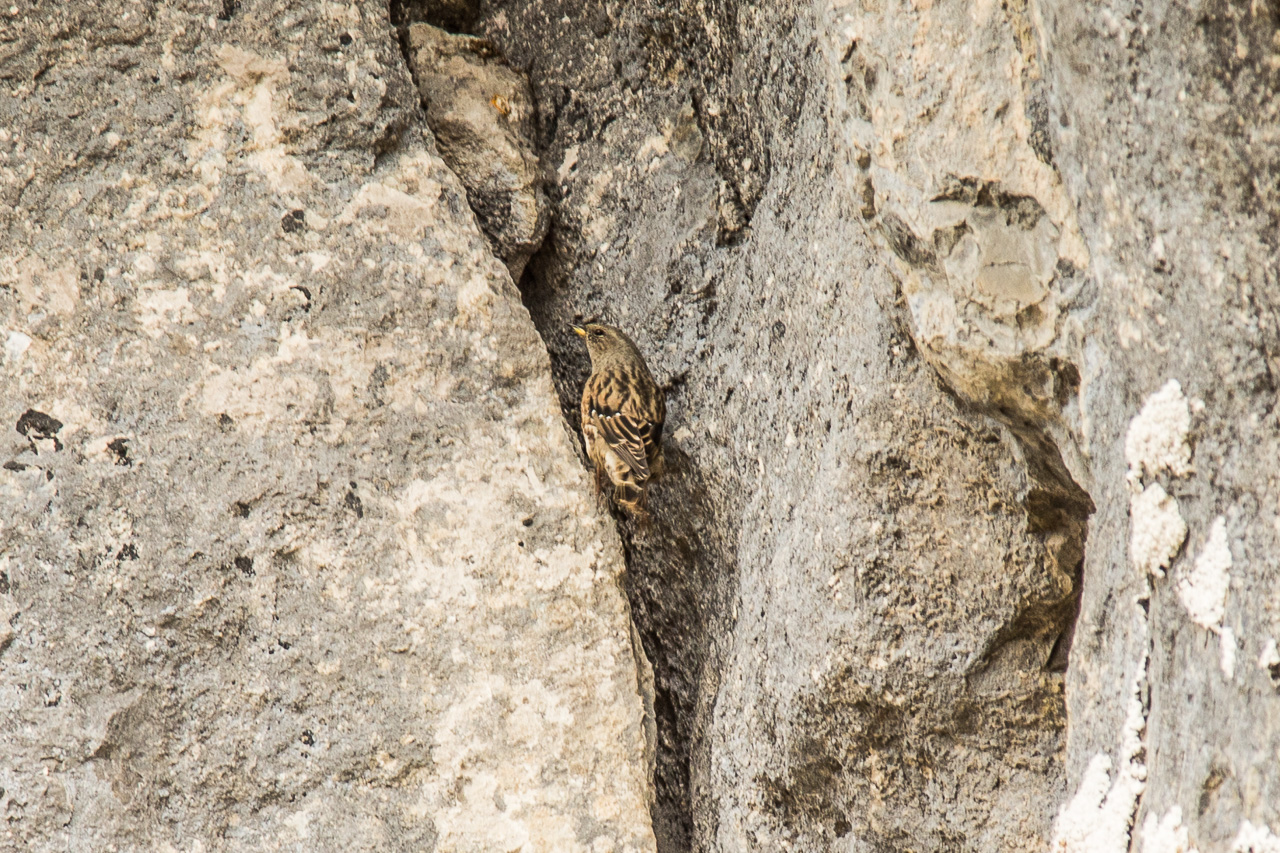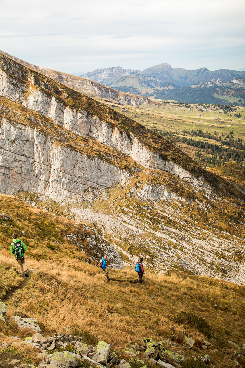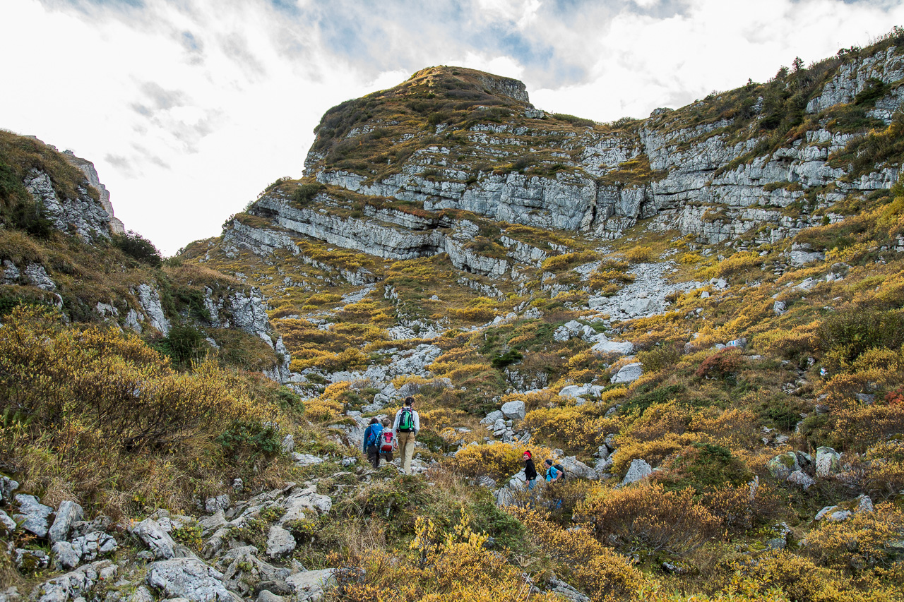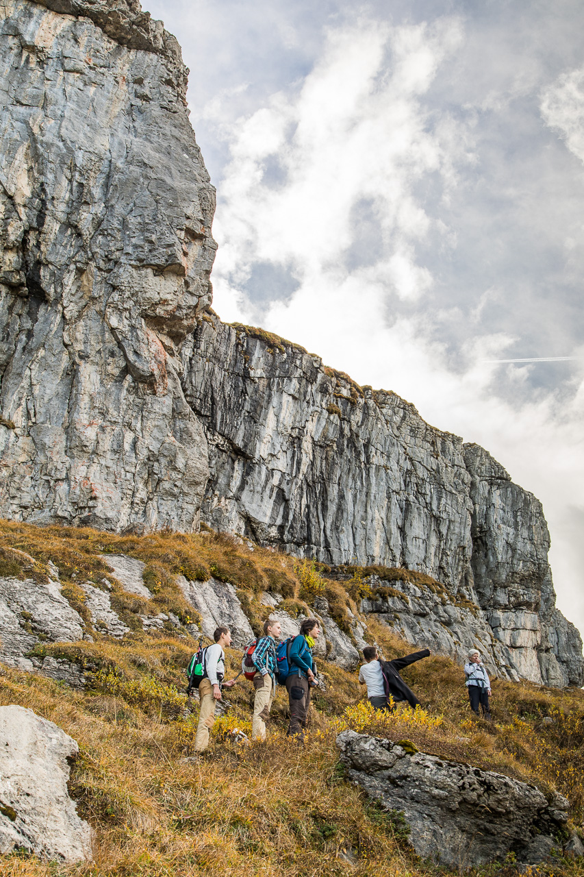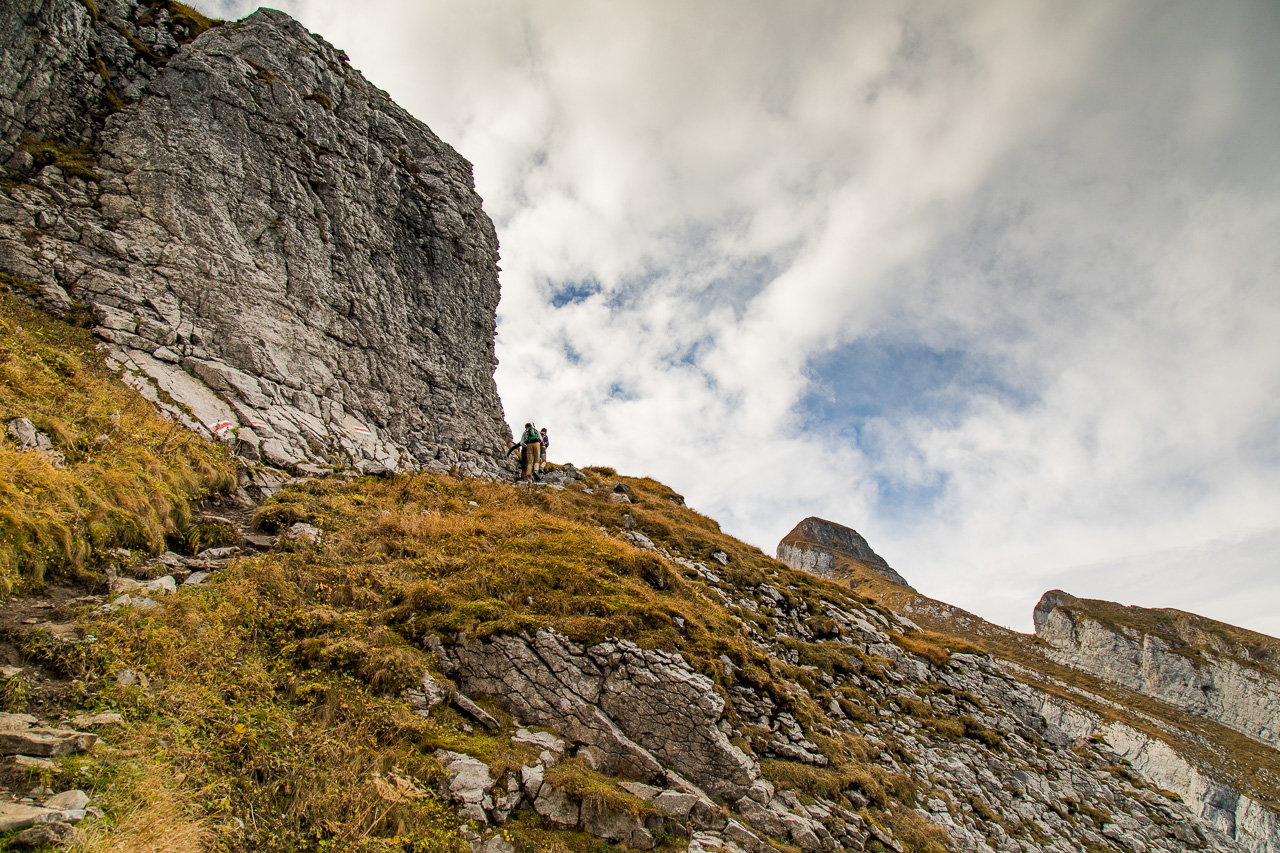 Wir bewegen uns nun auf Schrattenkalk, man erkennt gut die eingelagerten Versteinerungen. Was es aber sind, haben wir keine Ahnung. Nach der Pause steigt der Weg nun an, wir gehen am Fusse einer Felswand entlang. Von weitem habe ich schon versucht zu erkunden, wo der Weg durch geht, alles sieht so abweisend aus. Er ist nicht ausgesetzt, aber man muss trotzdem konzentriert gehen, ein Fehltritt könnte schnell fatale Folgen haben. Der Weg schlängelt sich immer noch der Wand entlang.