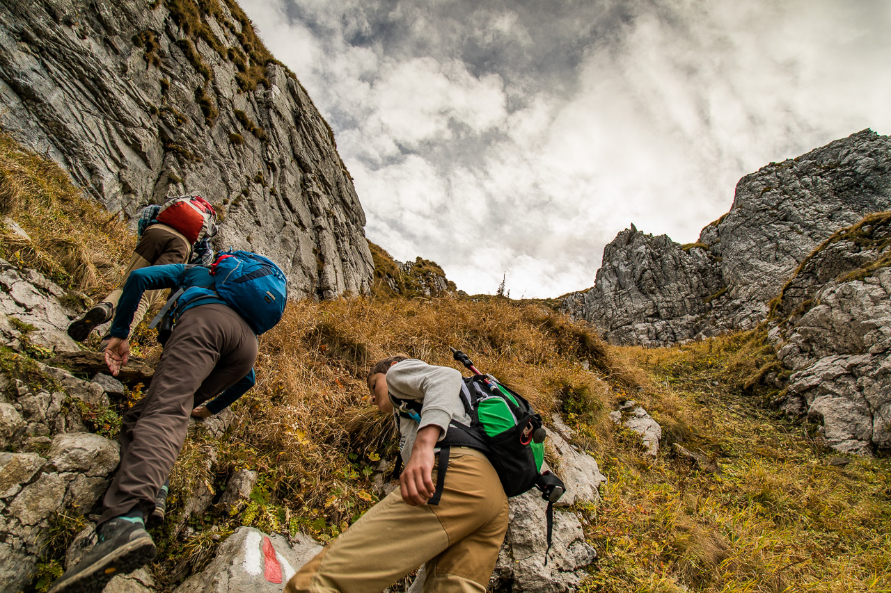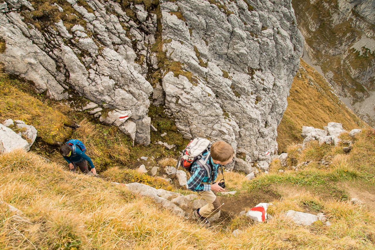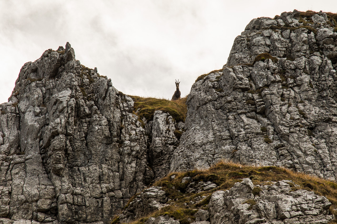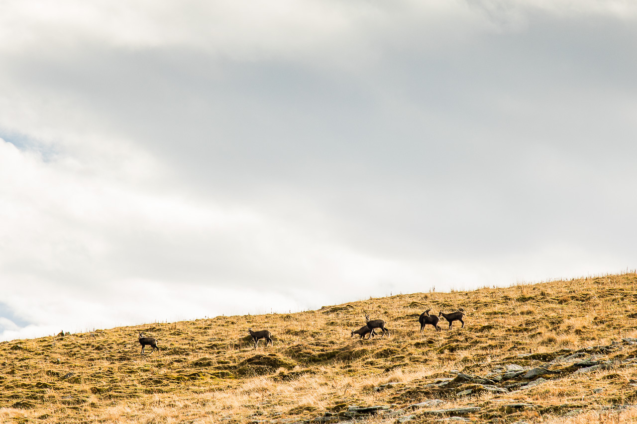 Als wir mal aufblicken, merken wir, dass wir beobachtet werden: Eine Gämse schaut auf uns herunter. Kurz darauf rennt sie unter uns im Gras davon. Unglaublich, wie die mit dem Gelände klar kommen! Nun sehen wir, wo der Weg durch die Felsen führt, es wird kurz steil, wir müssen sogar kraxeln. Oben wird es wieder flacher, ein normaler Bergwanderweg führt die weite Ebene aufwärts. Eine Gämse rennt abwärts, bleibt wieder stehen, beobachtet uns, rennt weiter. Schon zwei der schönen Tiere. Aber da oben, da sind ja noch mehr! Sechs weitere Tiere schauen uns in sicherem Abstand zu, sie scheinen zu wissen, dass wir keine Gefahr darstellen.