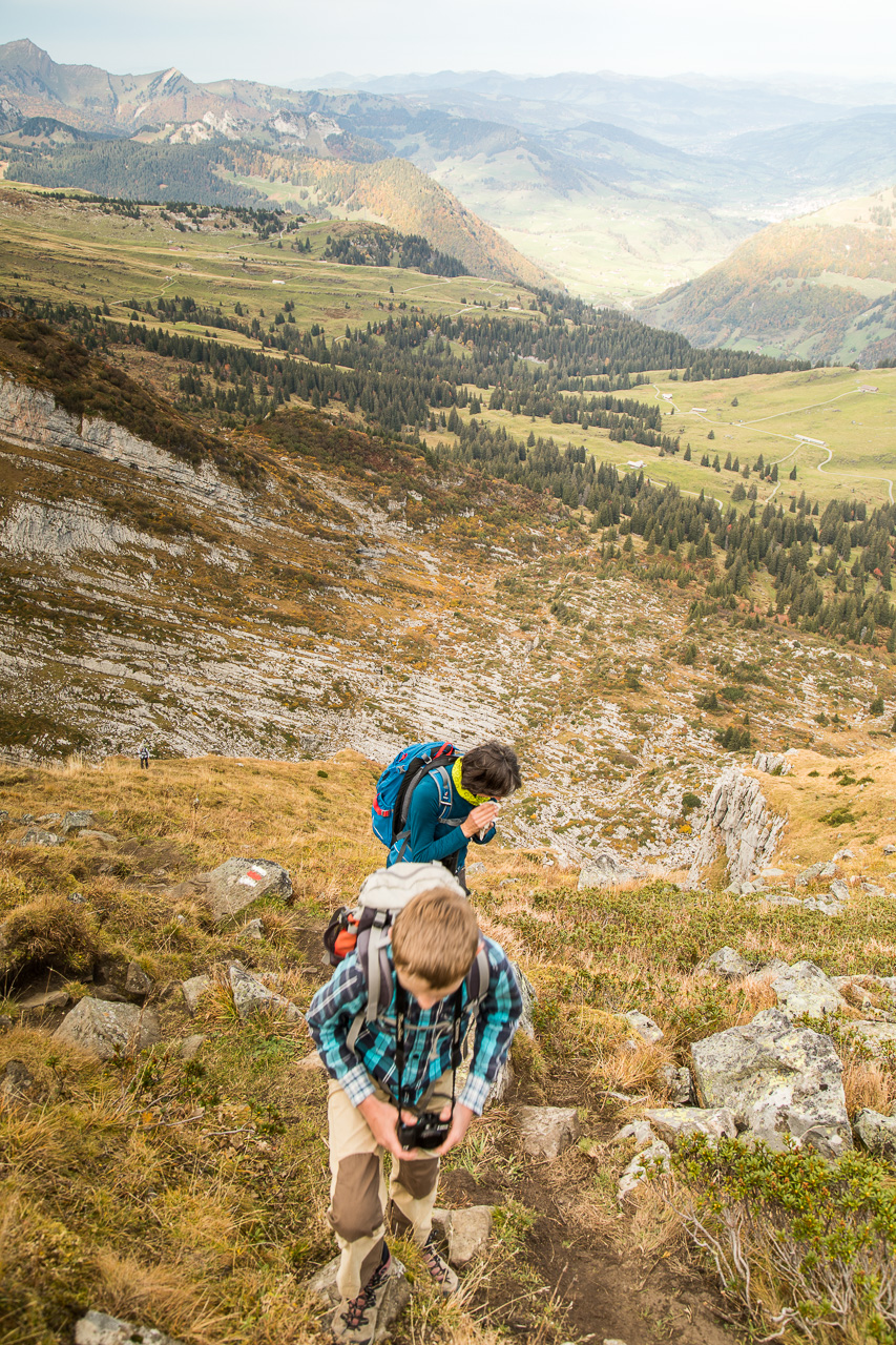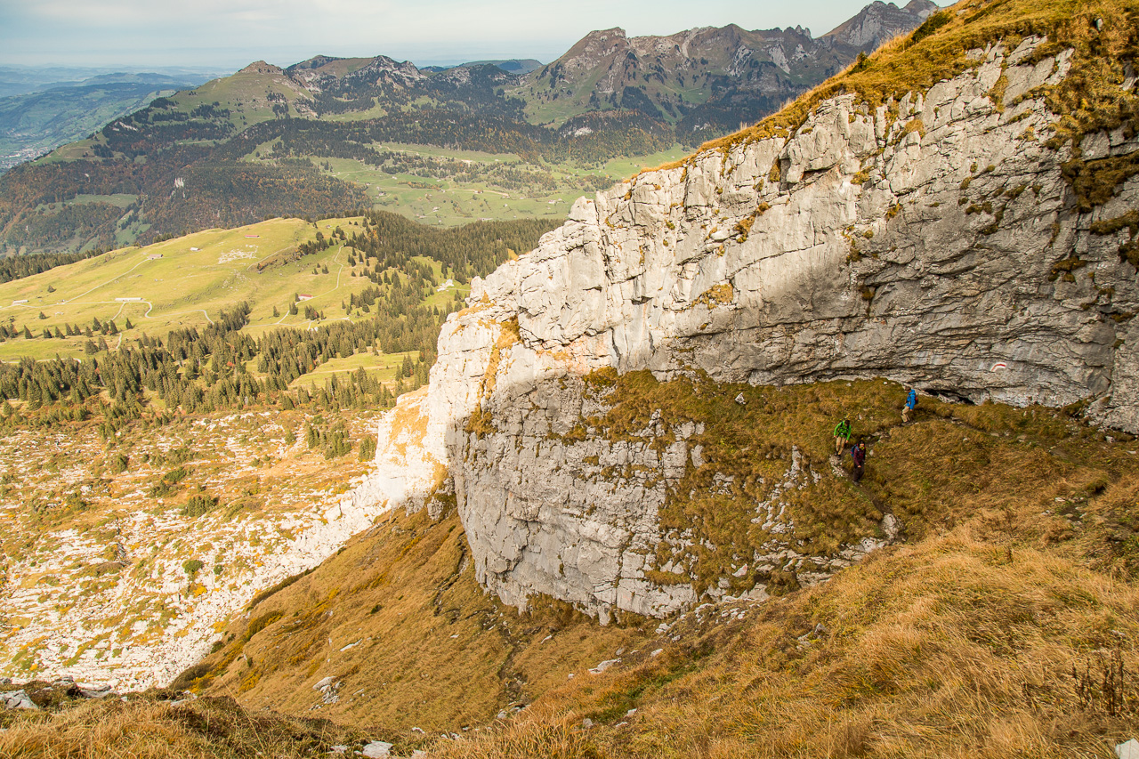 3, 2, 1, Gipfel erreicht! Eine grandiose Rundsicht eröffnet sich uns, die Frau sieht endlich den Walensee („Ich will den Walensee schon noch sehen in den Ferien“). Et voilà. Gegenüber erhebt sich der markante Spitzmeilen, daneben und dahinter noch hunderte andere Berge, sie waren aber bei dem diffusen Licht nicht deutlich auszumachen. Es windet, wir halten uns nicht lange auf dem Gipfel auf, steigen auf dem gleichen Weg wieder ab. In der Felswand am Wegrand huscht eine Alpenbraunelle hoch. Die Herbstfarben beeindrucken im Abstieg noch fast mehr als im Aufstieg, man kriegt eine neue Perspektive darauf. Bald erreichen wir die Sellamatt wieder, aber statt diese links liegen zu lassen biegen wir rechts ab und belohnen uns mit einem feinen Stück Kuchen.