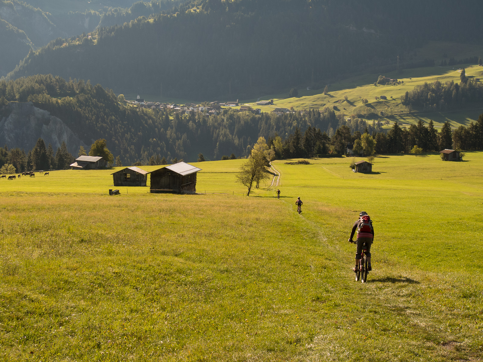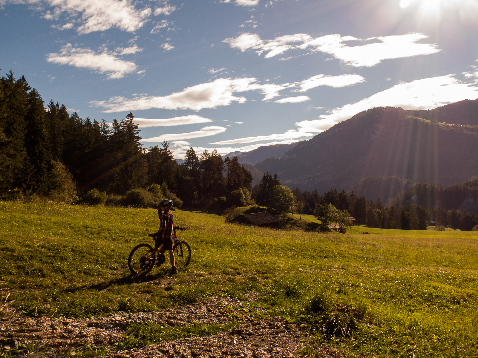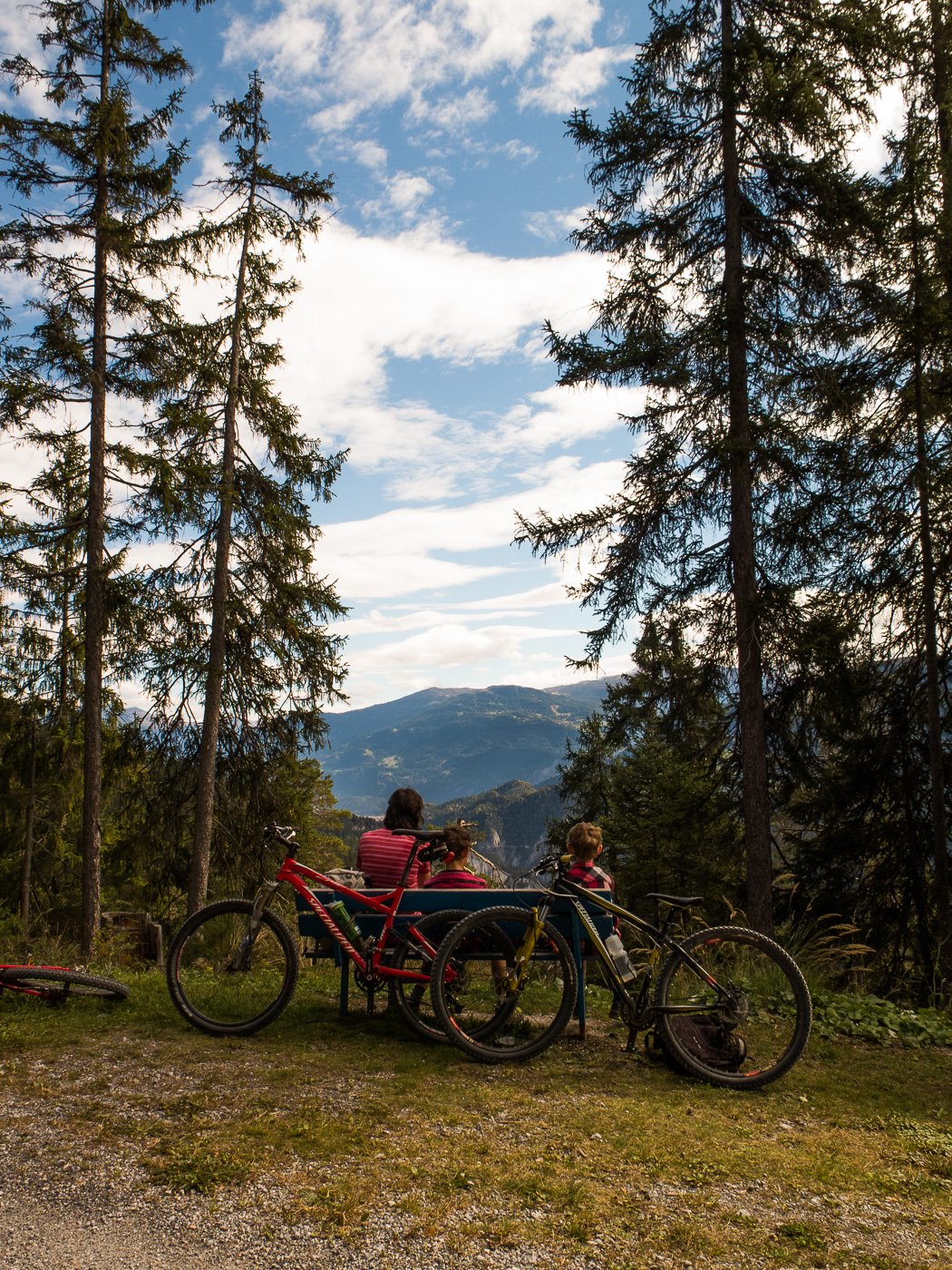 Nun fahren wir an der Sonne über eine Wiese (der Wanderweg führt da durch), diesmal die Kinder voraus, bis Planezzas Sut. Weiter hinunter nach Sagogn oder wieder hoch? Da es nach Sagogn nur noch Forststrassen und keine Singletrails mehr hat, wollen die Kinder wieder aufwärts. Wir fahren also ostwärts, erreichen die Route 260, der wir nun folgen. Wir sind wieder im Wald, es geht aufwärts, mal steiler, mal weniger, ab und an legen wir eine Pause ein. Nach der Umrundung geht es abwärts, wir kommen wieder zum Parkplatz bei der Brücke. Bei der Fahrt zurück nach Flims fahren wir auf dem Trottoir, und wieder überholt uns die Polizei…