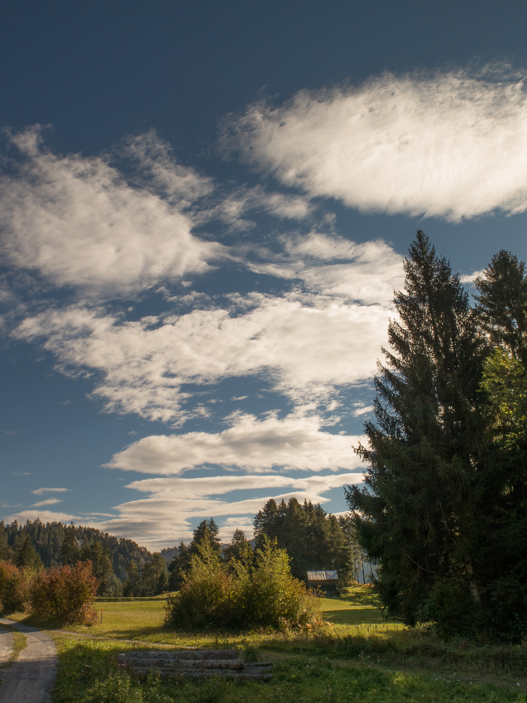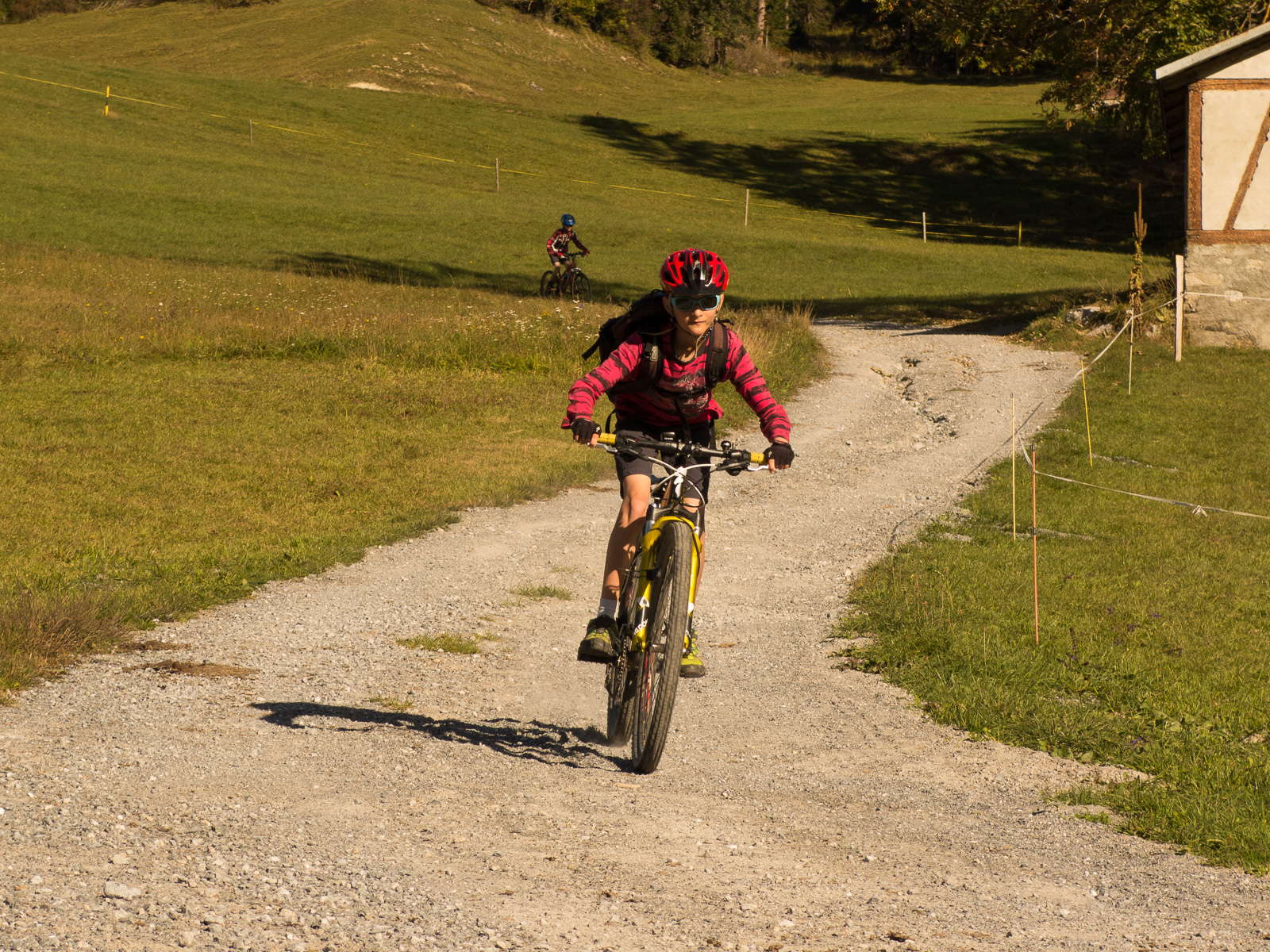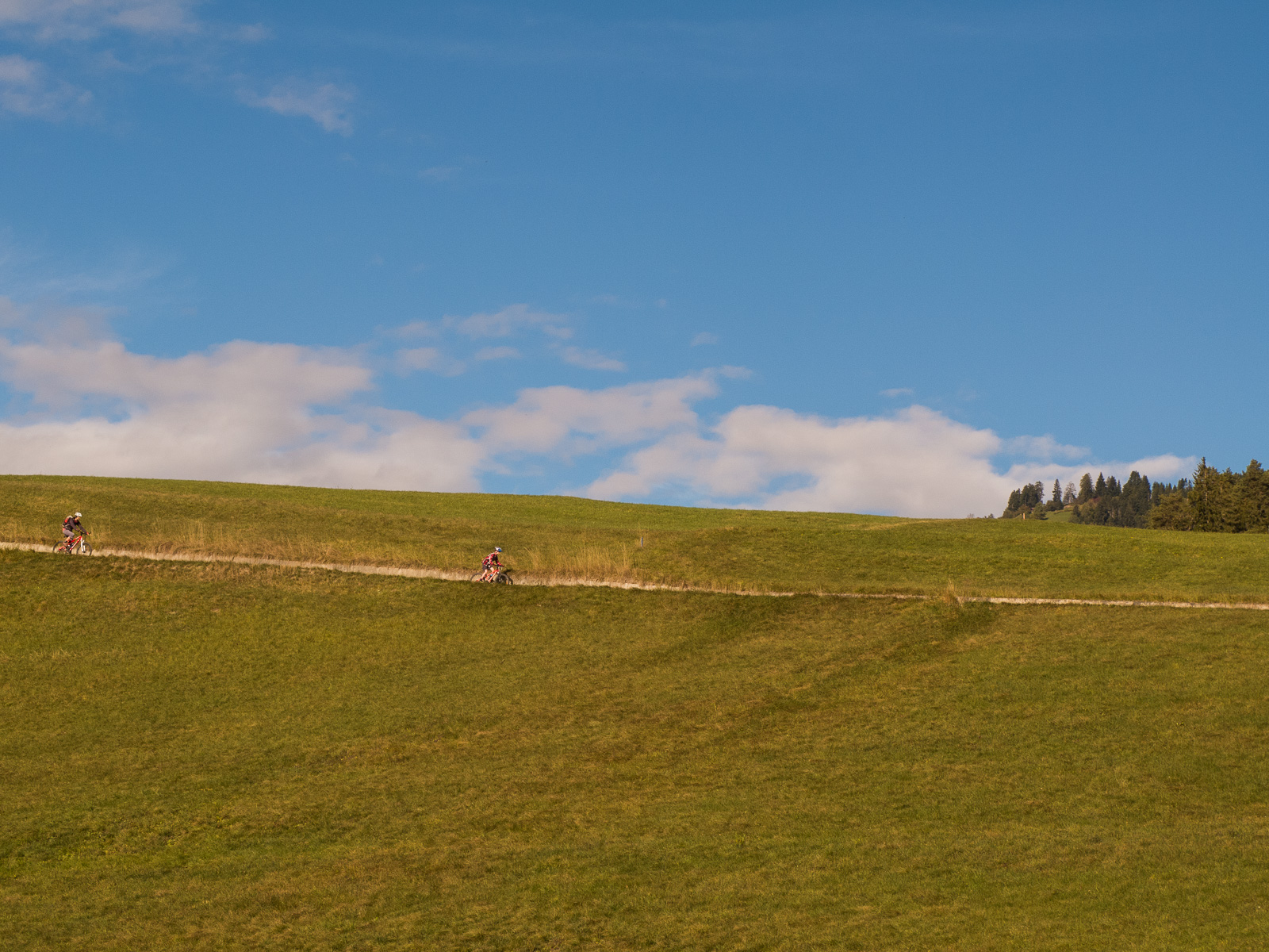 Nun fahren wir an der Sonne über eine Wiese (der Wanderweg führt da durch), diesmal die Kinder voraus, bis Planezzas Sut. Weiter hinunter nach Sagogn oder wieder hoch? Da es nach Sagogn nur noch Forststrassen und keine Singletrails mehr hat, wollen die Kinder wieder aufwärts. Wir fahren also ostwärts, erreichen die Route 260, der wir nun folgen. Wir sind wieder im Wald, es geht aufwärts, mal steiler, mal weniger, ab und an legen wir eine Pause ein. Nach der Umrundung geht es abwärts, wir kommen wieder zum Parkplatz bei der Brücke. Bei der Fahrt zurück nach Flims fahren wir auf dem Trottoir, und wieder überholt uns die Polizei…