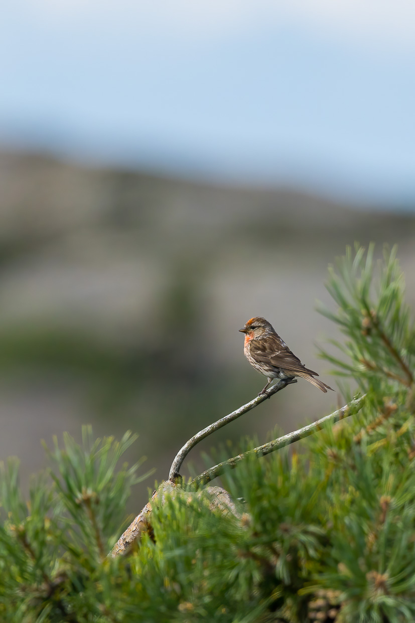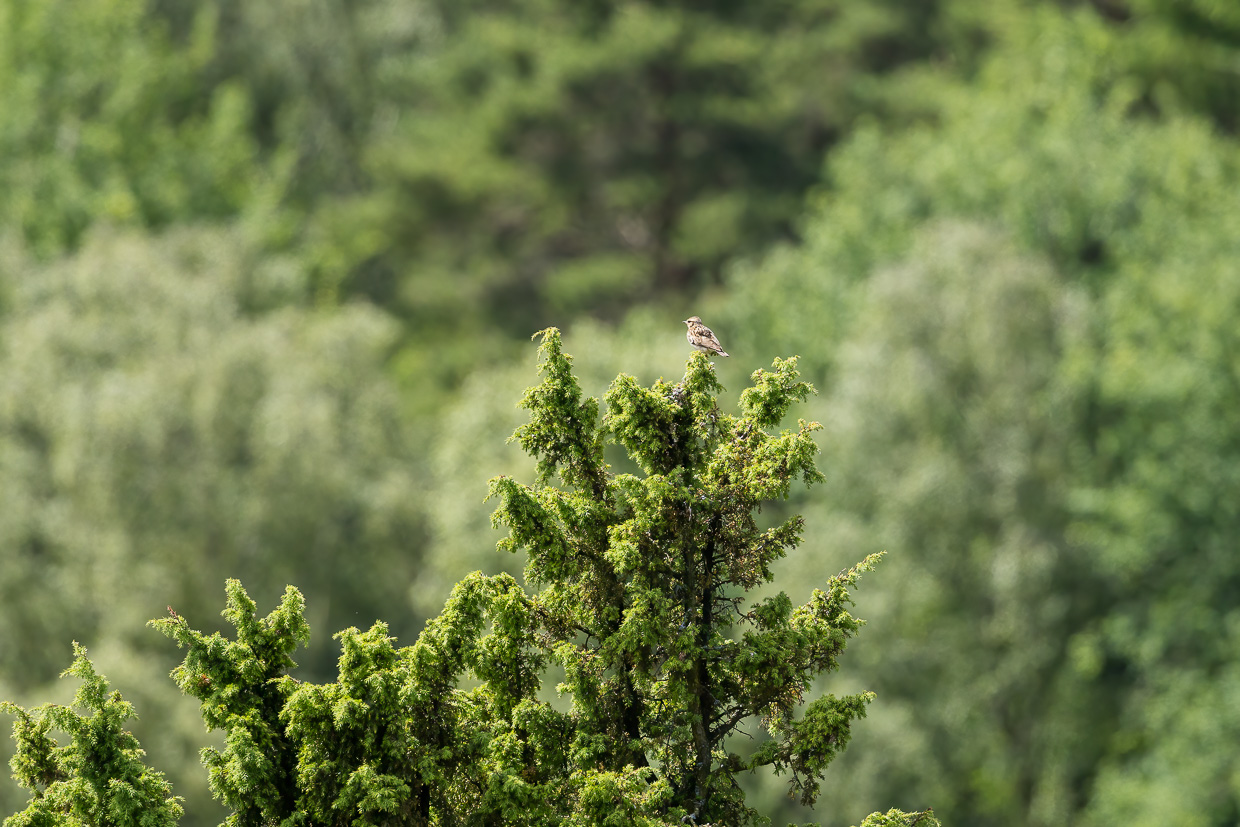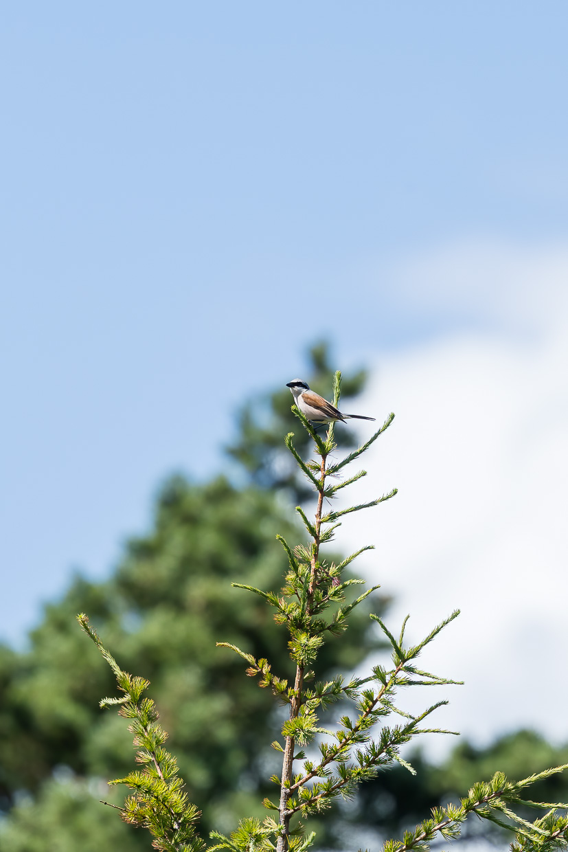 Wir gehen weiter und entdecken auf einer Lärche einen Neuntöter. Im Schatten legen wir eine Pause ein, dabei können wir Fitisse, Tannenmeisen, Kohlmeisen und andere beobachten.