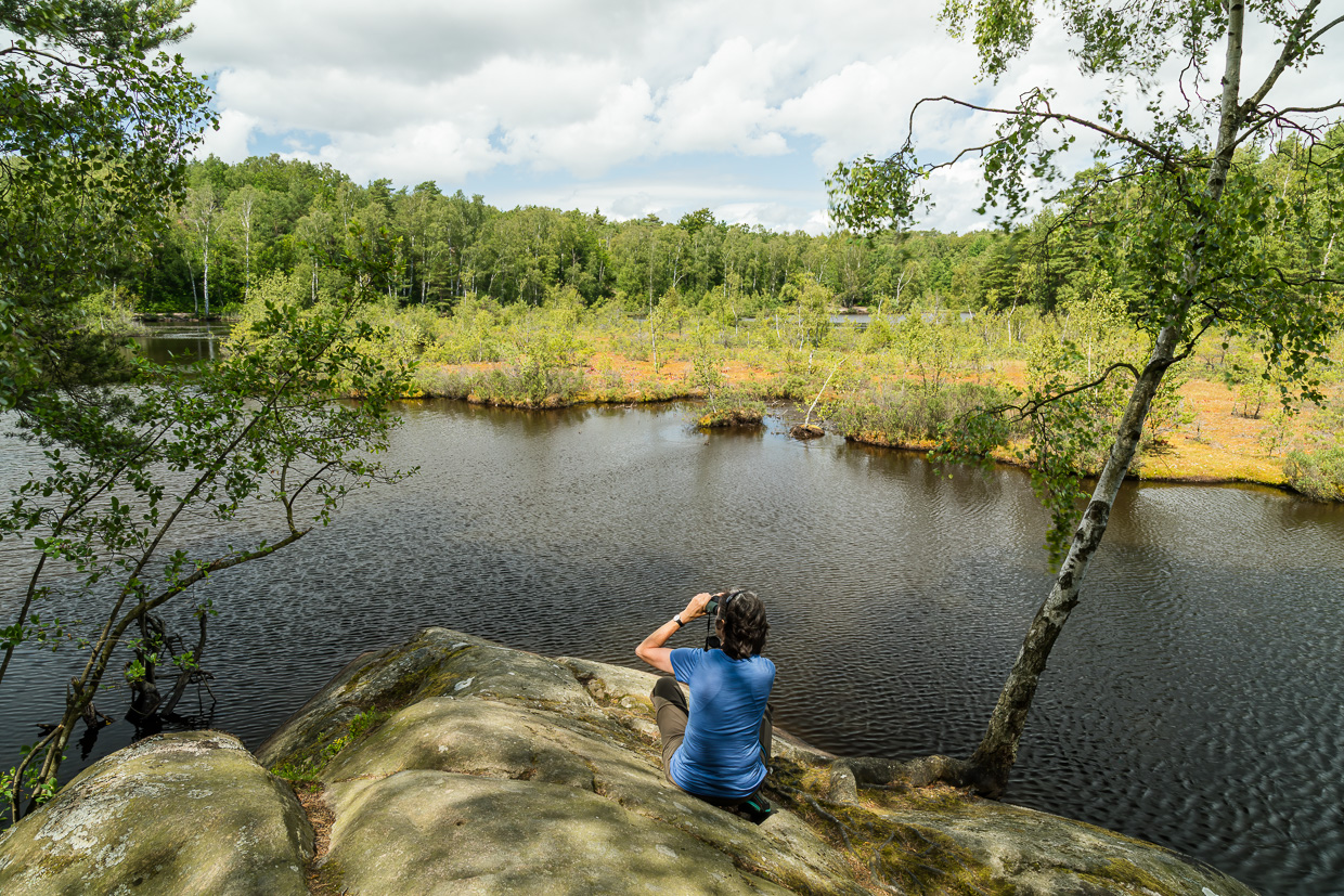 Der Start der Wanderung ist bei einer Klinik, durch ein Gatter betreten wir den Wald und sind – zack – in einer anderen Welt, weg vom Grossstadttrubel. Wir durchwandern mit offenen Ohren und Augen den Wald, kommen an einen kleinen See. Dort schwimmen zwei Entenküken. Was könnten das für welche sein? Wir rätseln, konsultieren den Svensson und kommen zum Schluss: Das sind Schellenten. Von der Mama ist allerdings keine Spur zu sehen (den Papa braucht es sowieso nicht). Der Wald wird lichter, der Boden karger, bis wir eine Hochebene erreichen mit Heide. Der Blick schweift aufs Meer hinaus. Wir hören einen feinen Gesang, den wir der Heidelerche zuordnen. Sie sitzt in einem Strauch, daneben singt eine Goldammer.