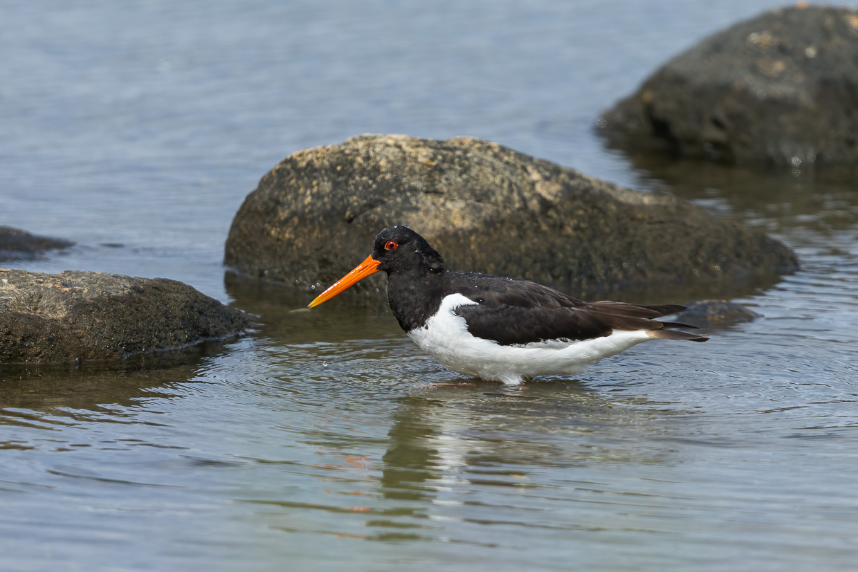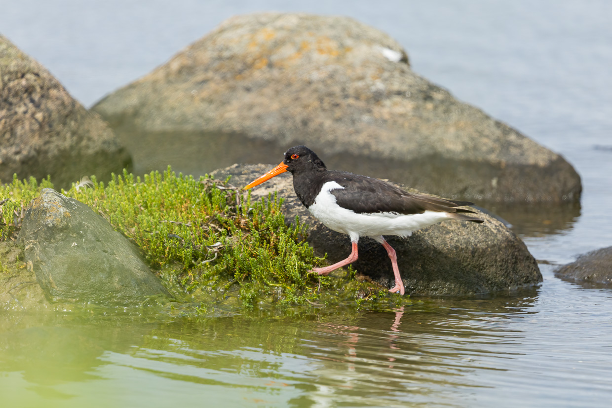 Nach einer Weile kehren wir zurück und fahren in die Marina von Öckerö, wo es Kaffee und Kuchen gibt. Auf dem Rückweg entdeckt die Frau aus dem Auto einen Vogel, der uns sofort zum Halten am nächstmöglichen Ort veranlasst. Wir kehren zu Fuss zurück, ein Austernfischer stochert da im Wasser. Vorsichtig nähern wir uns, er lässt sich nicht stören. Was für eine schöne Beobachtung! Nach diesem Erlebnis steht uns der grösste Stress noch bevor: Nach Göteborg fahren und das Auto zurückgeben.