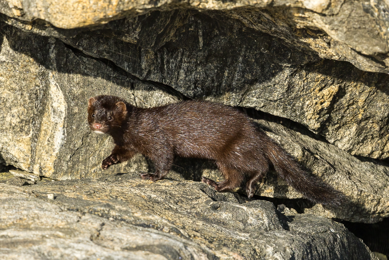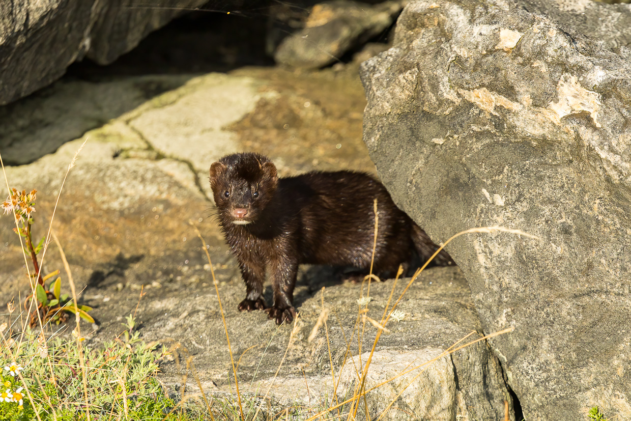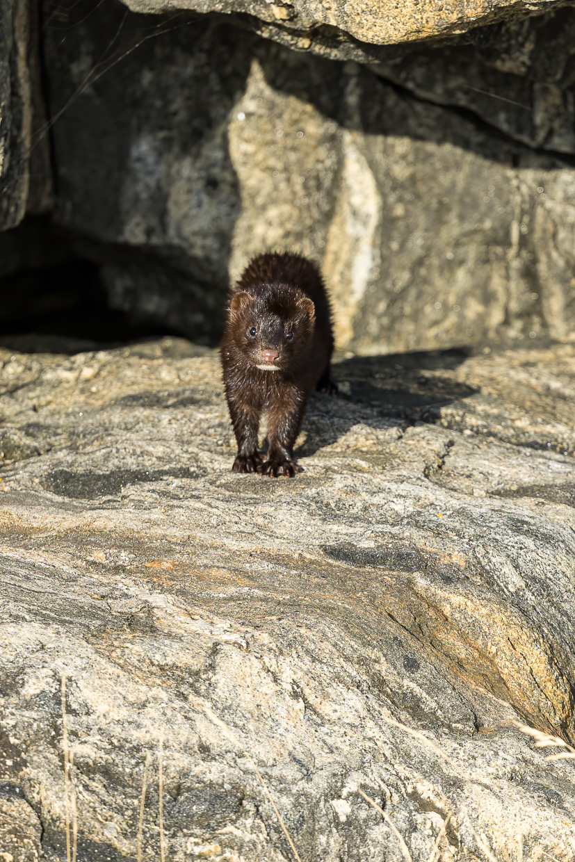 Etwas weiter draussen gibt es einen Hide, den wir aufsuchen. Dieser ist leider nicht so sauber wie der auf Klädesholmen und hier sehen wir noch weniger. Aber da, da huschte doch etwas über die Felsen? Ja, da, etwas Pelziges! Ein Fischotter? Wir eilen nach draussen und hoffen, dass das Tier wieder auftaucht. Tatsächlich, da ist es, ein kleines, marderartiges Tier. Ich kann es gut fotografieren, so dass die Identifikation leicht fällt. Nach einer kurzen Recherche ist klar: Es handelt sich um einen Mink oder Amerikanischen Nerz. Dieser ist ein Neozooe und gehört nicht hier hin, süss ist er trotzdem.
