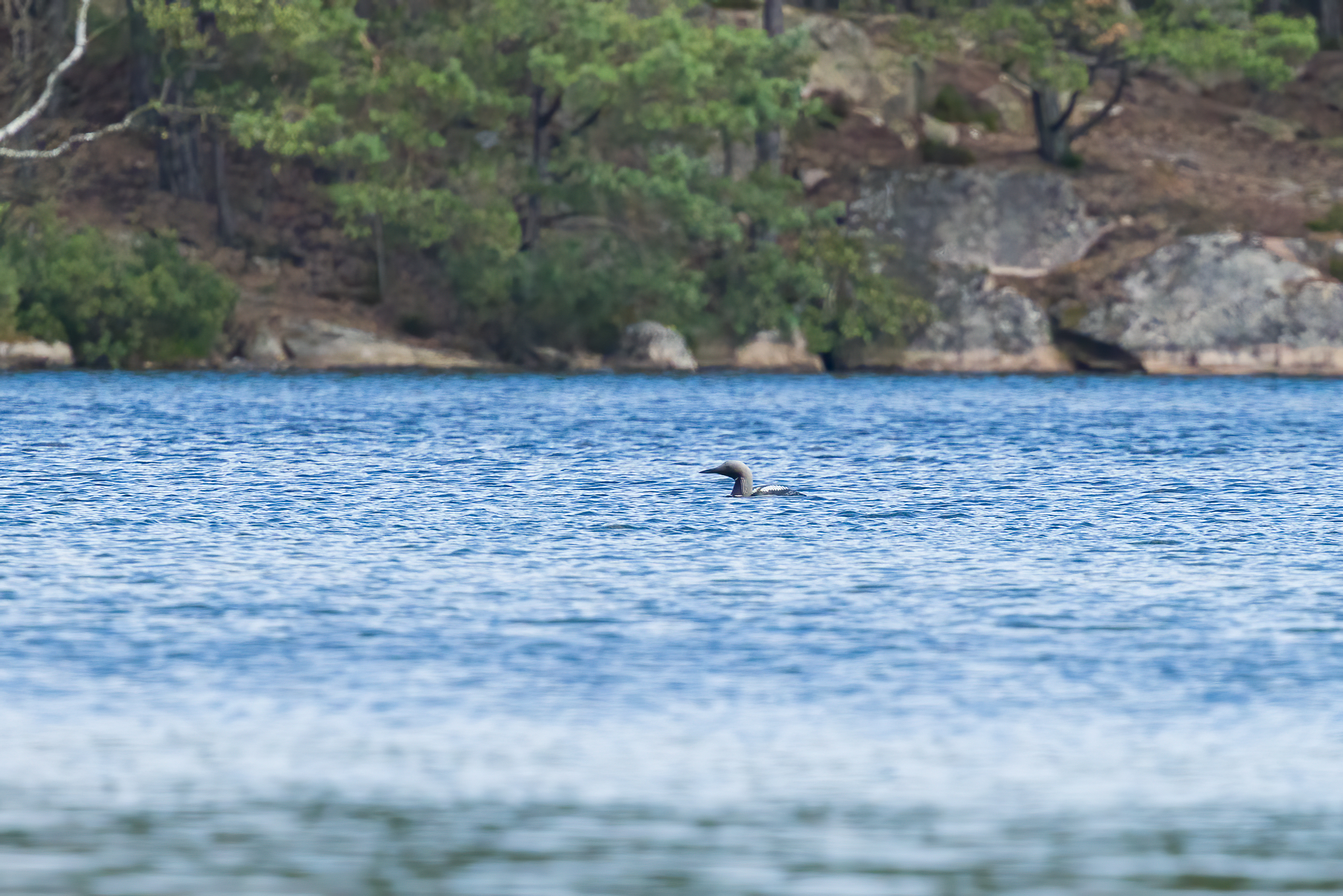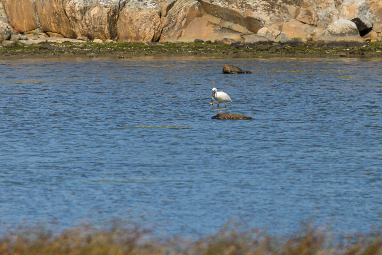 Gemäss birdingplaces.eu soll es hier Prachttaucher geben. Und, Bingo! Wir entdecken einen, allerdings ziemlich weit weg. Wie es bei den Seetauchern üblich ist, sehen wir ihn jeweils nur ganz kurz, dann taucht er sofort wieder ab. Und kommt irgendwo ganz anders wieder an die Oberfläche. Man muss ein ziemlich grosses Gebiet absuchen, um ihn nicht zu verpassen.