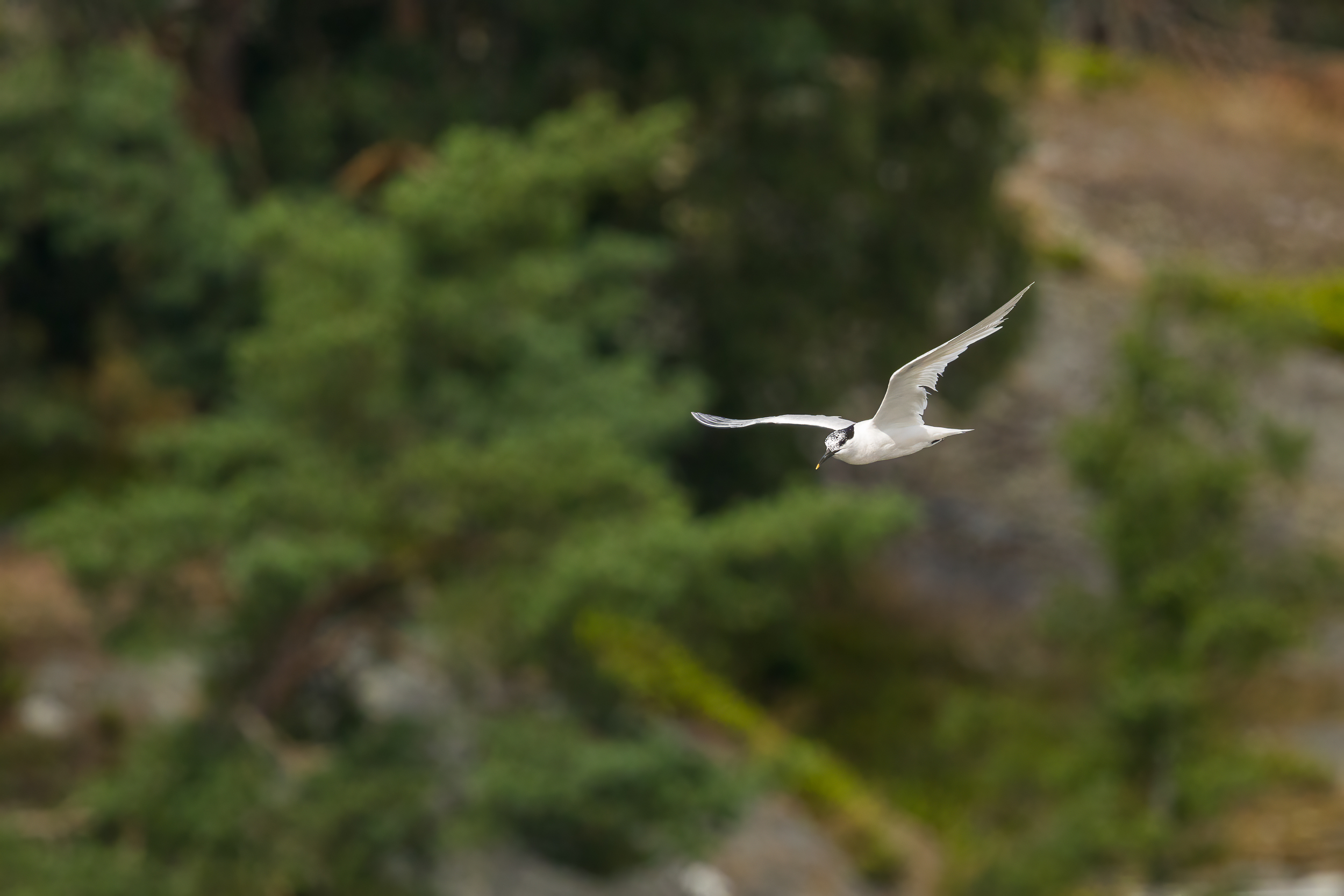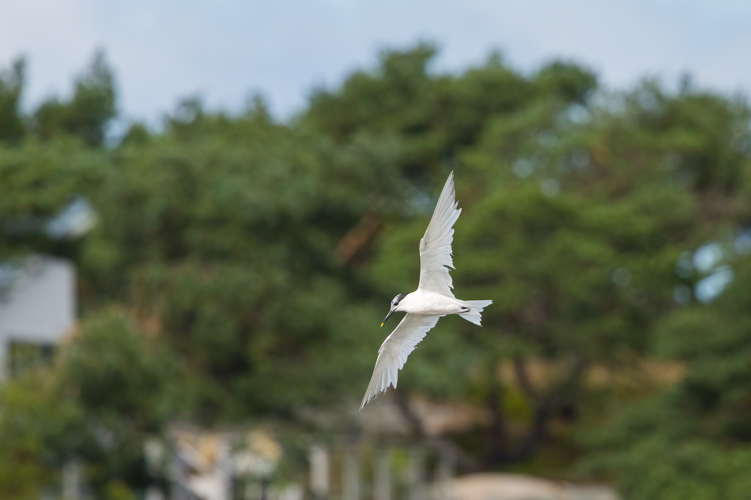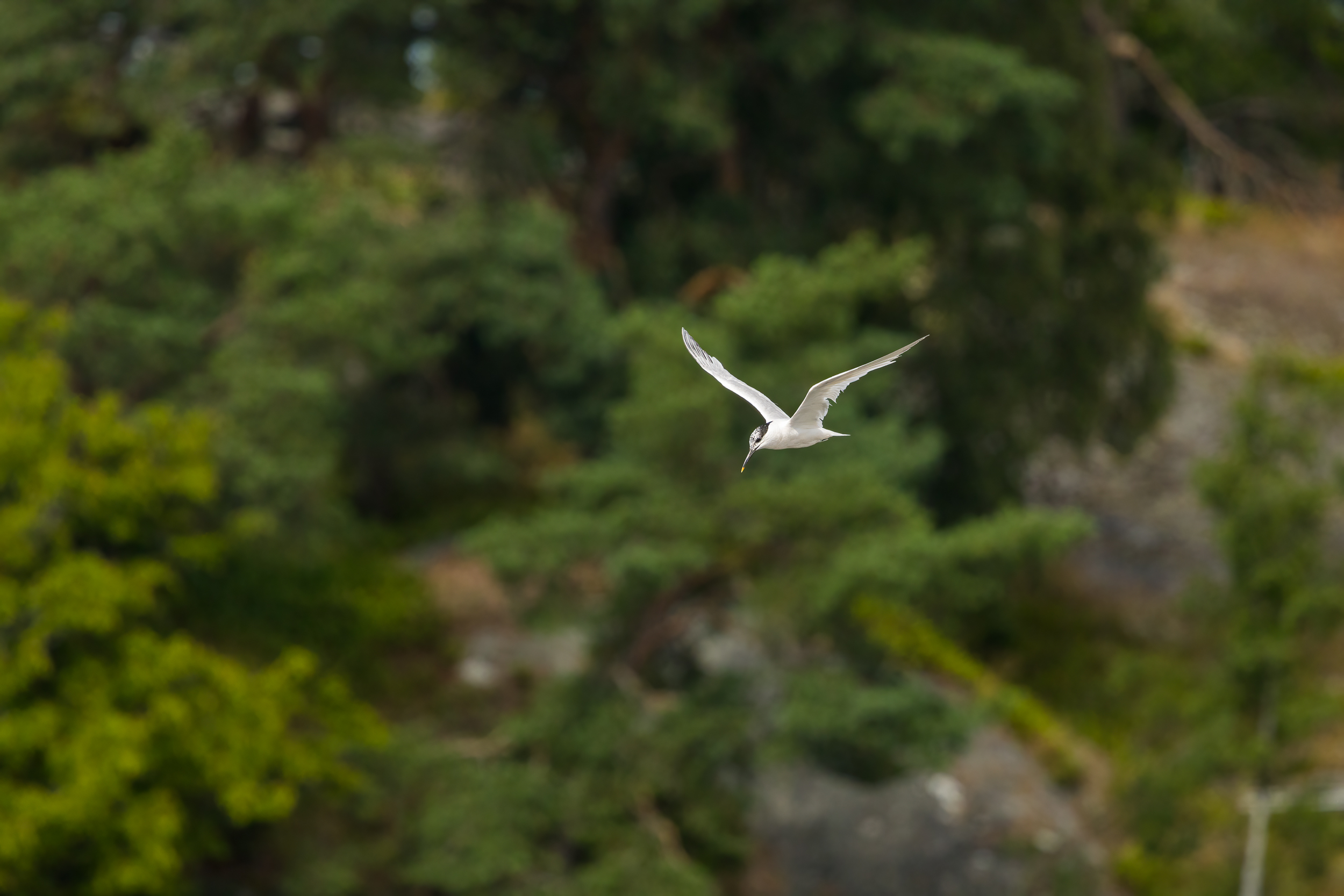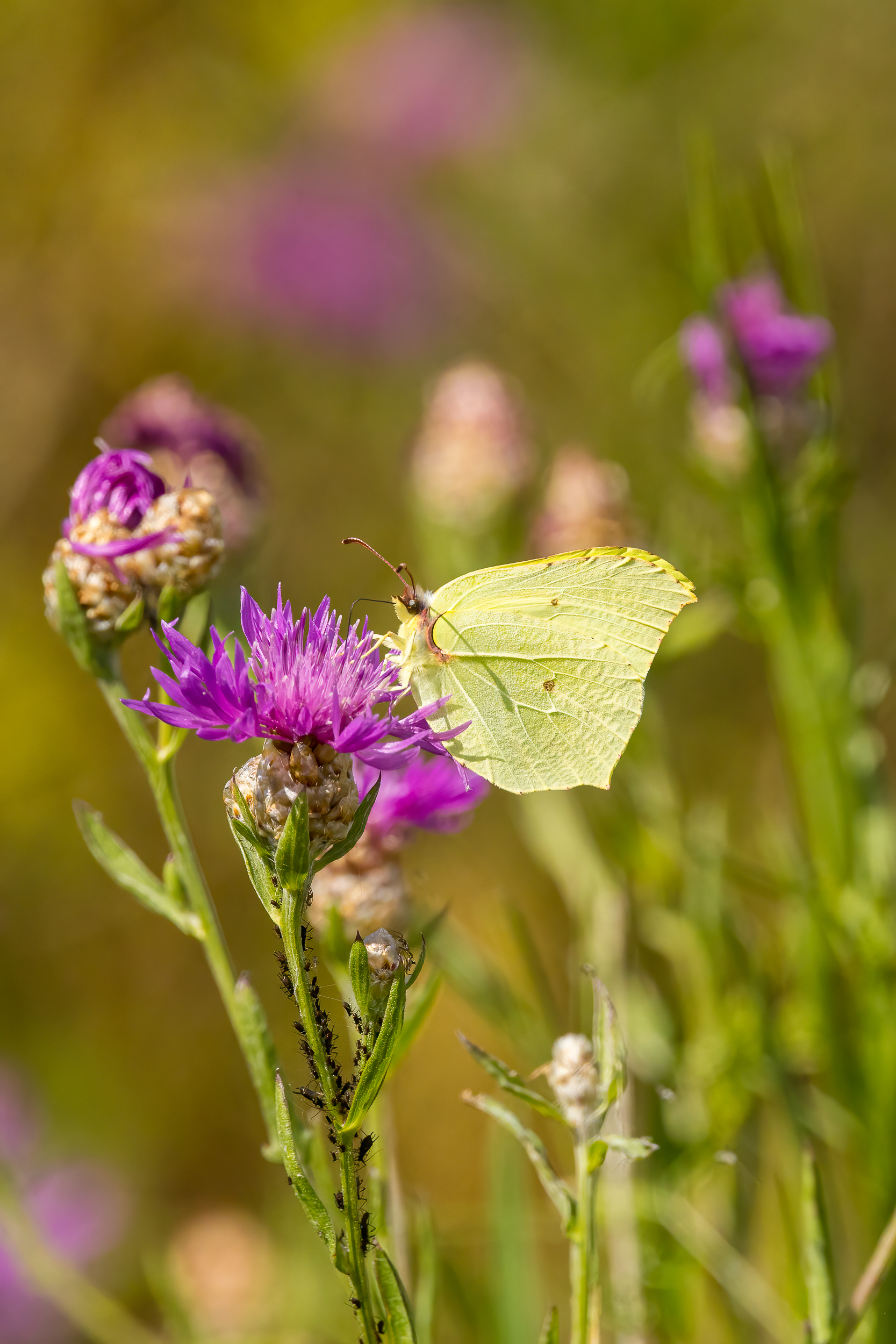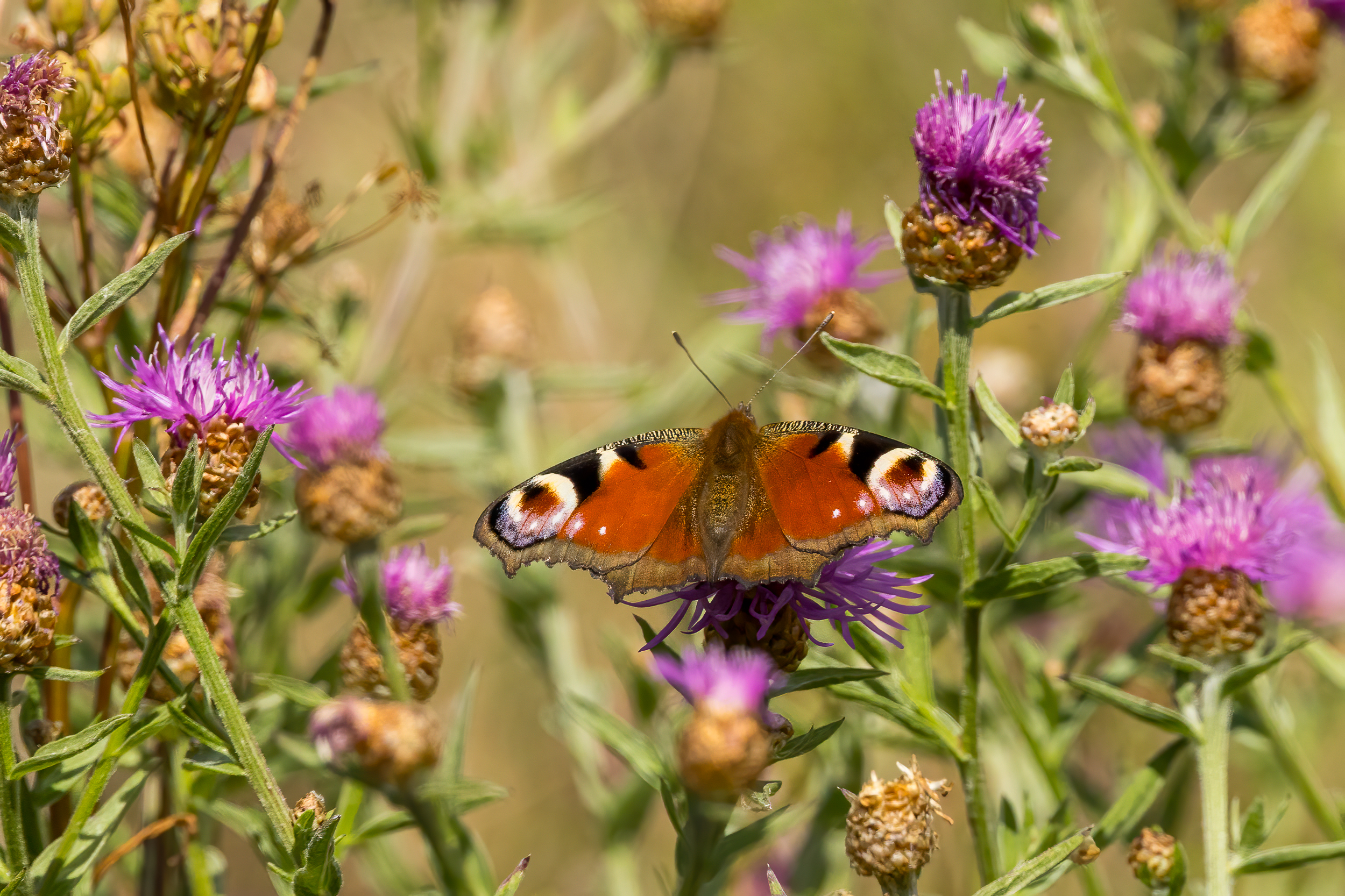 Wir gehen weiter auf dem Trampelpfad, der auch mitten durch eine Kuhherde führt. Ein Neuntöter fliegt vor uns auf und verschwindet in einem Busch. Ein Abstecher ans Gewässer bleibt erfolglos, wir sehen hier nicht mehr. Also gehen wir weiter, vorbei an einer blütenreichen Brachfläche, wo sich Schmetterlinge tummeln. Ein grosser Felsen verspricht Aussicht und Kraxelspass, den wir uns natürlich nicht entgehen lassen. Von dort oben sehen wir wieder nur Enten und Kormorane. Wir steigen wieder ab, gehen Richtung mehr weiter. Dort entdecken wir einen eleganten weissen Vogel: Eine Brandseeschwalbe! Diese haben wir letztes Jahr in der Camargue zum ersten Mal gesehen, wir freuen uns auch hier wieder über Sichtung, diesmal sind sie im Prachtkleid.