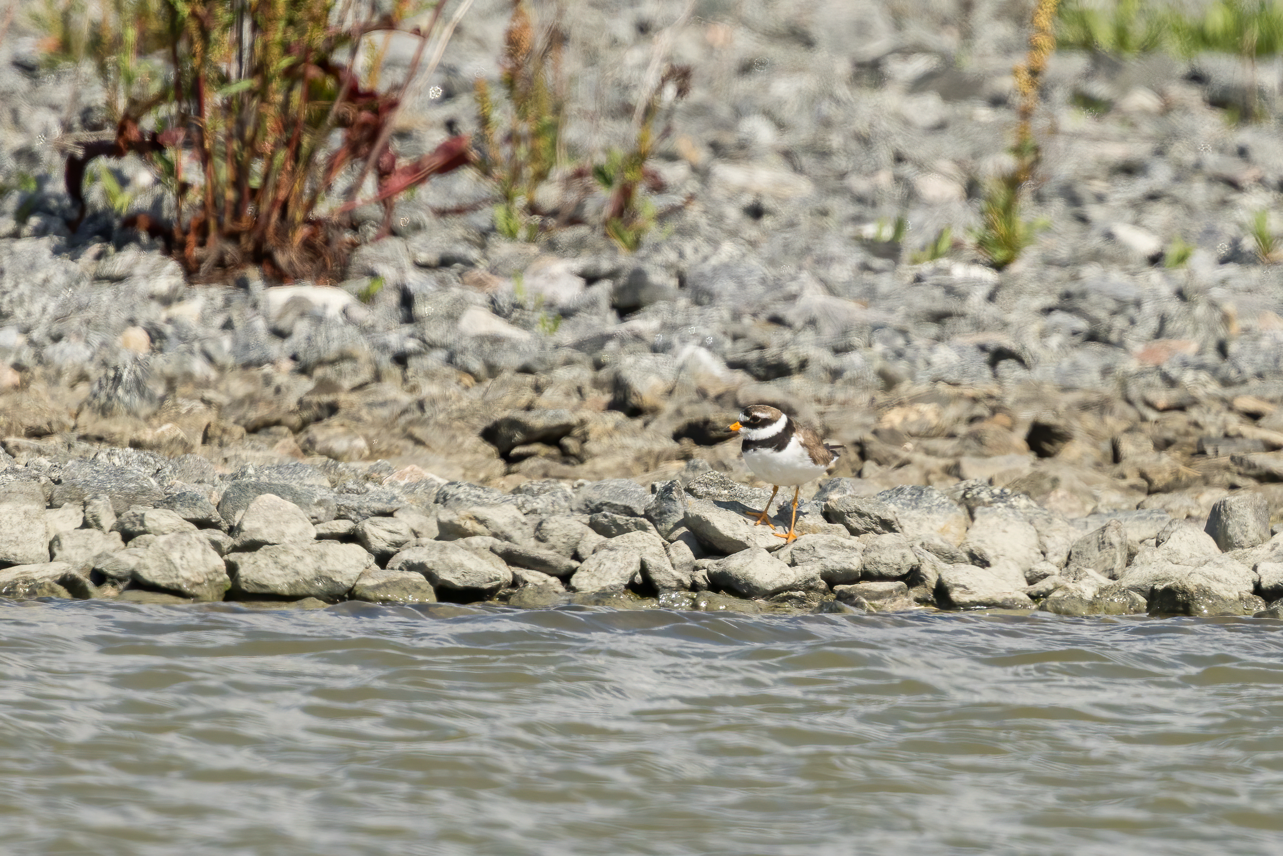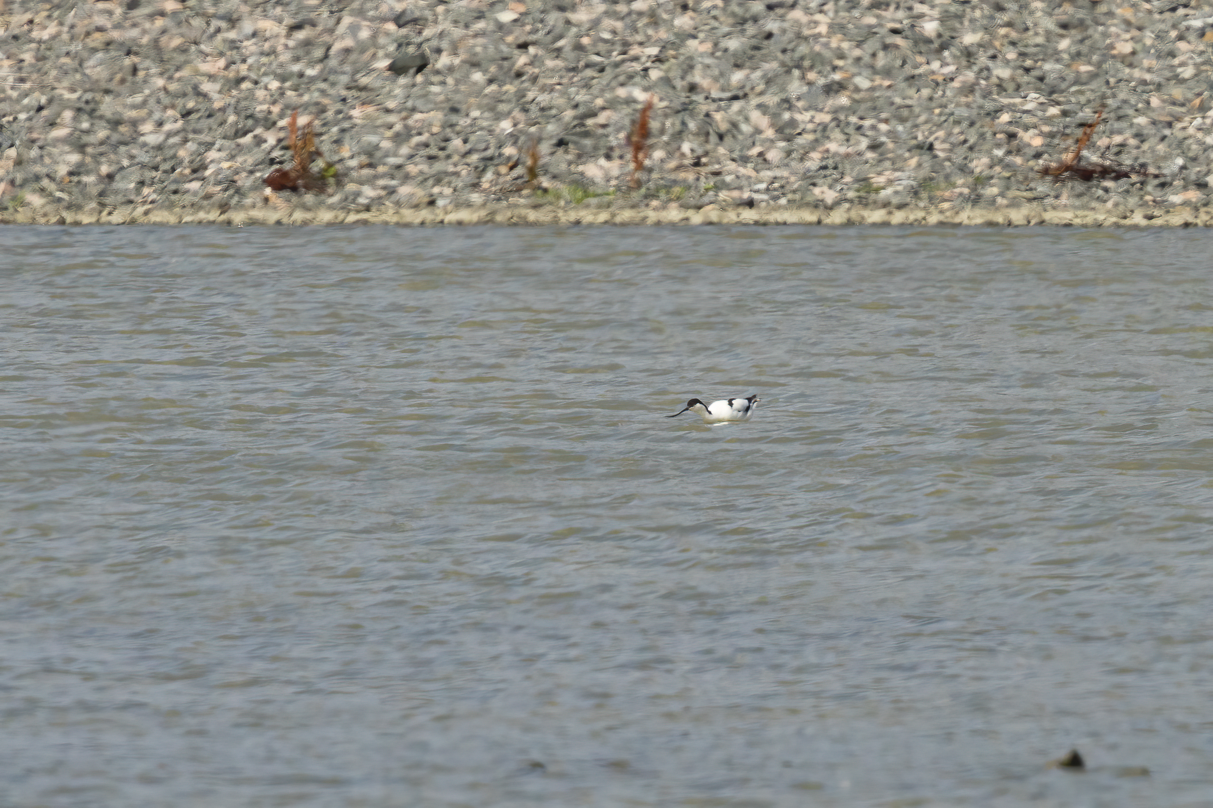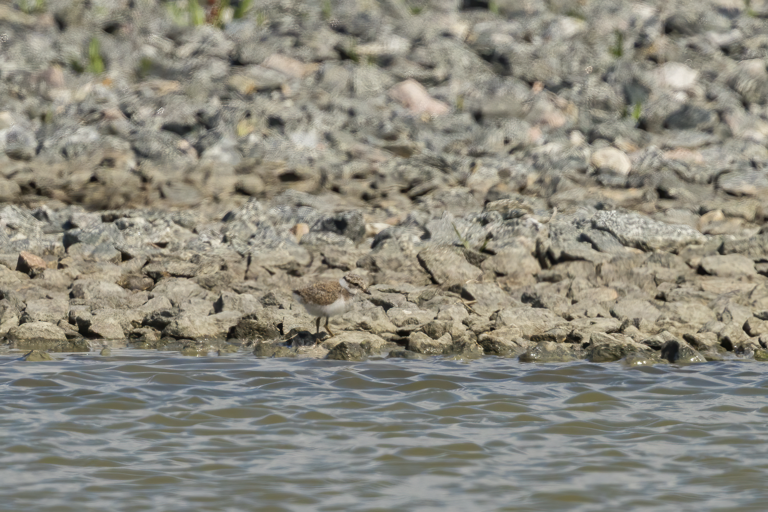 Wir gelangen an ein grosses Becken mit viel Kiesfläche, das relativ neu aussieht. Das scheint der interessanteste Part zu sein, es sind noch andere Birder da. Sturm- und Lachmöwen tummeln sich da, aber auch wieder Brandseeschwalben. Auch ein Rotschenkel und ein Alpenstrandläufer halten sich unter ihnen auf. Am Wasserrand wuselt ein Federbällchen umher, ein kleiner Sandregenpfeifer, der Altvogel tummelt sich in der Nähe. Plötzlich ein ein schwarz-weisser Vogel angeflogen, ein Säbelschnäbler.