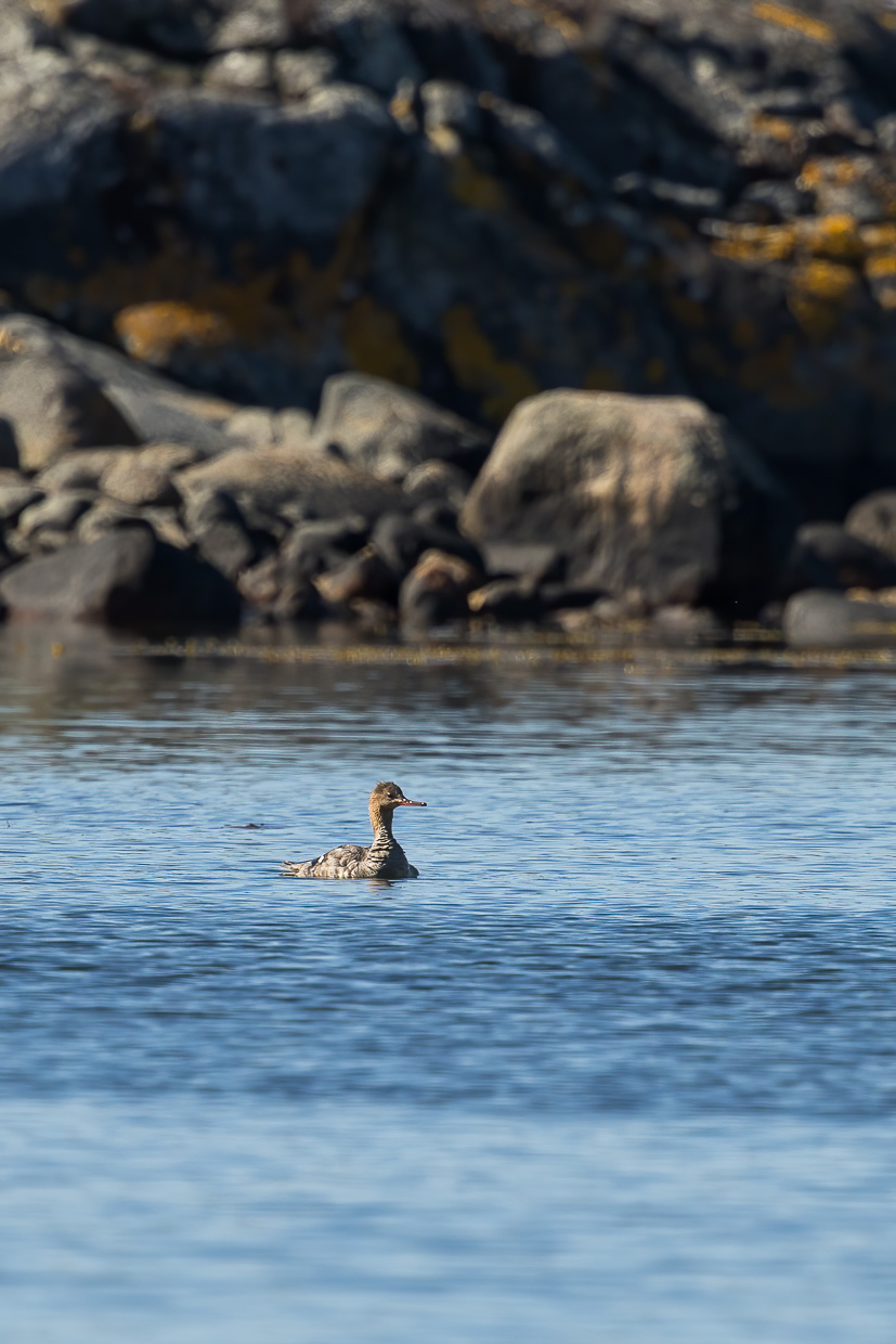 Am Ufer legen wir eine Rast ein, gucken aufs Wasser. Da kommt eine Mittelsäger-Familie angeschwommen. Die Kleinen tauchen bereits wie die Grossen, zack, kopfvoran ins Wasser. Nun interessiert uns aber die weglose Halbinsel. Wir gehen dem Ufer entlang, entdecken einen dieser Unterstände, wie man sie auf den Fernwanderwegen in Schweden öfters findet. Das Meer ist glatt, es ist heiss. Wir suchen einen Schatten spendenden Baum auf wo wir rasten. Dabei entdecken wir einen Vogel, den wir hier nicht erwartet hätten: Einen Alpenbirkenzeisig.