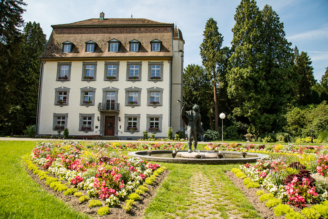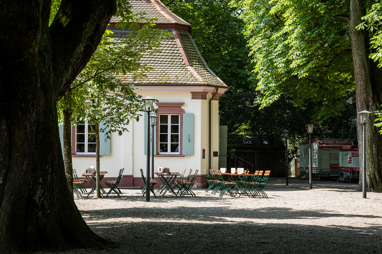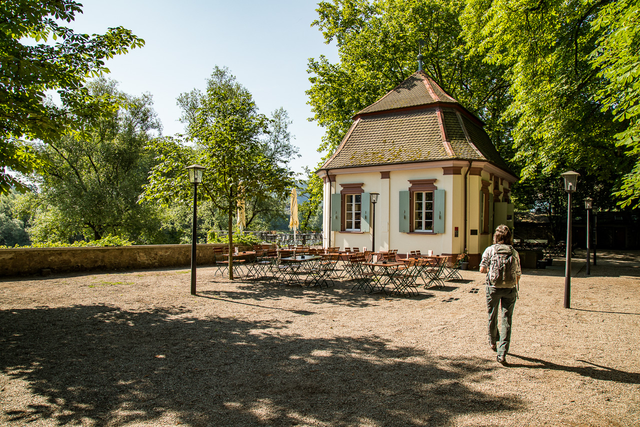 Direkt am Rheinufer soll es ein gemütliches Café geben. Als wir dort vorbeikommen, hat es aber noch geschlossen, die Bar öffnet erst abends. Also gehen wir in den Park von Schloss Schönau. Dort steht das Teehäuschen, das 1720 als Teil der Schlossanlage im Barockstil erbaut wurde. Heute ist es ein gemütliches Café, an dem man unmöglich vorbei kann, ohne einen Kaffee oder sonstwas genossen zu haben. Grosse Bäume im Park spenden Schatten, Blumen bezaubern die Besucher.