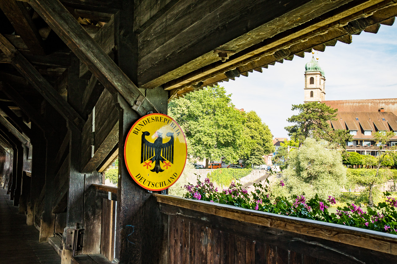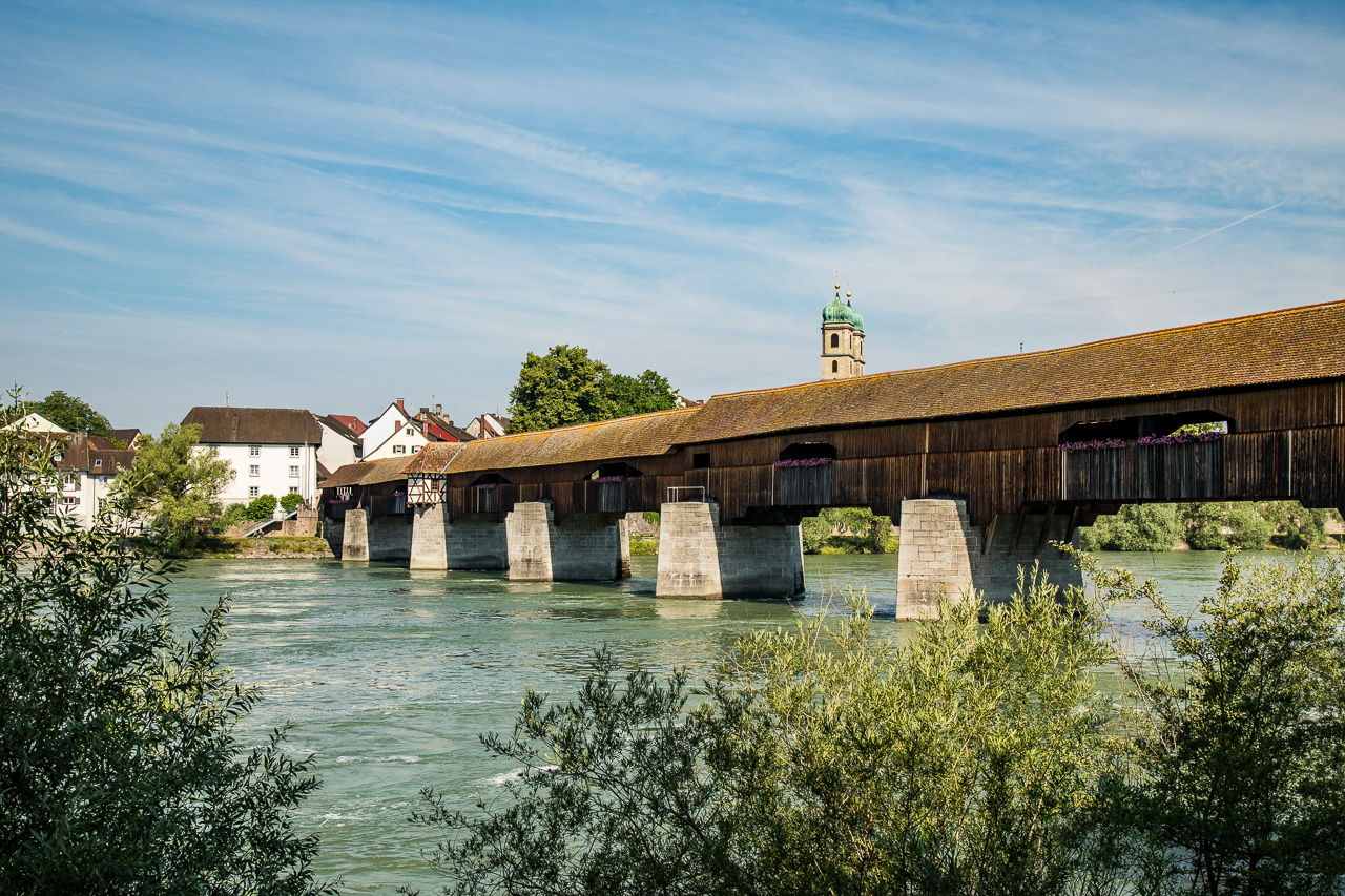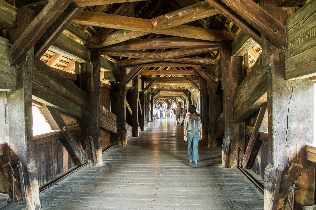 Ich habe keine Ahnung, wo es hin geht, werde sozusagen entführt, aber glücklicherweise von der Frau. Wir steigen in Aarau ins Postauto, also geht es schon mal nicht in die Berge, aber über den Jura nach Frick. Mit dem Zug fahren wir noch eine Station weiter bis Stein AG und steigen hier aus. Was es hier wohl gibt? Nein, Stein ist noch nicht Endstation, wir gehen zu Fuss weiter. hinunter an den Rhein, wo eine Holzbrücke denselbigen überspannt. Wir überqueren diese und allmählich wird klar, wo wir landen: In Bad Säckingen, einem hübschen Städtchen in Baden (also dem ehemaligen Grossherzogtum Baden). Die Brücke ist die längste gedeckte Holzbrücke von Europa und über 400 Jahre alt. Bis in die Siebziger Jahre des vorigen Jahrhunderts quälte sich der motorisierte Verkehr durch das Städtchen und über die Brücke, seither gehört sie den Fussgängern und Velofahrern.