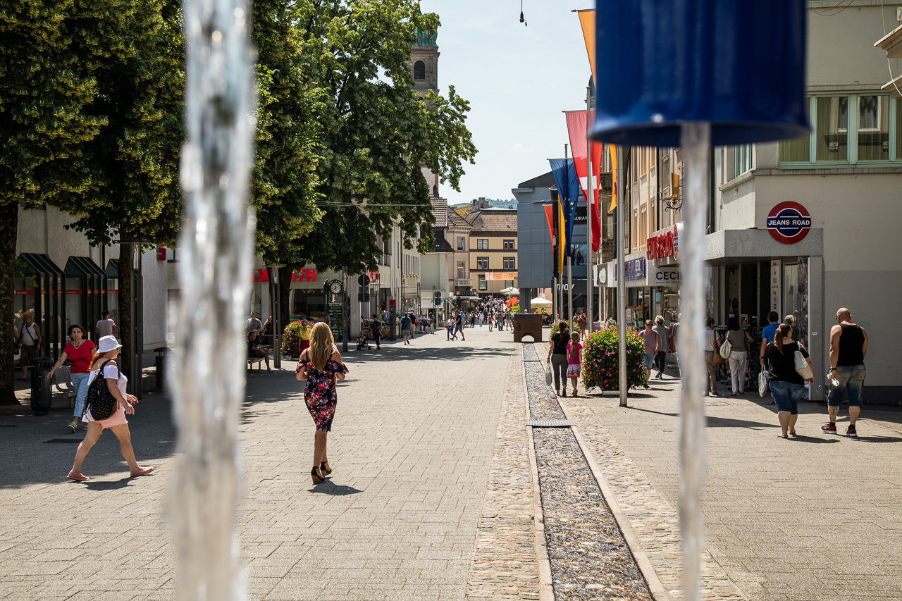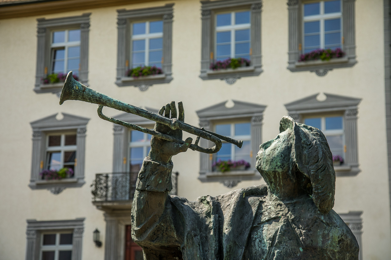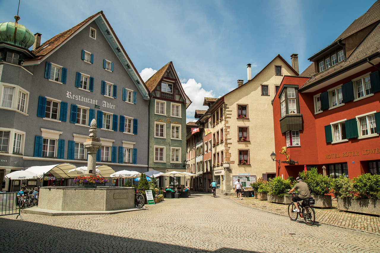 Das Städtchen hat hübsche und vor allem autofreie Gassen, wo es sich gemütlich schlendern lässt. Jede Menge Restaurants und Cafés laden zum Pausieren ein, Eisdielen bieten transportable Kühlung en passent. Auf dem Platz vor dem Fridolinsmünster, der Stadtkirche mit den zwei Türmen, findet gerade ein Markt statt. Wir spazieren durch verschiedene Gassen, geniessen die entspannte Atmosphäre. Wir wollen aber auch noch die Umgebung kennen lernen und ziehen nordwärts. Dabei passieren wir angedeutete Brückenköpfe. Sie symbolisieren den Ort, wo einst die zweite Brücke gestanden hat, denn Bad Säckingen lag bis 1830 auf einer Insel im Rhein. Um Land zu gewinnen, wurde der eine Arm zugeschüttet.