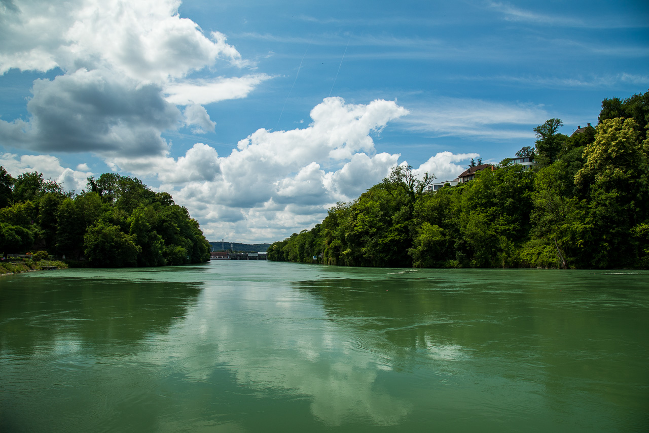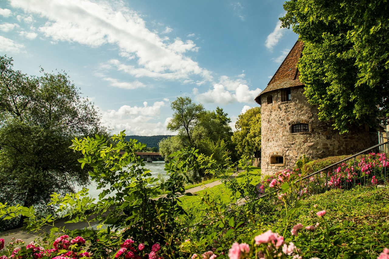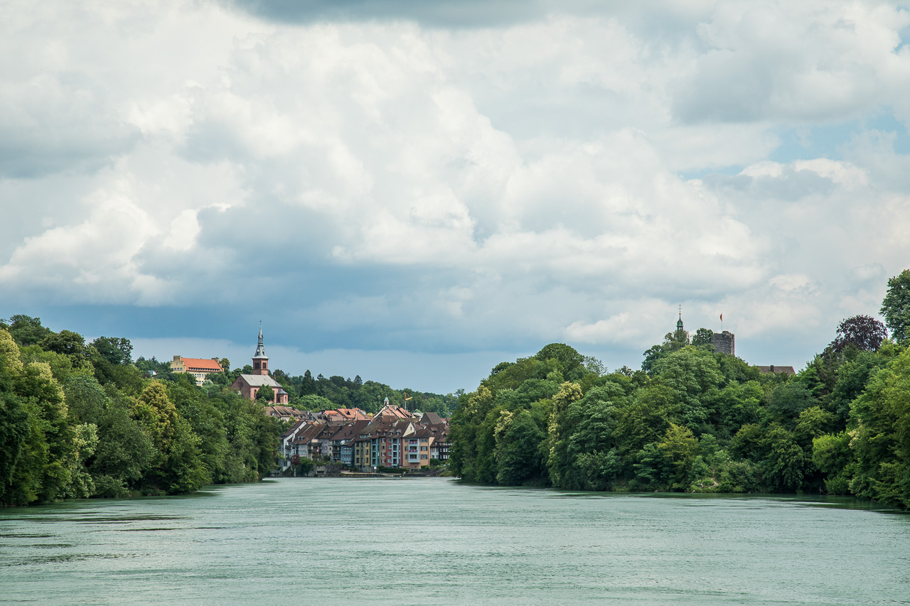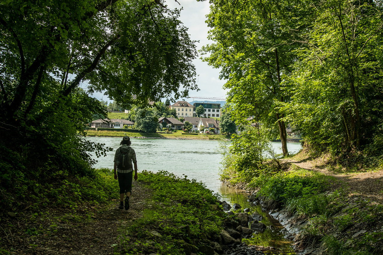 Am nächsten Morgen starten wir zur Wanderung dem Rhein entlang. Es ist viel los in Bad Säckingen, denn heute ist der Slow-Up Hochrhein zwischen Stein AG und Laufenburg. Dieser Langsamverkehrevent findet während der wärmeren Jahreszeiten an verschiedenen Orten in der Schweiz statt. Wir verzichten auf den Rummel und setzen unseren Weg zu Fuss fort, dem Rhein entlang. Und voilà, schon sind wir ganz alleine. Nur ganz selten kreuzen wir andere Personen. Der Weg verläuft meist direkt dem Fluss entlang, nur selten müssen wir einen Umweg machen.