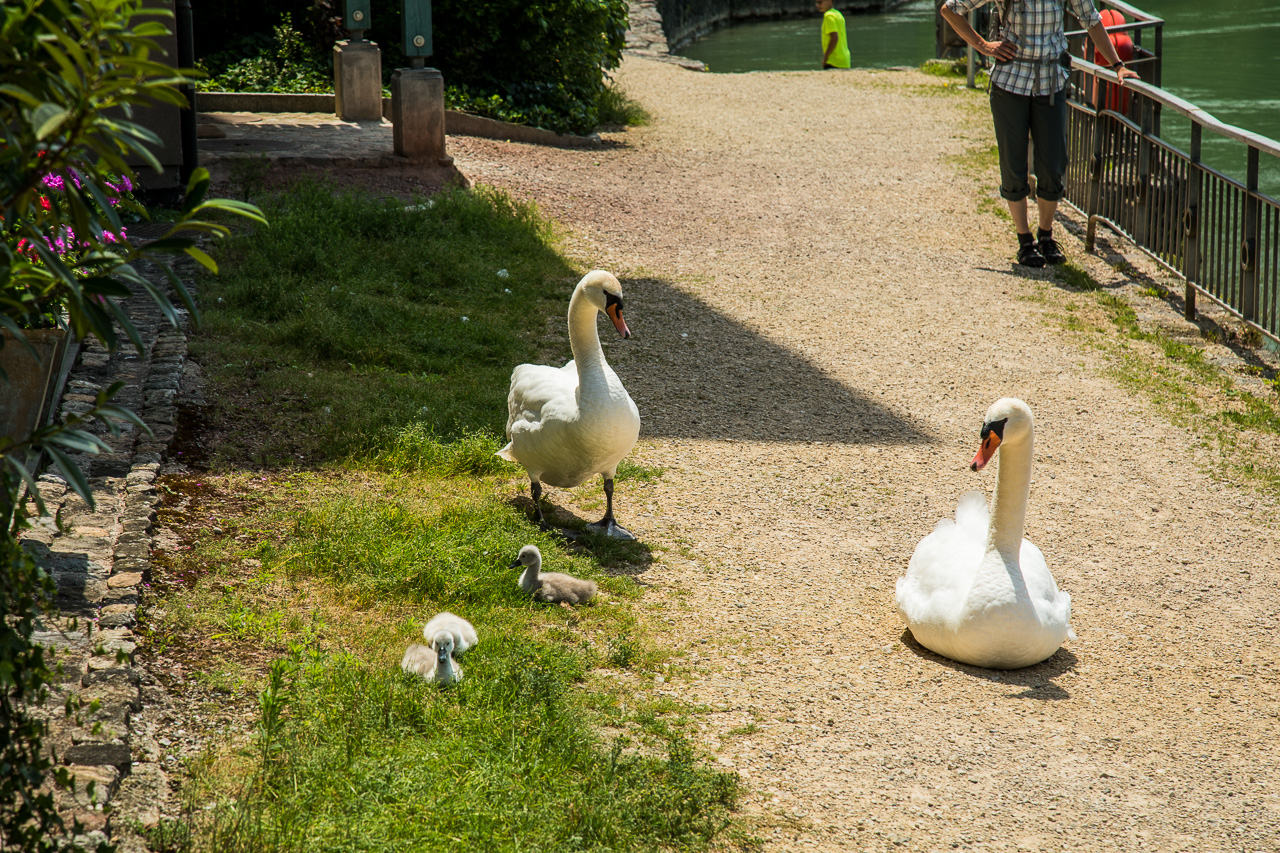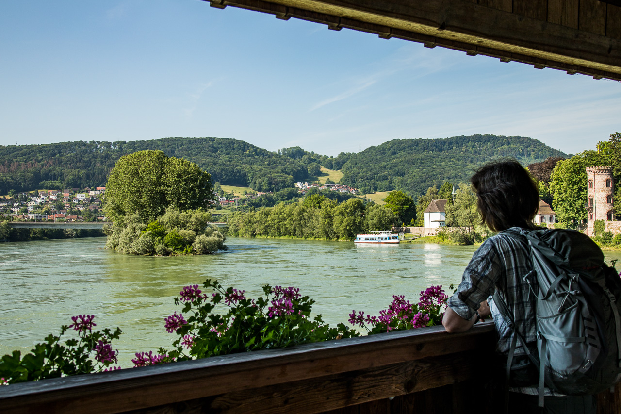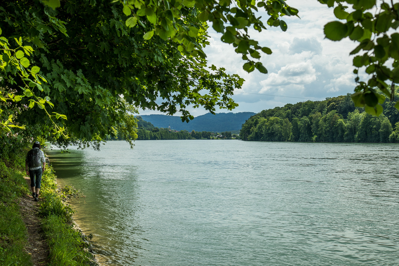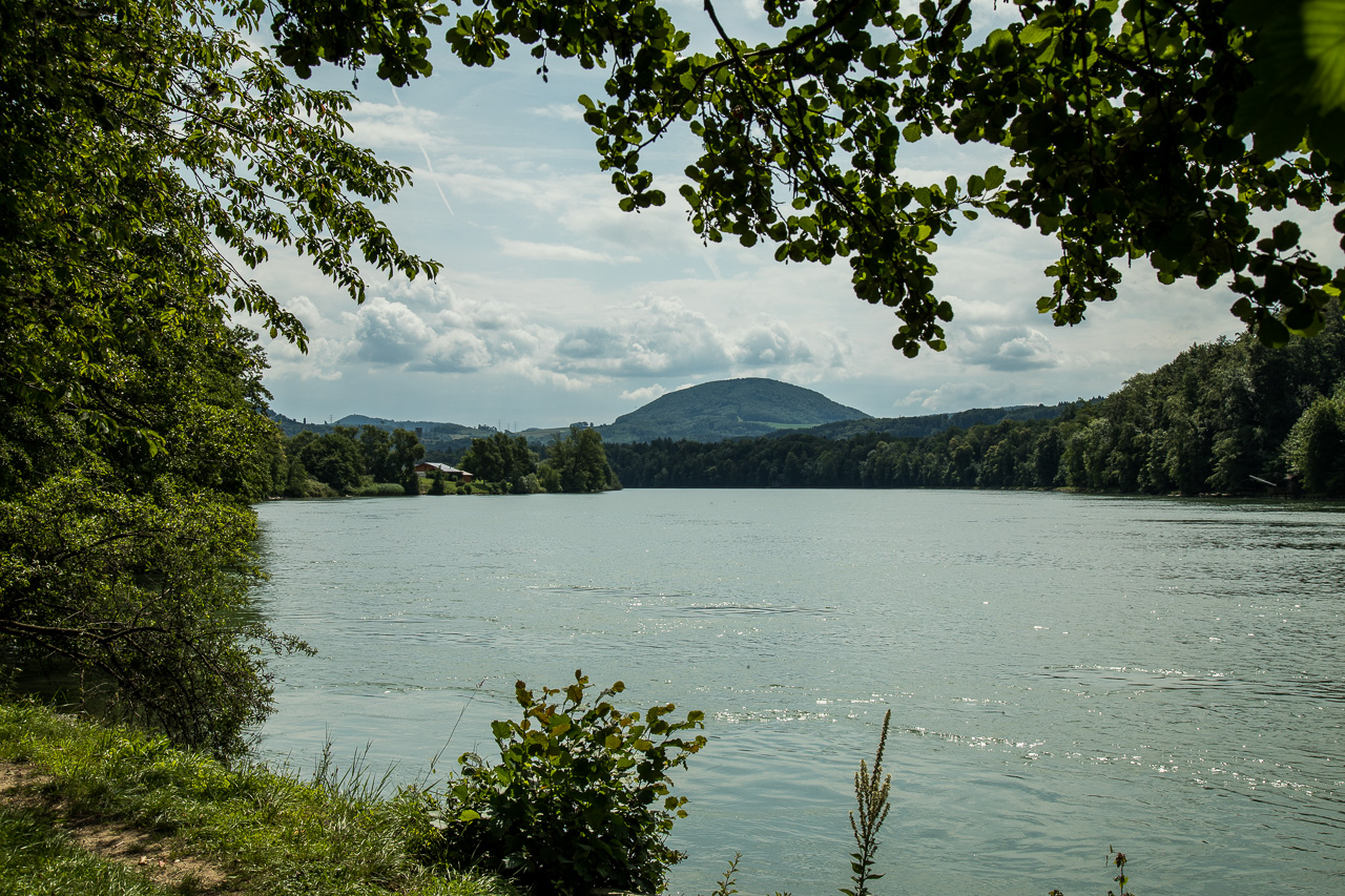 Am nächsten Morgen starten wir zur Wanderung dem Rhein entlang. Es ist viel los in Bad Säckingen, denn heute ist der Slow-Up Hochrhein zwischen Stein AG und Laufenburg. Dieser Langsamverkehrevent findet während der wärmeren Jahreszeiten an verschiedenen Orten in der Schweiz statt. Wir verzichten auf den Rummel und setzen unseren Weg zu Fuss fort, dem Rhein entlang. Und voilà, schon sind wir ganz alleine. Nur ganz selten kreuzen wir andere Personen. Der Weg verläuft meist direkt dem Fluss entlang, nur selten müssen wir einen Umweg machen.