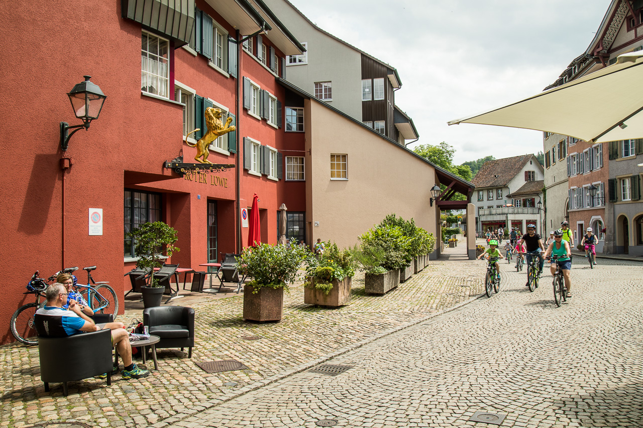 Es wird Zeit fürs Nachtessen. Zwar kann man auf Voranmeldung im Hotel essen, aber das wäre schade (Rösti gibt es zu Hause auch), bietet das Städtchen doch so viel. Wir ziehen also nochmals los und suchen uns ein Lokal. Wir wählen die „Alte Zunft“ in einer der Gassen. Die Stimmung ist entspannt, überall laufen Fernseher (es ist Fussball-WM). Das Essen ist währschaft und gut, der Preis angemessen. Auf dem Verdauungsspaziergang durchwandern wir nochmals die Stadt und schlendern ein Stück den Rhein abwärts, geniessen die Atmosphäre. Mit Dessert und Kaffee beschliessen wir den Rundgang, bevor wir ins Hotel zurückkehren.