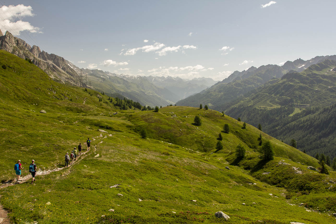 Wir trennten uns nun auf, ein Teil machte sich auf zum Passo di Manio, Fabian (er hat Knieprobleme wegen des Wachstums, ihr kennt das) und ich begaben uns direkt zur Pianseccohütte. Der Weg war sehr schön, kurz vor der Hütte machten wir eine tolle Entdeckung: Ein Braunkehlchen, ein leider sehr selten gewordener Wiesenbrüter in der Schweiz! In der Hütte, die genau an der Waldgrenze liegt, stillten wir unseren Durst, bevor wir nach All’Acqua zu unserer Unterkunft abstiegen. Derweil hatten die anderen den Chüebodengletscher erreicht, oder besser das, was davon übrig geblieben ist. Die Zeichen sind untrüglich, die Klimaerwärmung schreitet unbarmherzig voran und lässt die Gletscher schwinden. Über den Gerenpass stiegen sie auf steilen Wegspuren ab zur Pianseccohütte und nach der Pause ebenfalls zu uns hinunter.