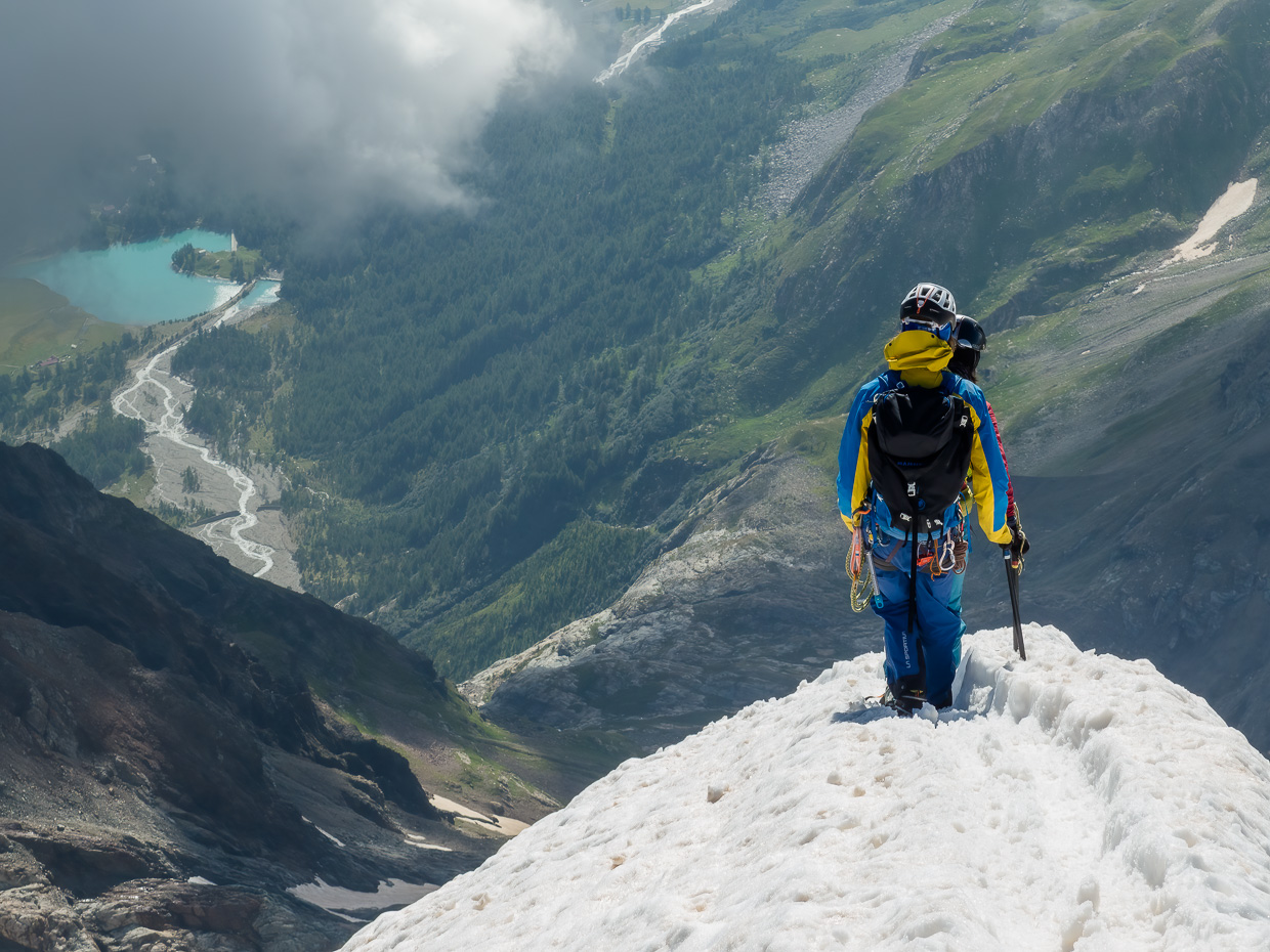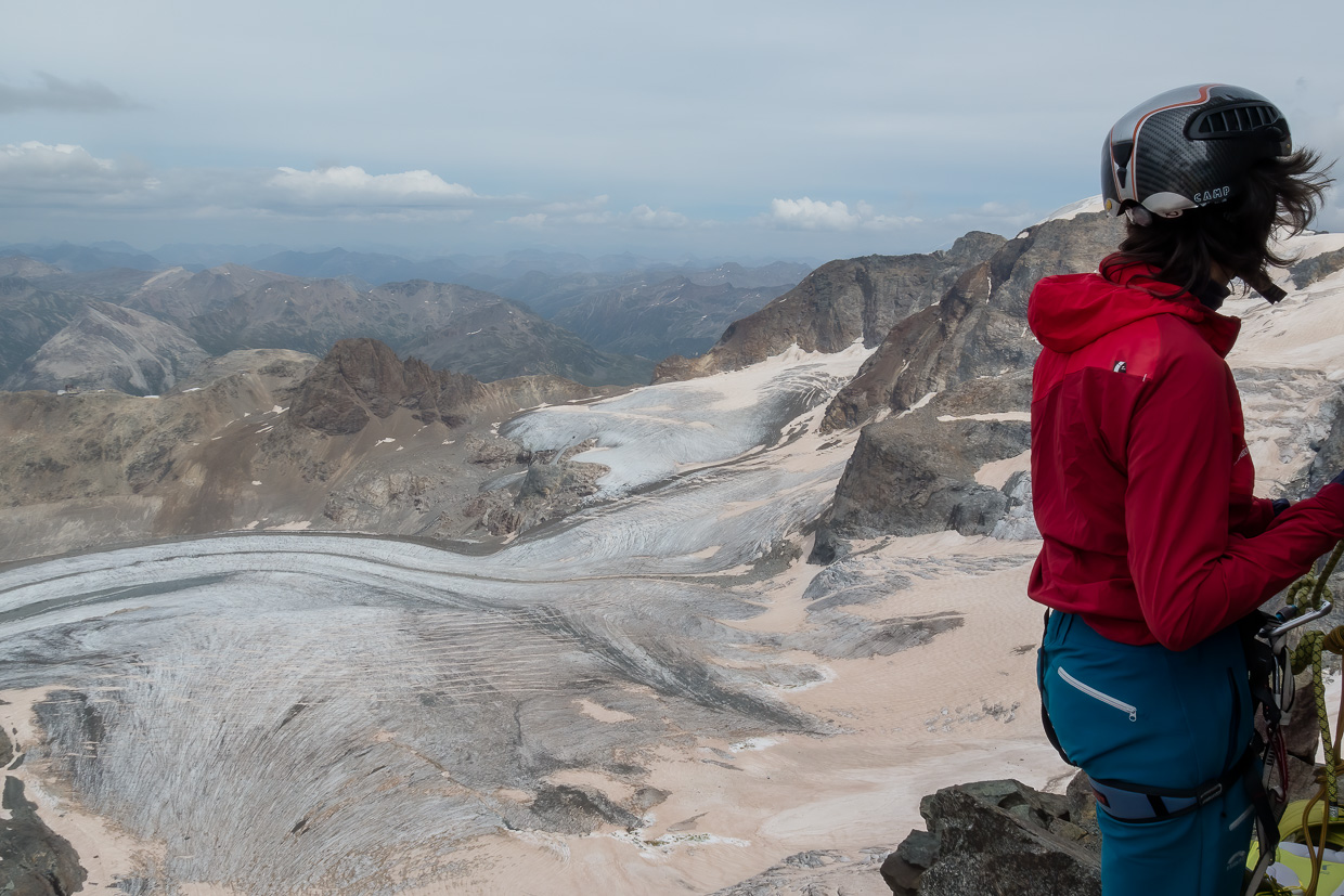 Wir erreichen die Fuorcla Bellavista und stellen von Eis auf Fels um, ein langer Blockgrat liegt nun vor uns. Wir steigen ein. Genussvoll klettern wir über die Felsblöcke, mal links rum, mal rechts rum, mal drüber. Auf dem Gipfel des Piz Spinas legen wir eine Pause ein und geniessen die Aussicht. Danach geht es kurz im Fels weiter, bevor wir wieder Steigeisen anziehen. Die letzten Höhenmeter steigen wir im Eis hoch, dann erreichen wir den Westgipfel des Piz Palü (3898 müM.). Was für eine grossartige Aussicht! Wir halten uns aber nicht lange auf, gehen weiter zum um einen Meter höheren Hauptgipfel. Der ist mit einem fussbreiten Schneegrat verbunden, links und rechts geht es deutlich in die Tiefe! In höchster Konzentration, Schritt für Schritt queren wir am kurzen Seil den Grat und erreichen den Hauptgipfel. Von dort führt nochmals eine solche Himmelsleiter zum Palü Ostgipfel.