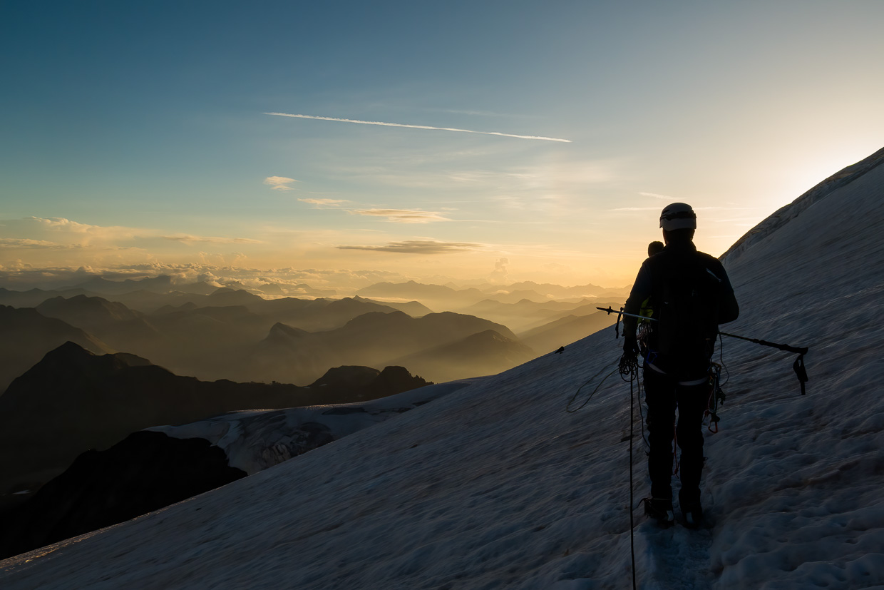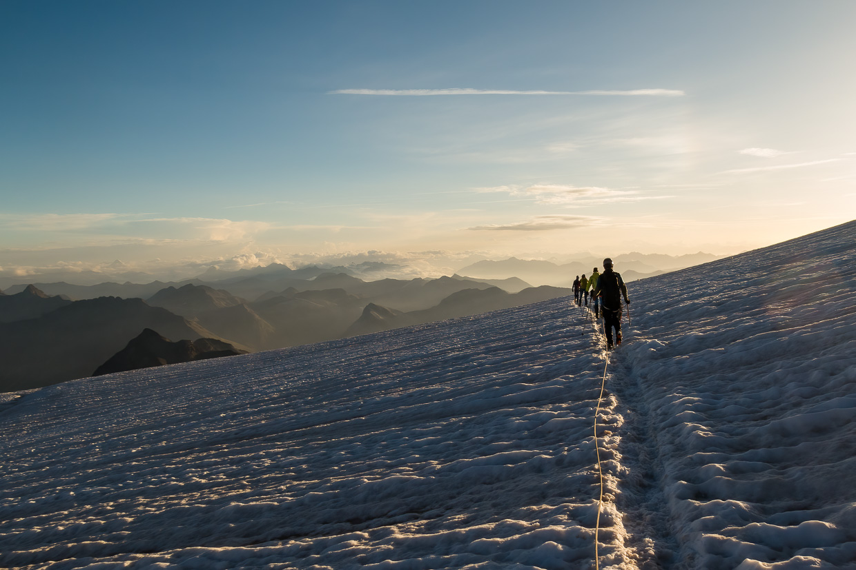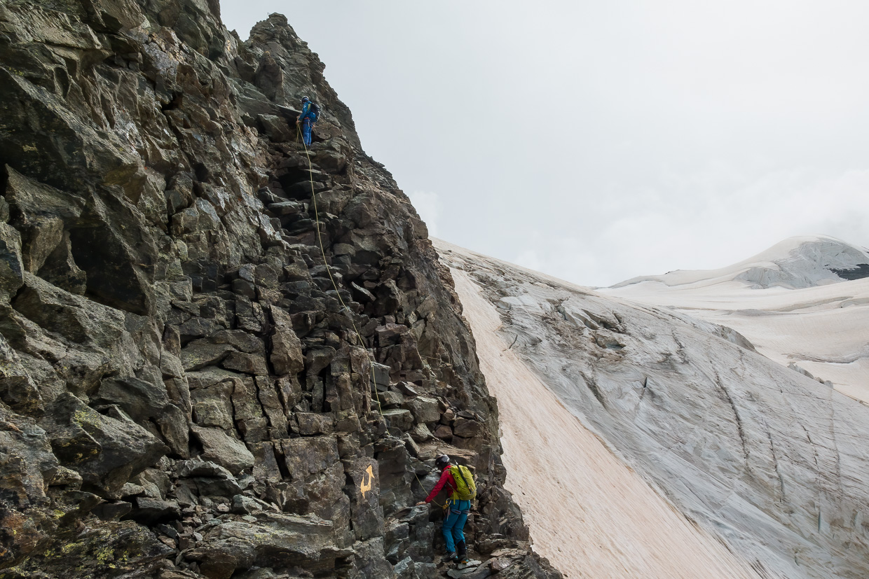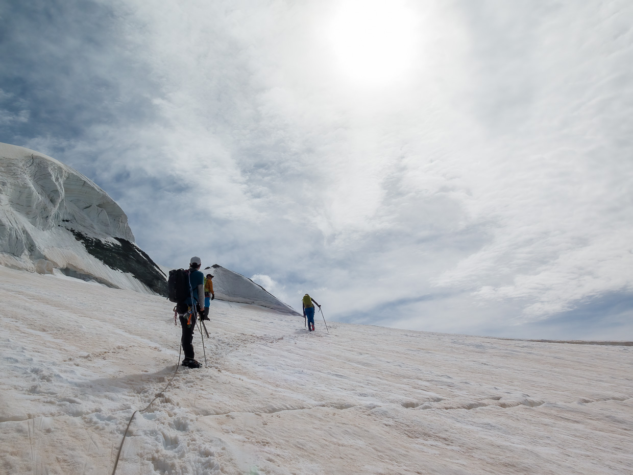 Nun heisst es klettern über den Grat. Es hat immer wieder steile Aufschwünge, schwierig ist die Kletterei aber nie. Zum Glück sind nicht viele Leute unterwegs hier, so dass wir recht schnell vorankommen. Am Ende des Grates geht es im Schnee und Eis weiter. Wir beginnen die Höhe zu spüren, vor allem die Frau. Nur langsam kommen wir voran. Wir sind nun wirklich mitten im Hochgebirge, Schnee und Eis um uns rundherum. Nerven kosten die Gletscherspalten und die Schneebrücken darüber. Wir hoffen einfach, dass sie halten. Diese zwingen uns auch, weiter hochzusteigen, um sie zu umgehen. Aber endlich haben wir es geschafft, um halb sechs am Abend erreichen wir die Hütte.