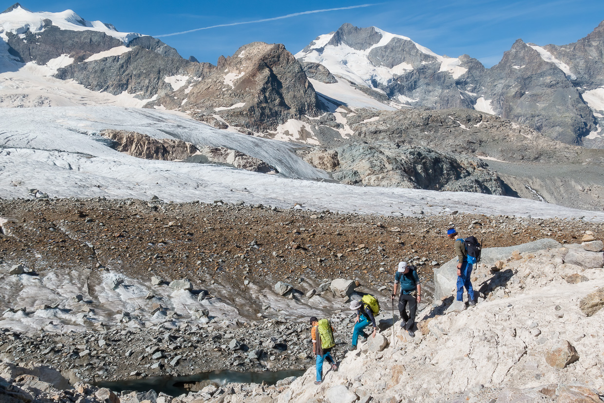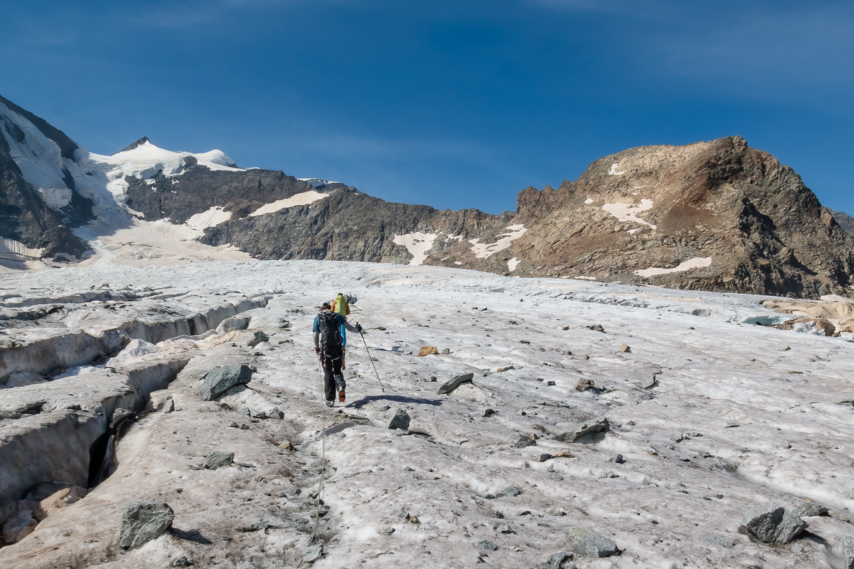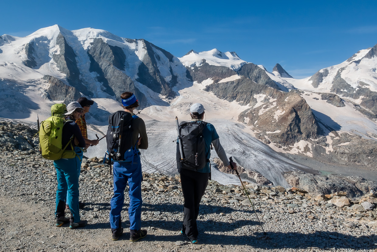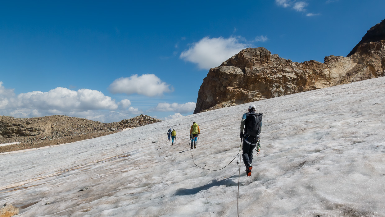 Der Start in den Tag ist früh, wir werden kurz nach fünf Uhr abgeholt. Wir haben allerdings auch noch eine lange Reise vor uns, das Ziel ist die Talstation der Diavolezzabahn. Diese transportiert uns hoch auf knapp 3000 Meter. Zuerst inhalieren wir mal das umwerfende Panorama mit dem mächtigen Piz Palü und dem höchsten von allen, dem Piz Bernina, jedenfalls in den Ostalpen ist er mit seinen 4048 Metern der höchste. Danach starten wir zum Hüttenaufstieg. Was gemütlich tönt, ist hier alles andere als einfach und eine komplette Tagestour mit Gletscher und Klettern, denn ohne Gletscherquerung kommt man nicht in die Marco e Rosa-Hütte auf der italienischen Seite. Wir steigen die Moräne ab, auch der Persgletscher wird nicht von der Klimakrise verschont und schmilzt vor sich hin. Die Frau und Fabian bilden eine Seilschaft, ich eine mit Role und Beni. Wir kennen uns schon über dreissig Jahre und verstehen uns bestens, wenn’s sein muss auch ohne grosse Worte. Da der Gletscher aper ist, geht die Querung ziemlich gut. Wir erreichen die Fortezza, steigen dort durch Schutt hoch auf den Grat.